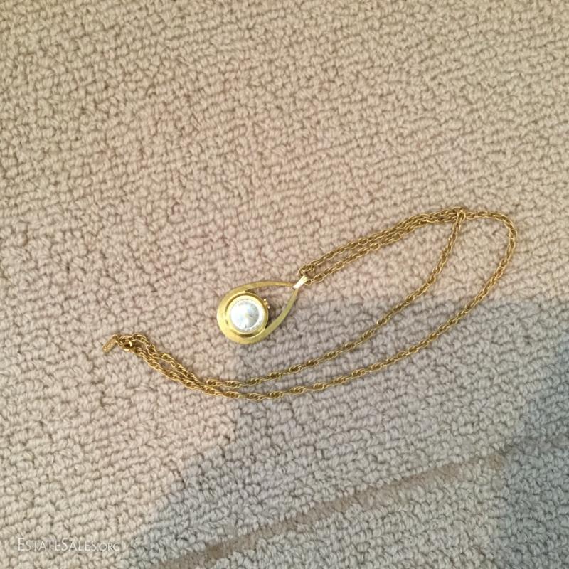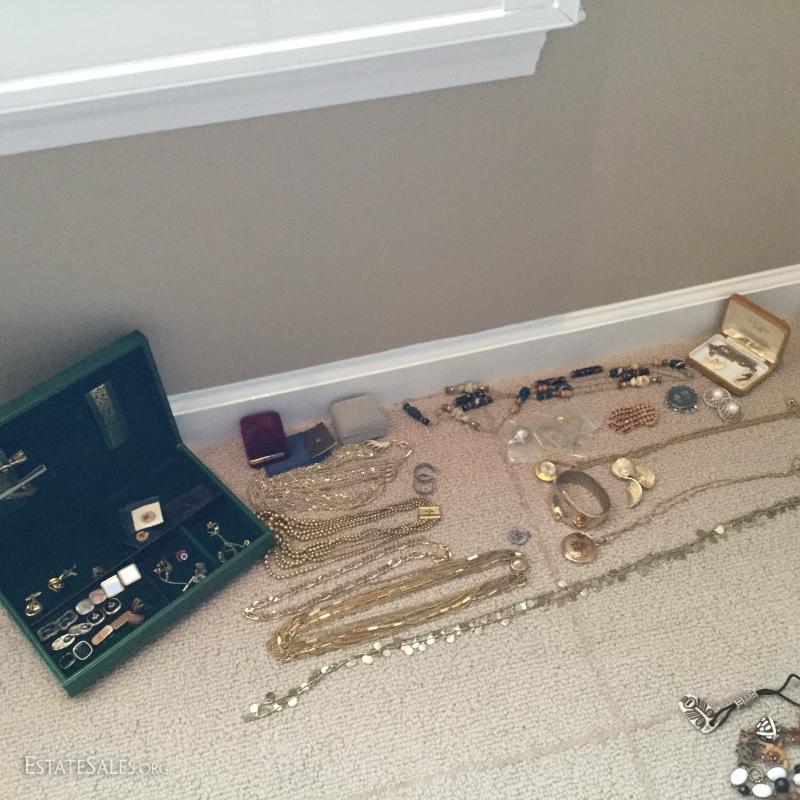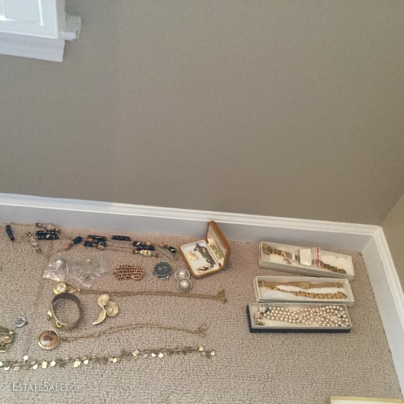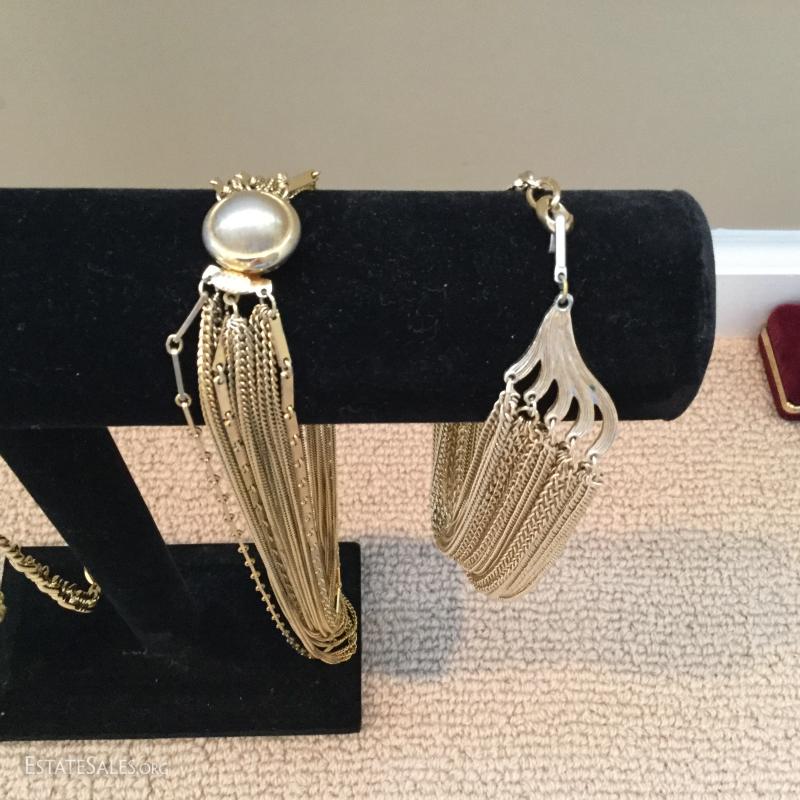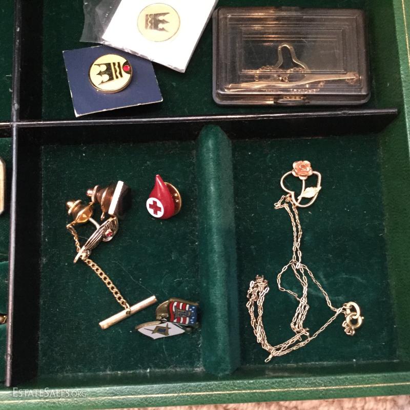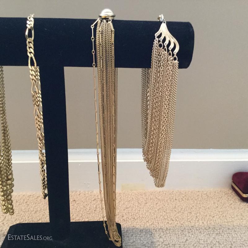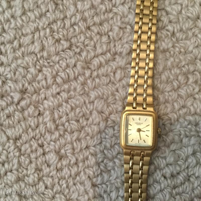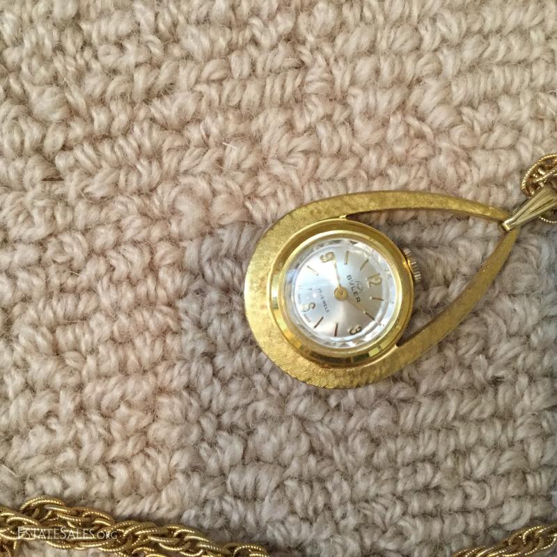 Gold necklaces, earrings, watches, pins, rings and bracelets. Watch necklace by Buler 17 Jewels. Wrist watch by Caravelle. No visible markings regarding gold content on any items in lot. See photos for details.