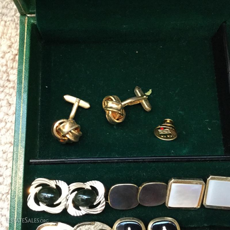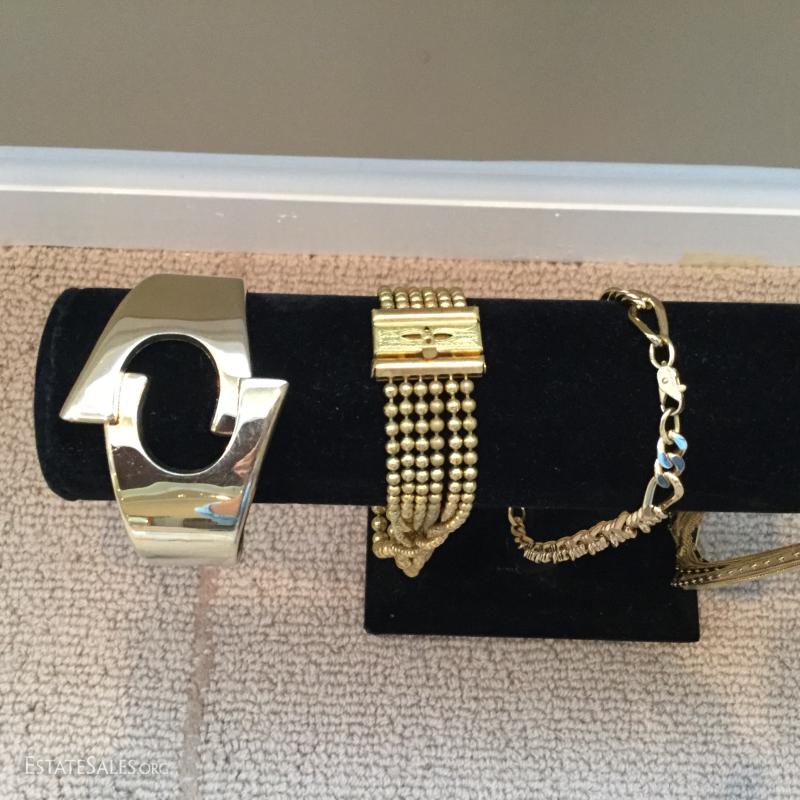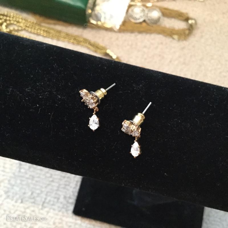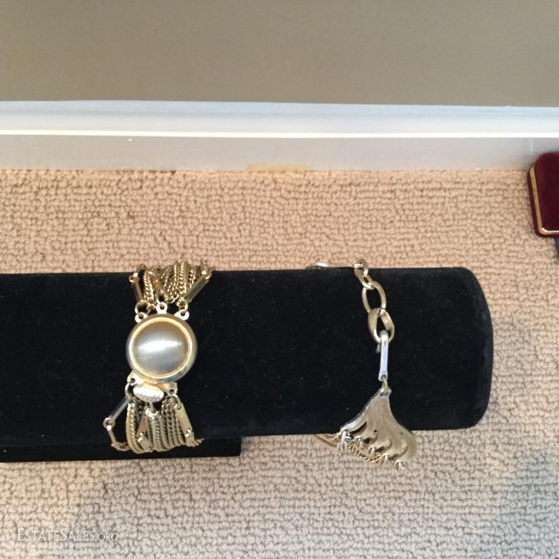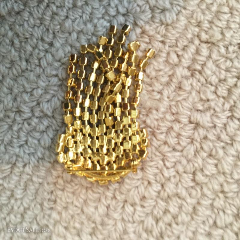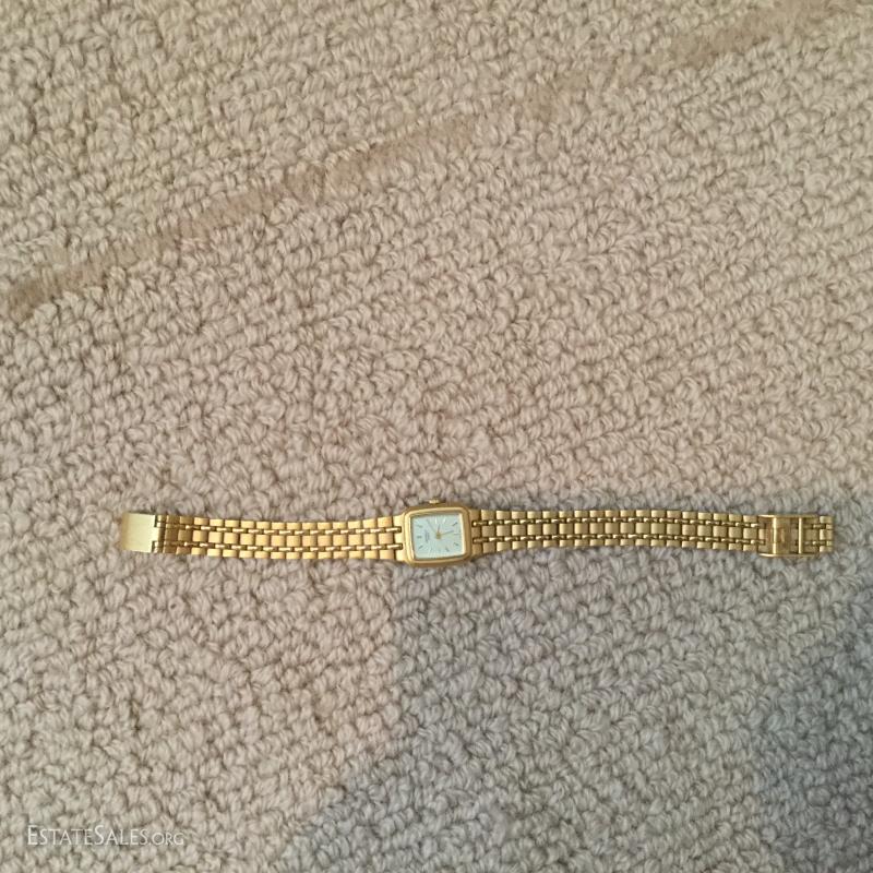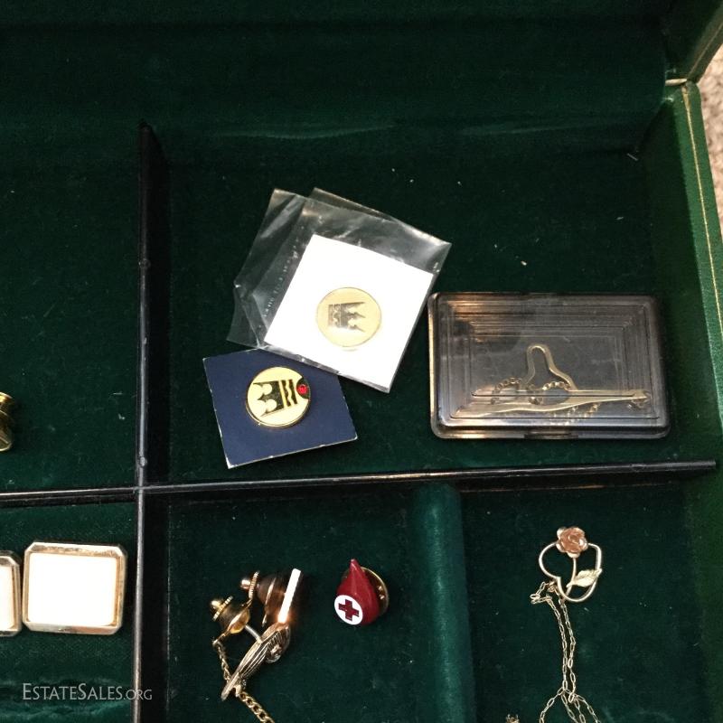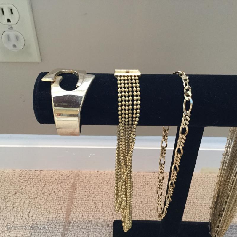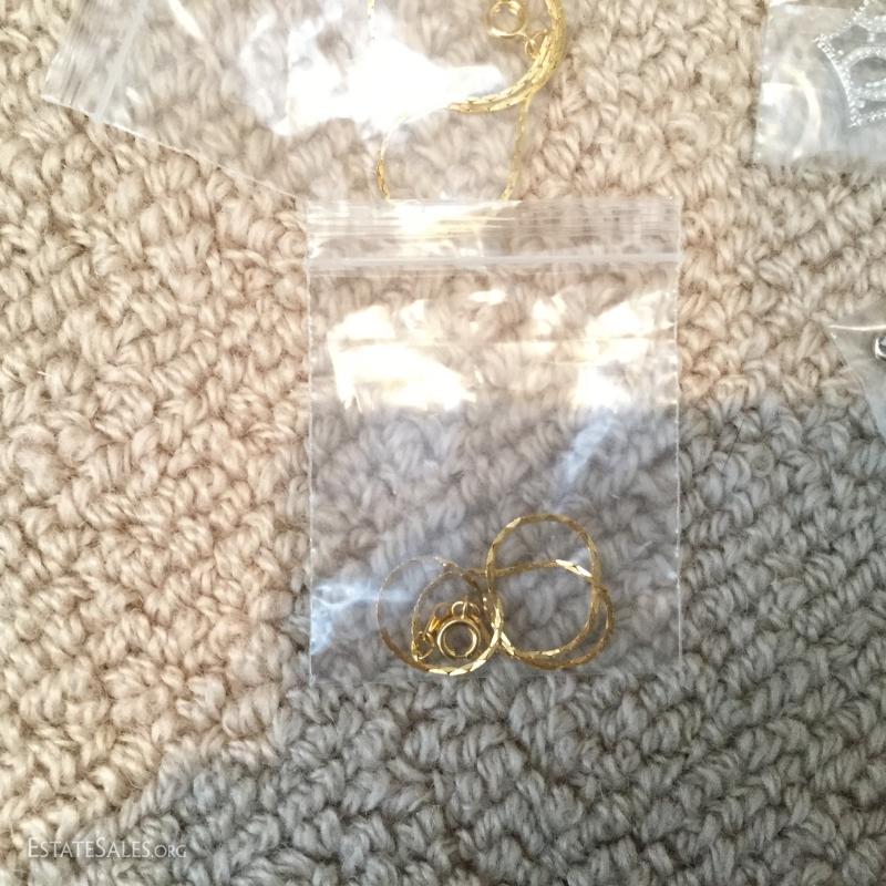 Gold necklaces, earrings, watches, pins, rings and bracelets. Watch necklace by Buler 17 Jewels. Wrist watch by Caravelle. No visible markings regarding gold content on any items in lot. See photos for details.