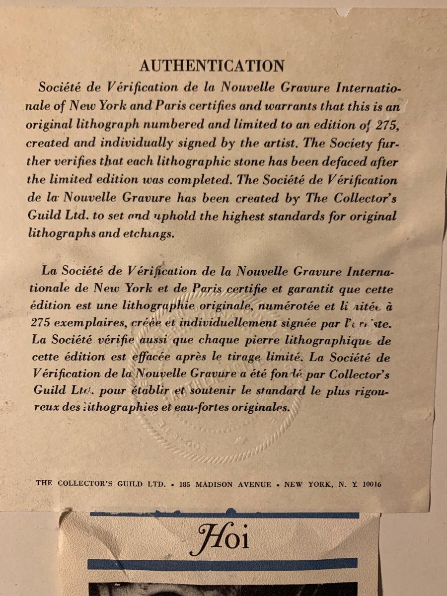 #274/275. Numbered in lower left. Signed in lower right. Includes Certificate of Authenticity from the Societe De Verification De La Nouvelle Gravure Internationale. Frame size if 30" x 24". Art size is 22" x 16"