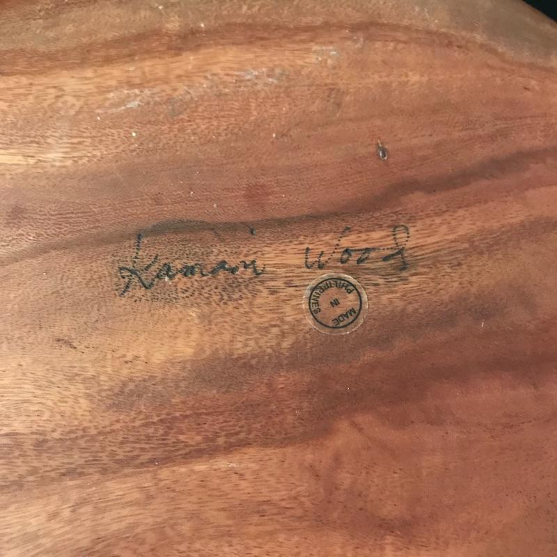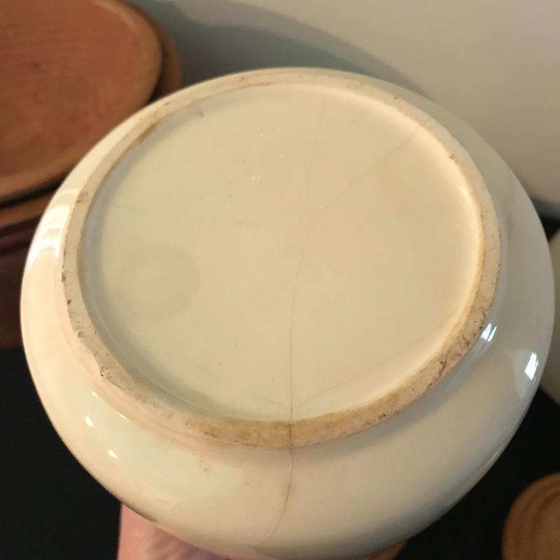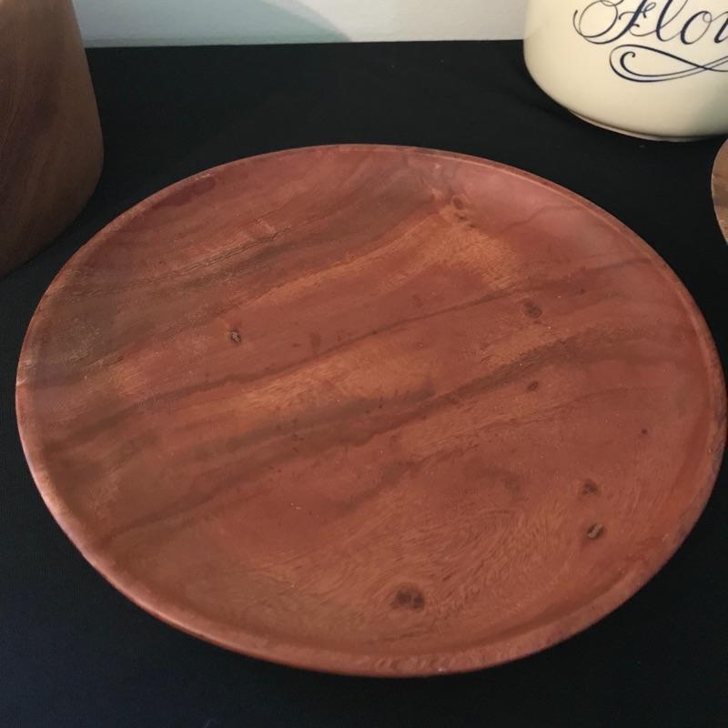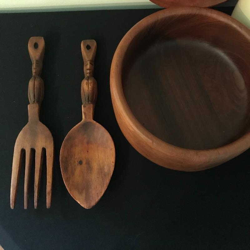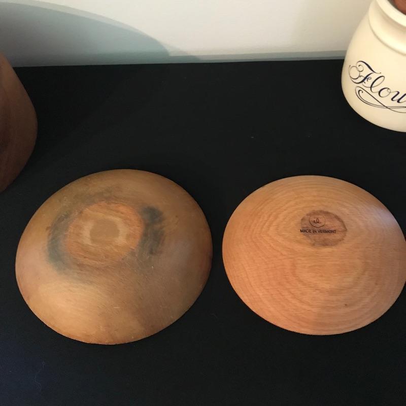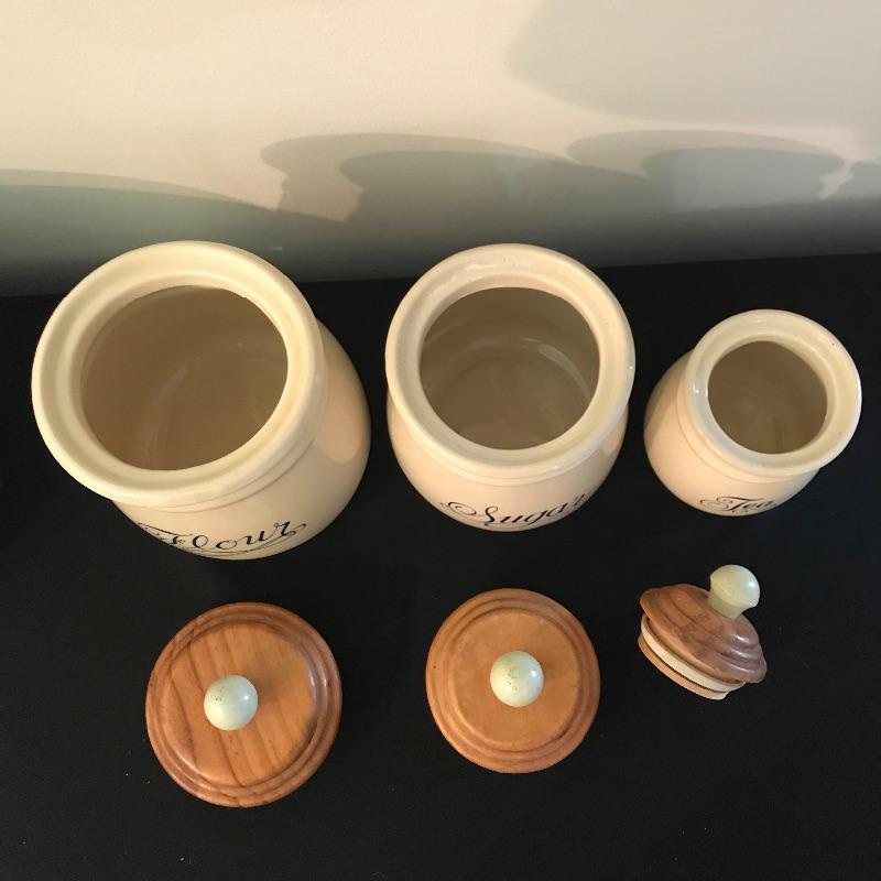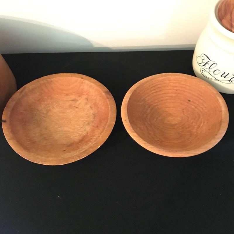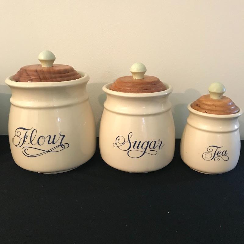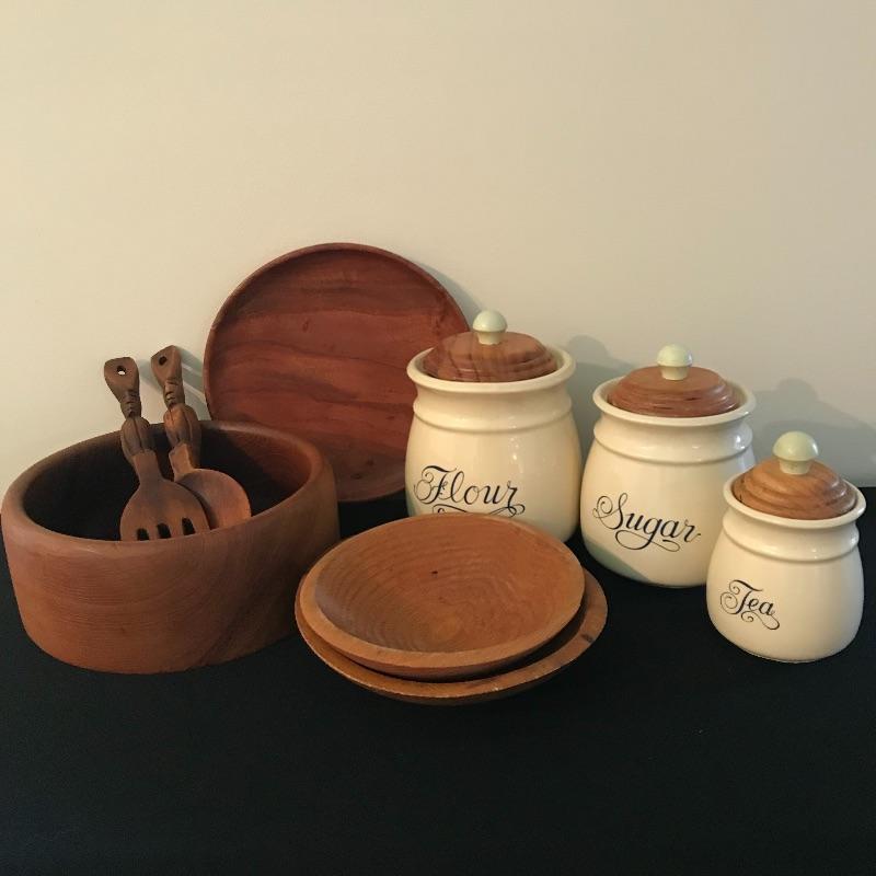 Great collection of wooden pieces for your dining room. Two possibly hand carved carved serving utensils, three bowls and one signed plate. The large wooden bowl is in very nice condition and measures approximately 9.75”d x 4”. Also included in this lot are three lovely canisters labeled Flour, Sugar, and Tea that complement the bowls with their wooden tops.