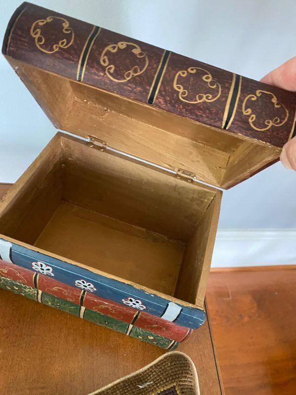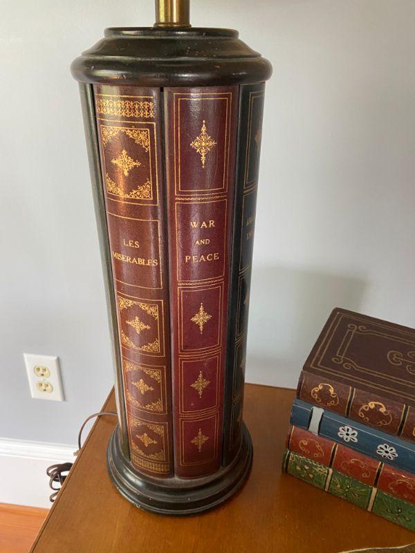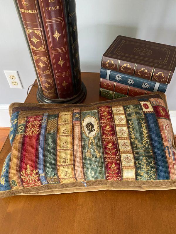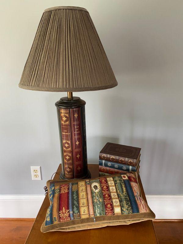 This 3 piece lot is a lamp, needlepoint pillow and a covered box all with a library book theme.