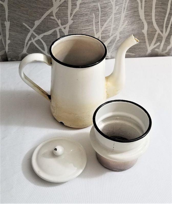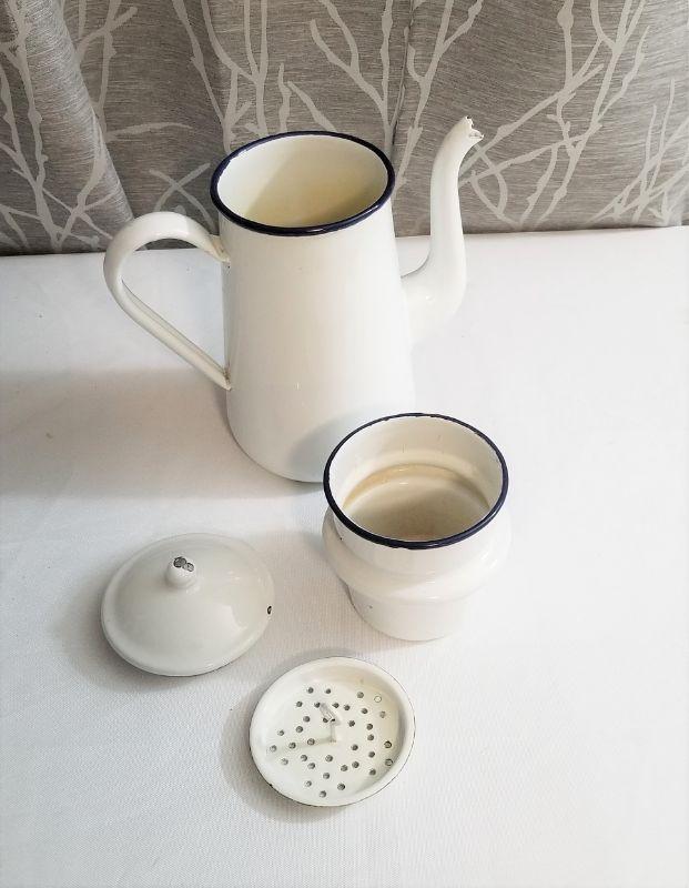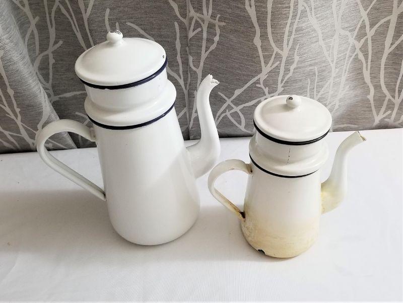 Two old French drop coffee pots here - enamel. Larger one has all the interior parts - measures 10" tall. Other is 7.5" inches tall and has been "well loved."
