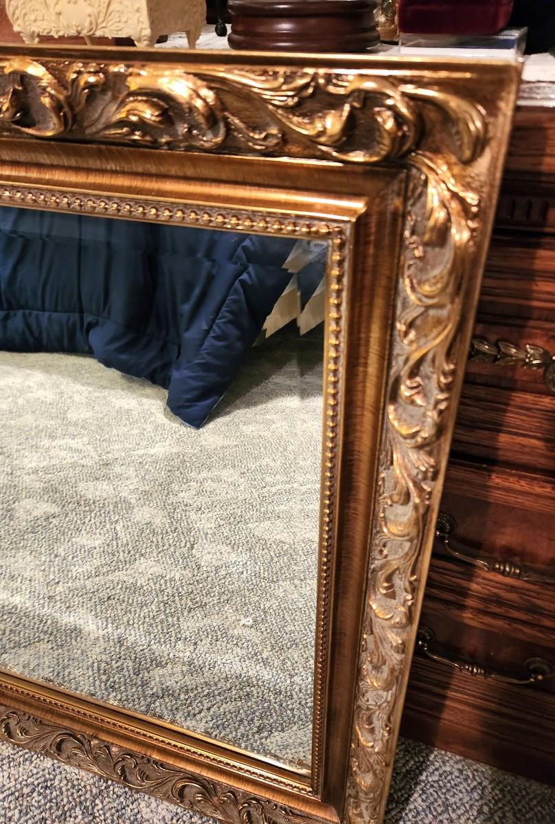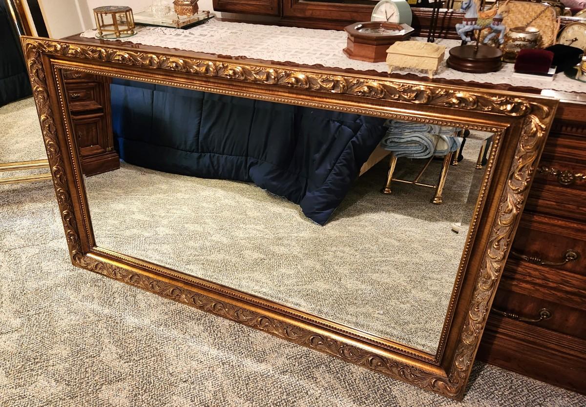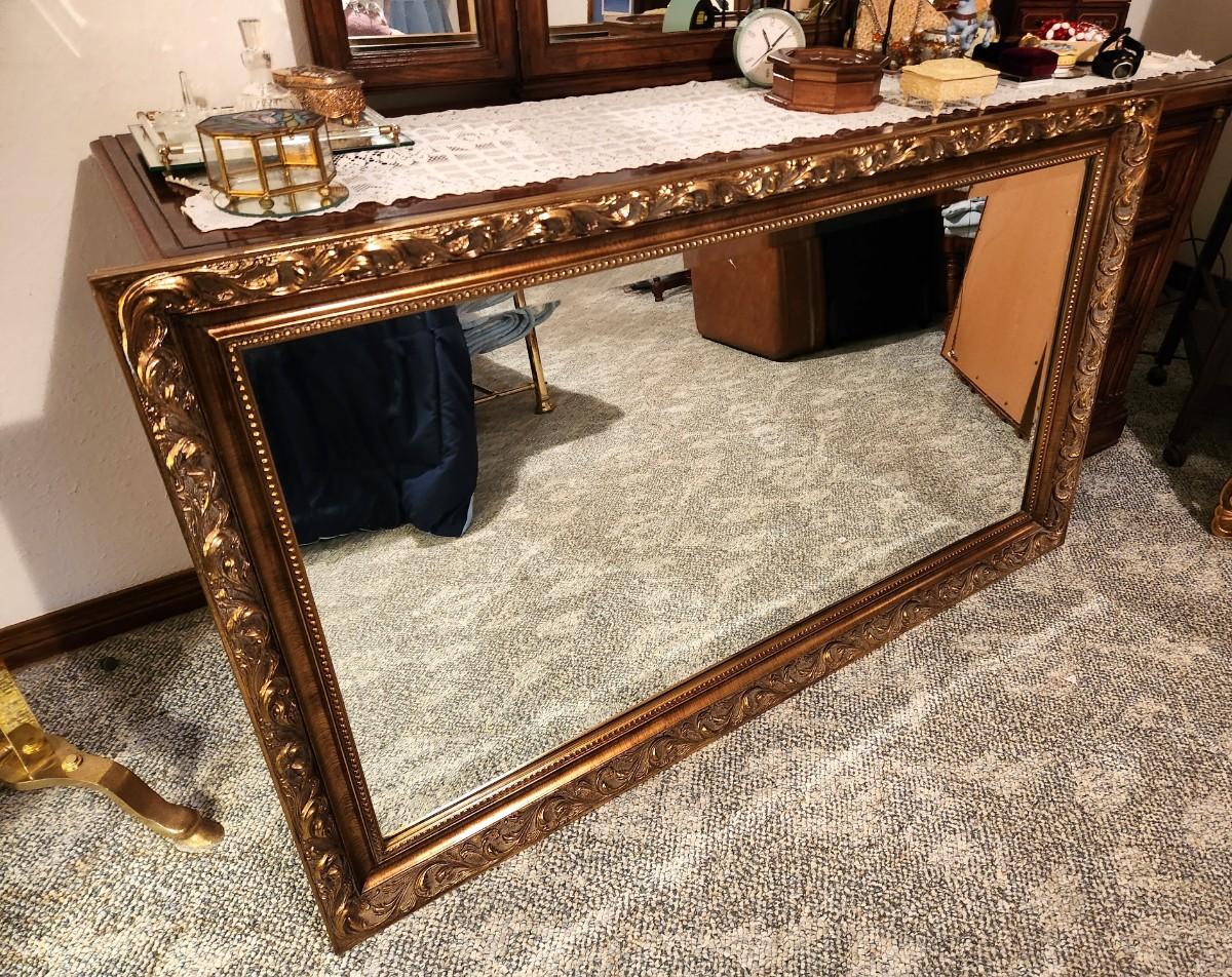 Nice HEAVY Beveled Wall mirror with 3-inch border. Good Condition. 56.5" across, 32" tall.