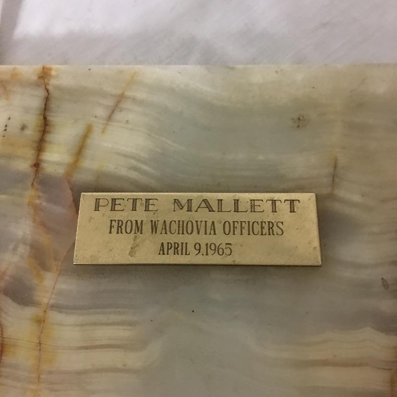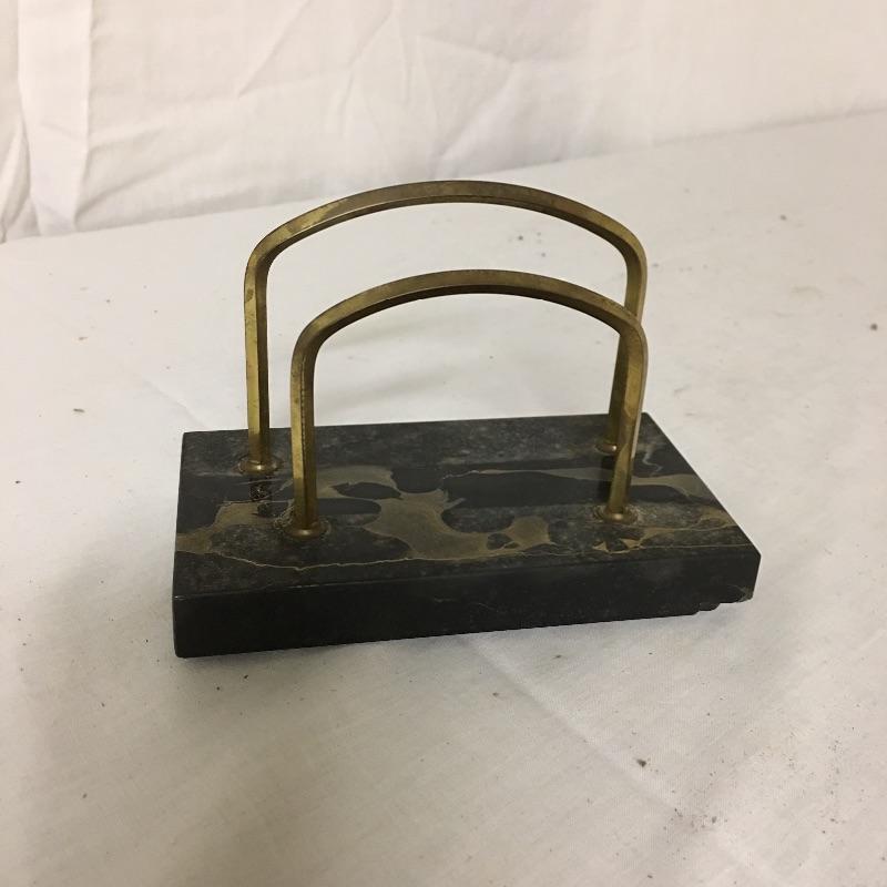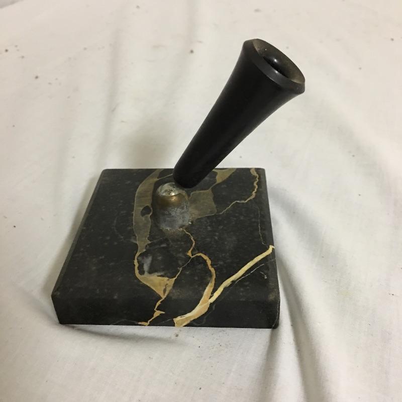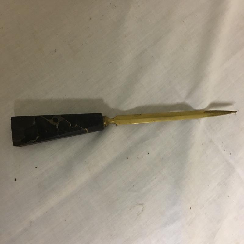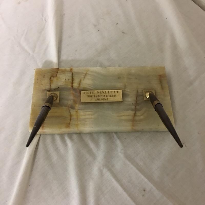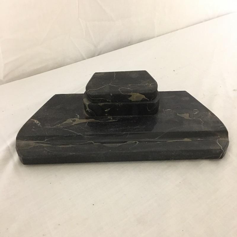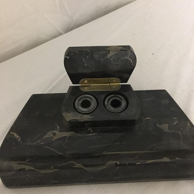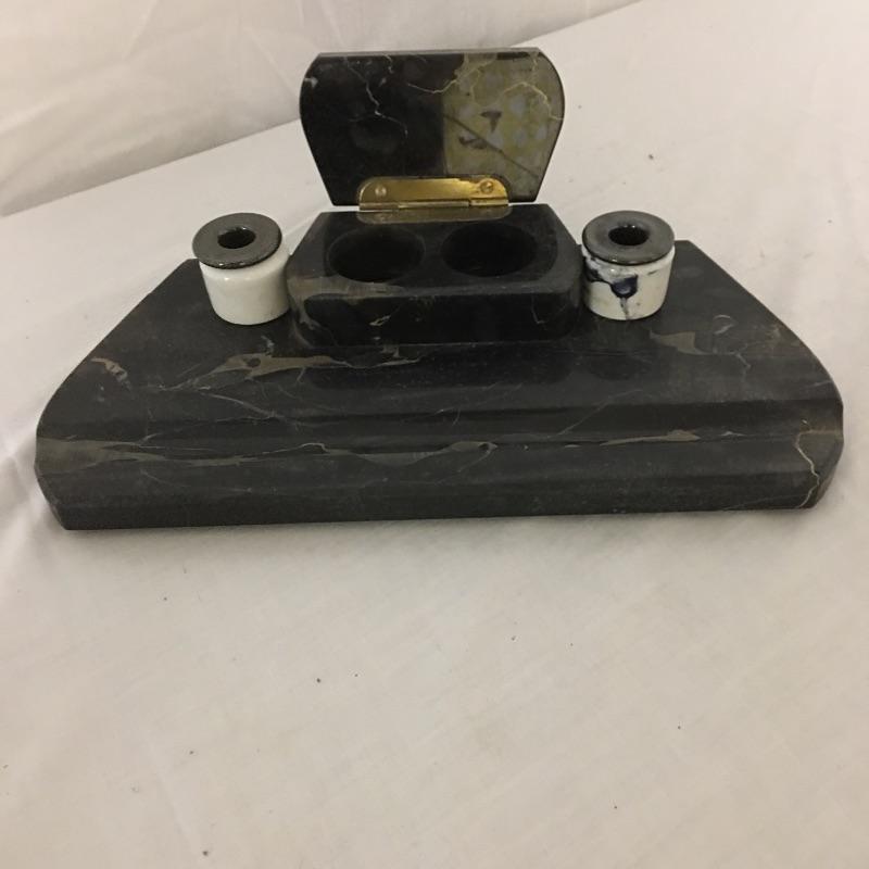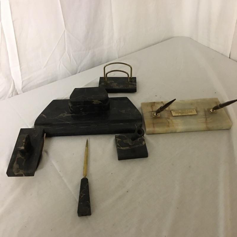 Marble desk accessories includes dual fountain pen holder, single pen holder, letter holder, letter opener, dual inkwell with slot for pens and more. Change out the name plate and make it your own!