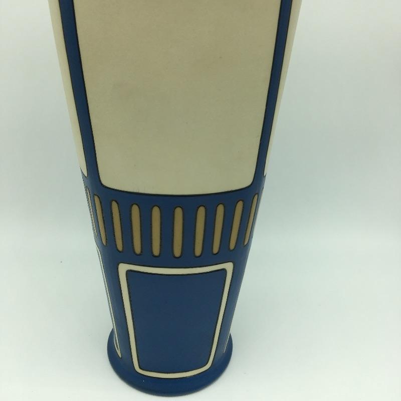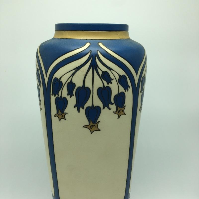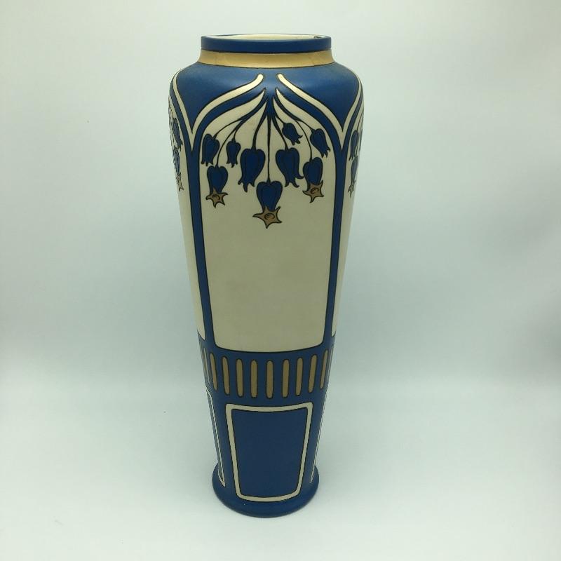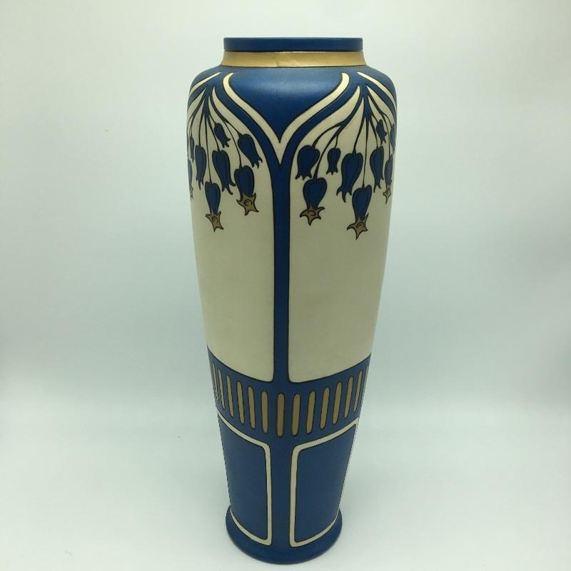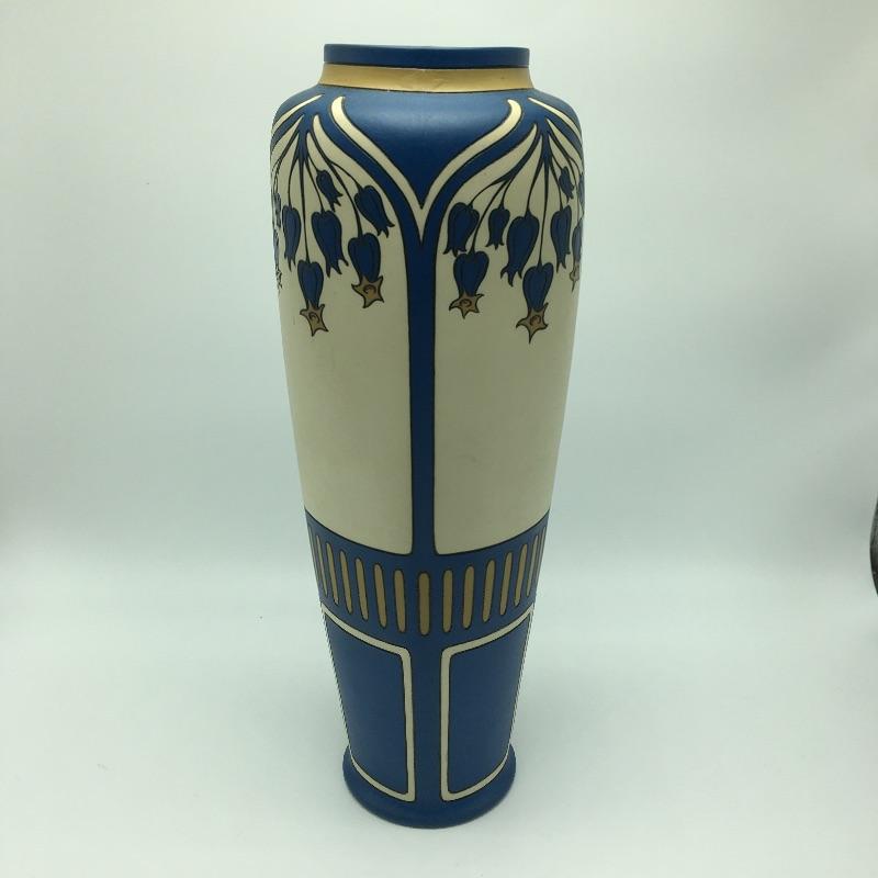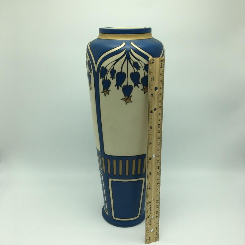 Art Nouveau Mettlach Villeroy & Boch Vase #2913. The etched stoneware bears a pattern often referred to as Bluebells: a motif of flowering trees and patterned lines in blue, cream and ochre. the bold color schemes of this intriguing tall vase. Vase measures 14” tall with a 5”D.