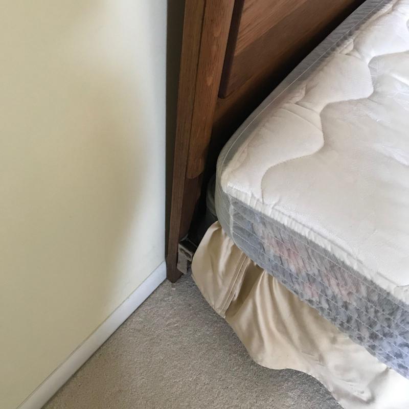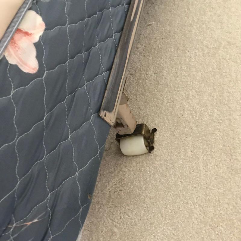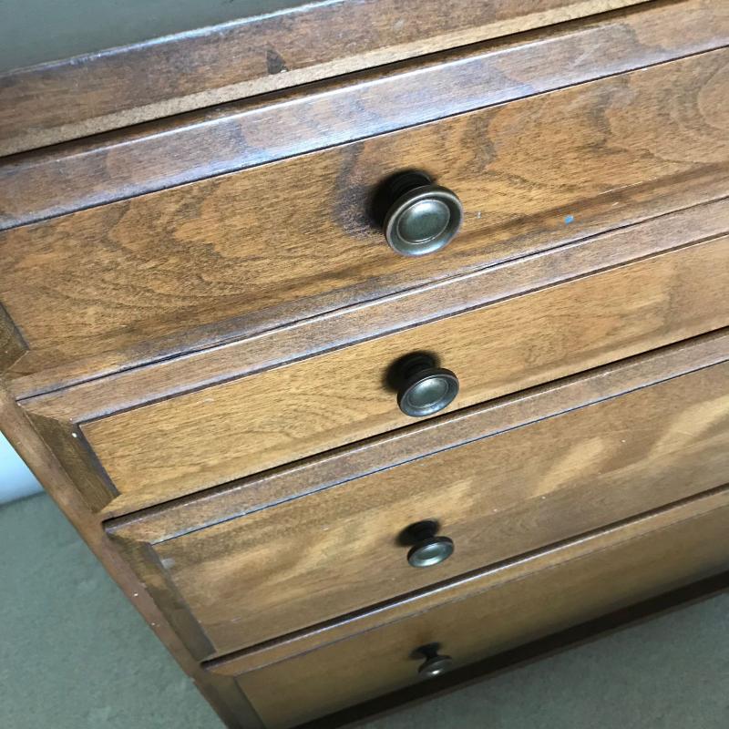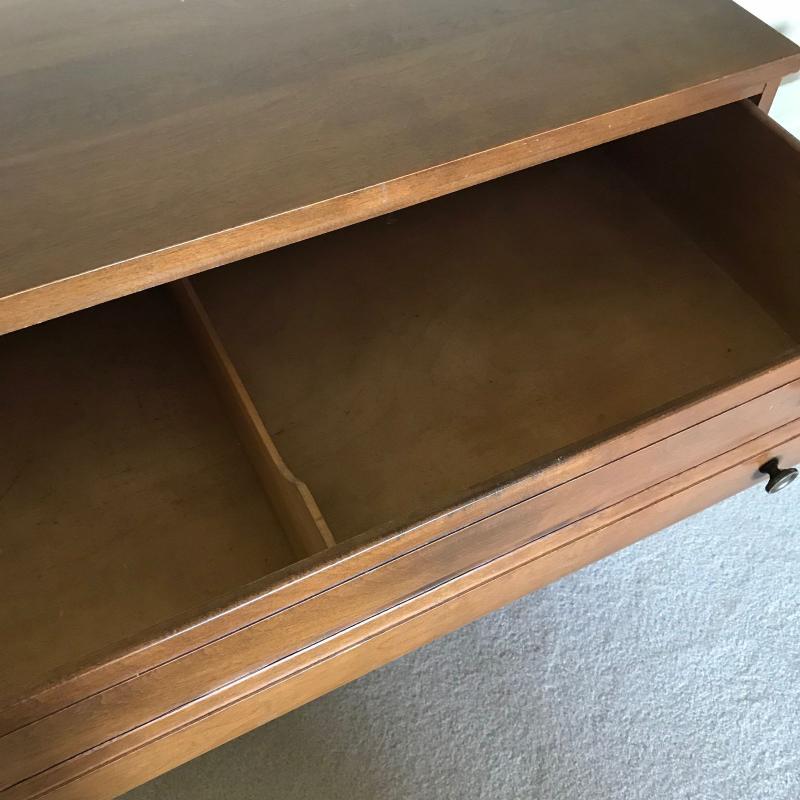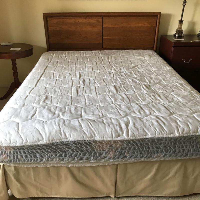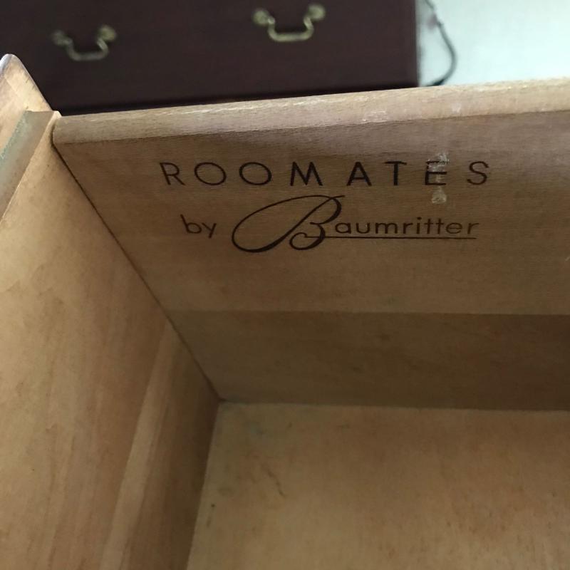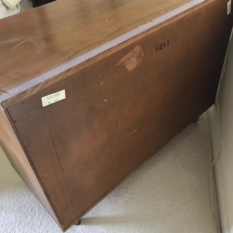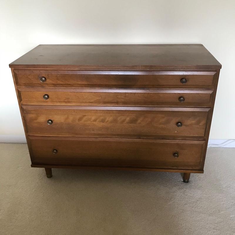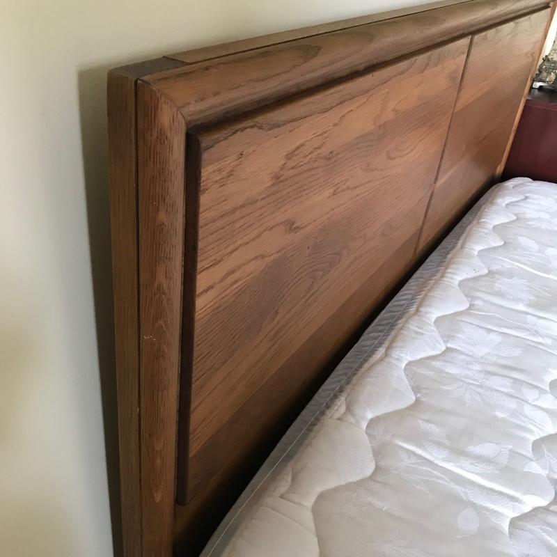 Three Drawer MCM Dresser by “Roomates by Baumritter”. Large drawer space and great Mid Century legs. In good condition. A couple scuffs on top. Measures 40” x 17” x 30” Lot also includes a wooden headboard measuring 60” x 42”h. Comes with metal bed rails. Mattress can be included for free to the buyer. No shipping. Please note, this lot is upstairs. Please bring tools to dismantle bed and help to load in your car.