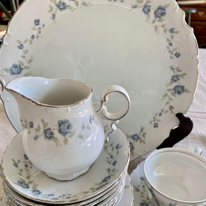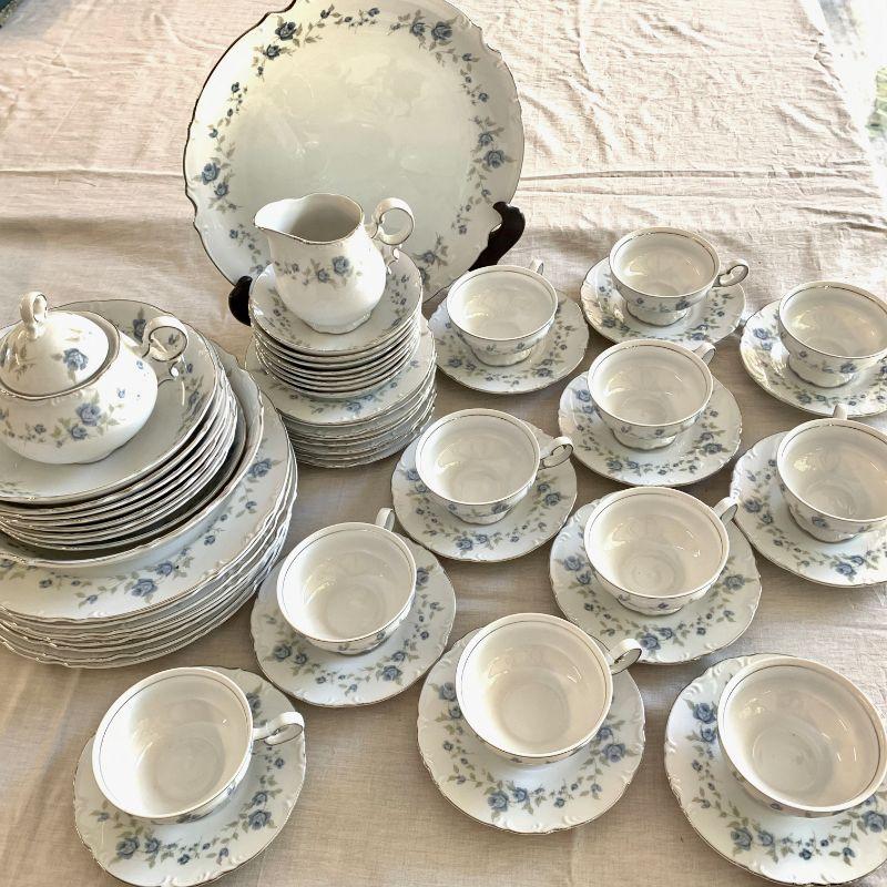 Very pretty Mikasa fine china. Dainty blue rose pattern on white porcelain. Service for 8 plus extras.