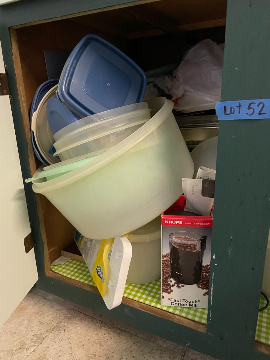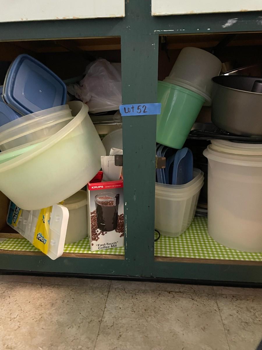lot 52- Misc. kitchen items, tupper ware, pans