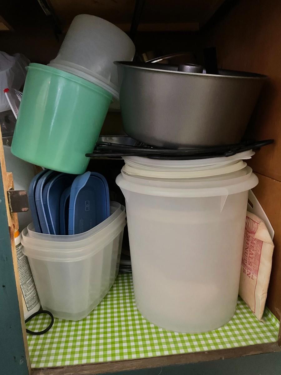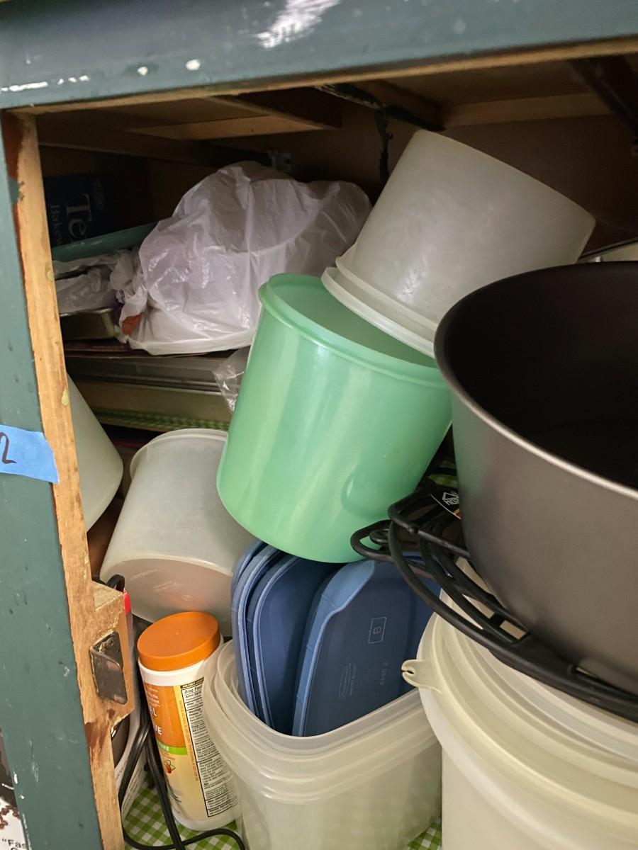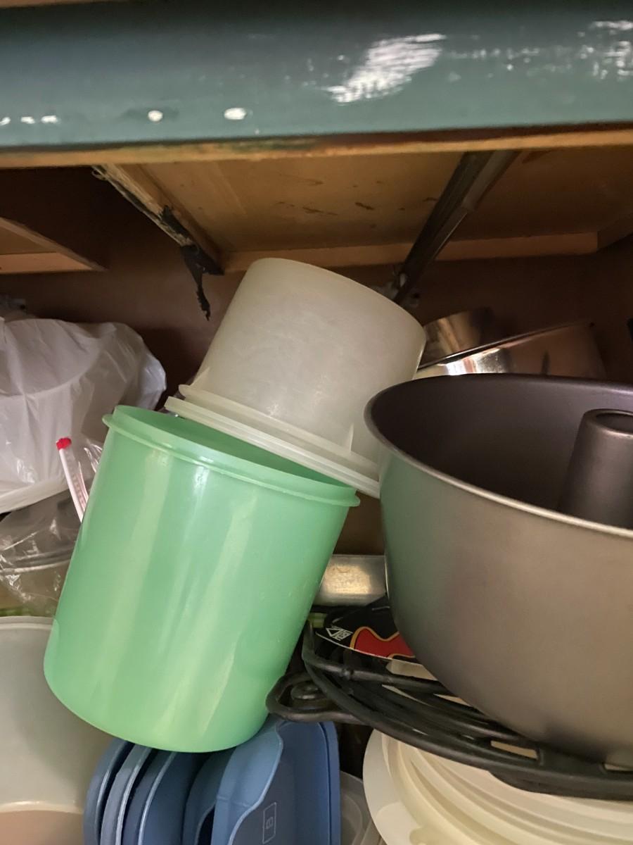 Misc. kitchen items, tupper ware, pans.