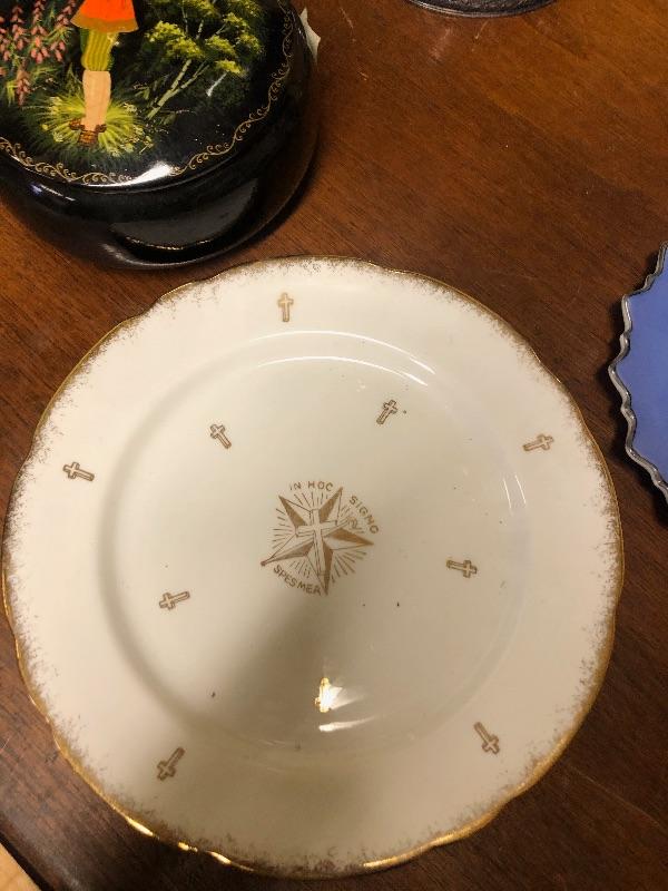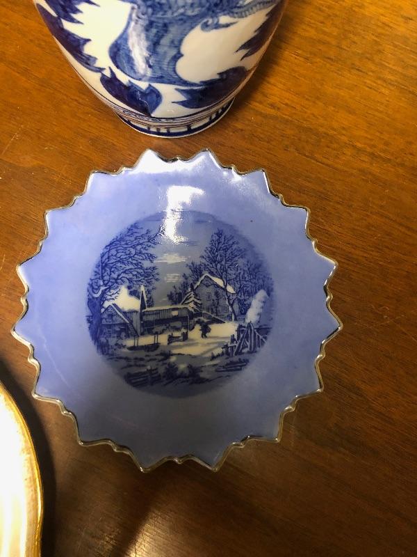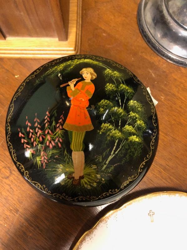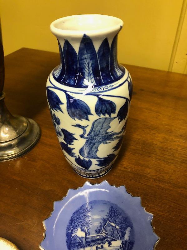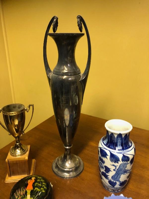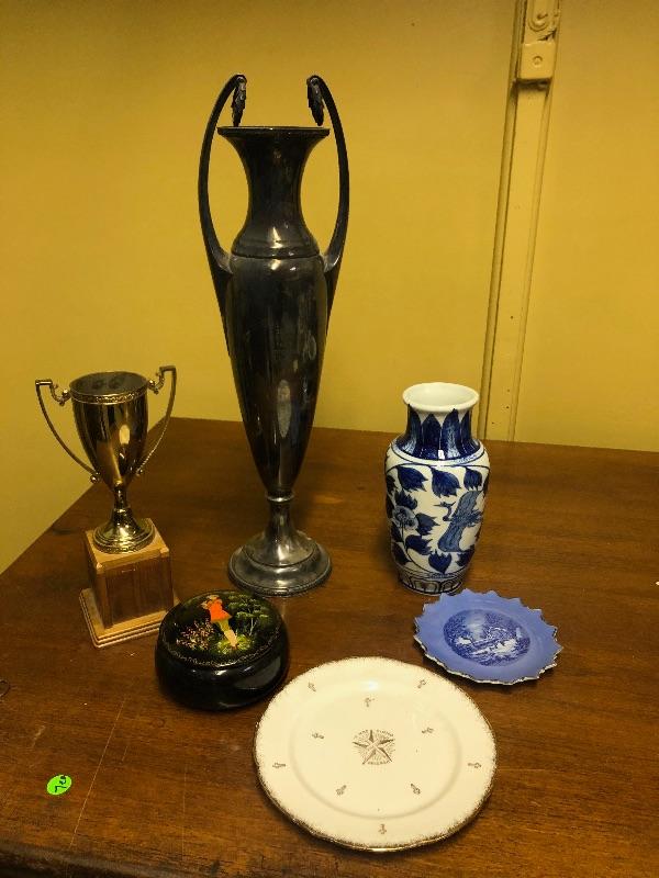 Mixed lot- trophy, larger silver plate vase, blue Asian vase, painted trinket box, :Vintage used condition