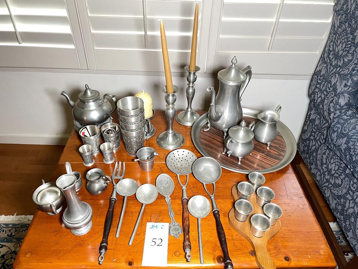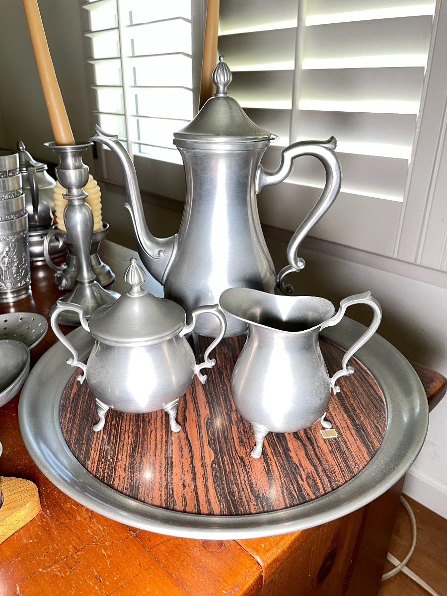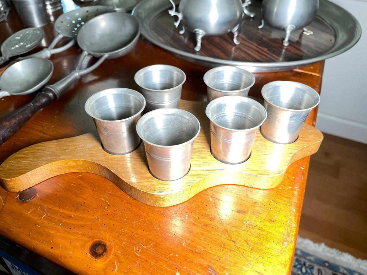 Includes coffee set on tray, candlesticks and candles, 6 small cups on wood serving paddle,