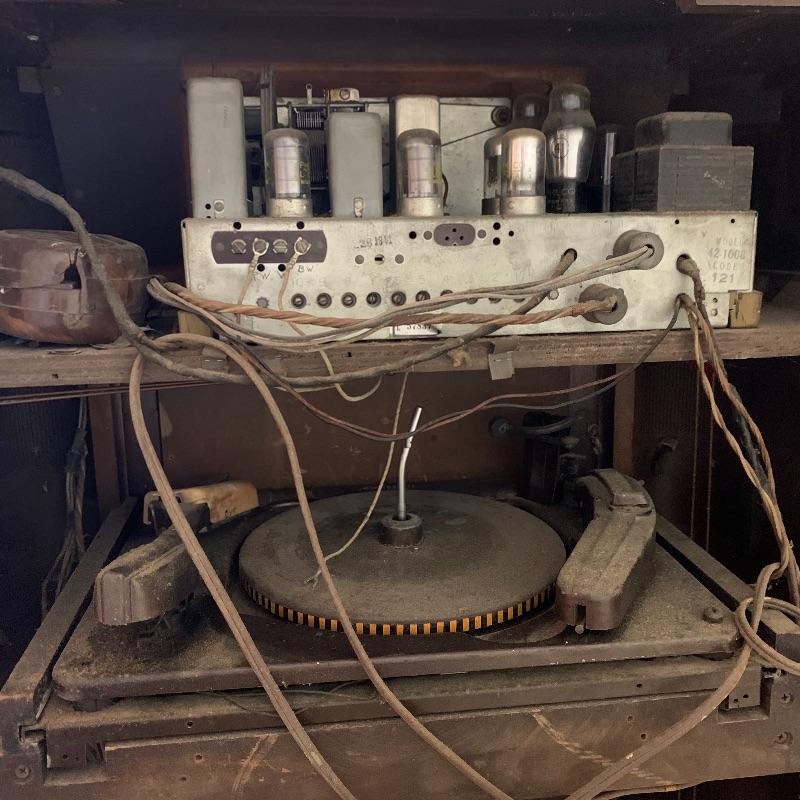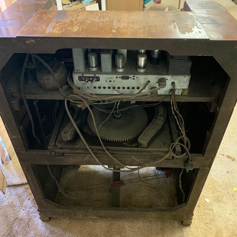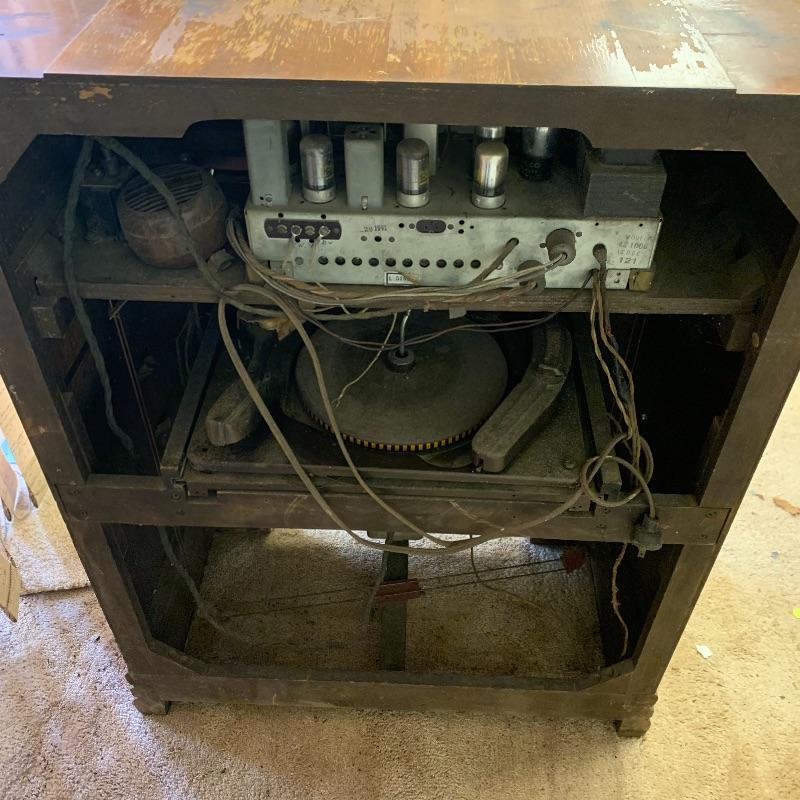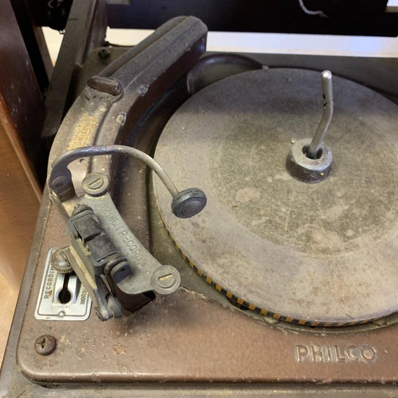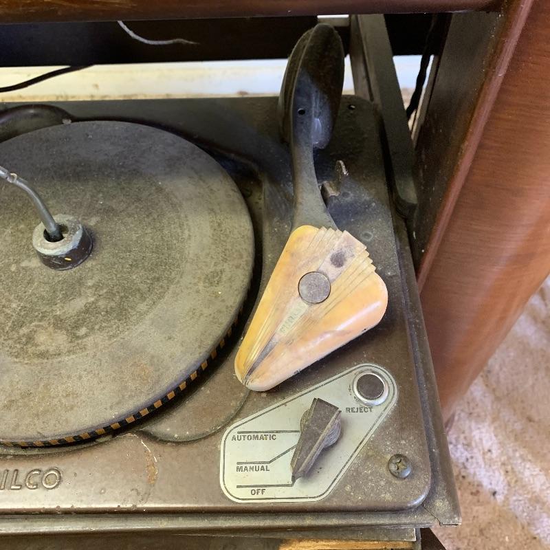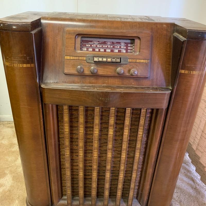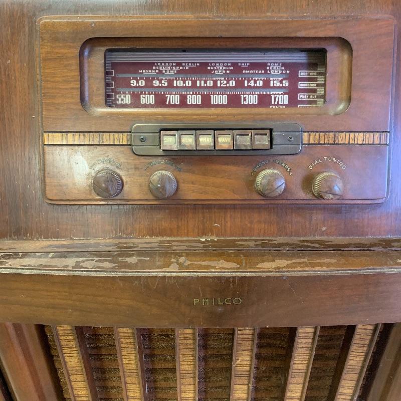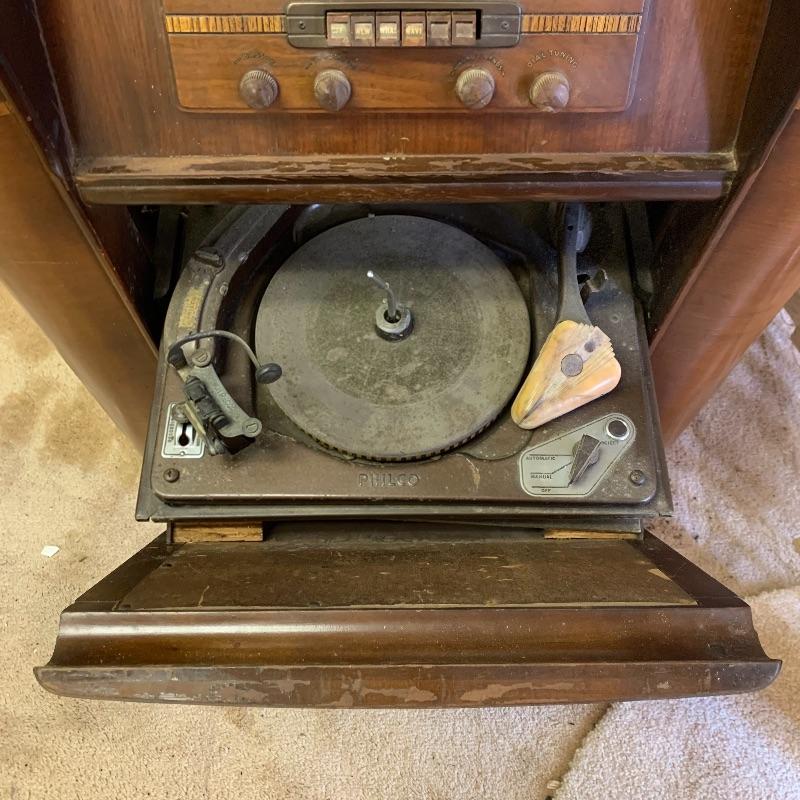 Philco Radio Phonograph Model 42-1008 Code 121. A very neat looking wooden radio phonograph that appears to have been used and loved for many years. The finishing is worn, but it is still in solid condition (not loose or falling apart). Does not power on when plugged in, perhaps needs rewired. Measures 14.5” x 28.5” x 38”.
