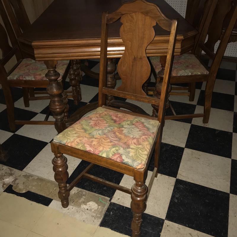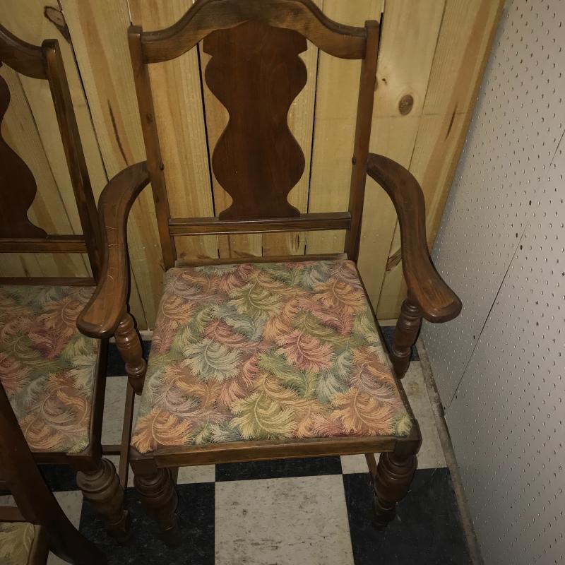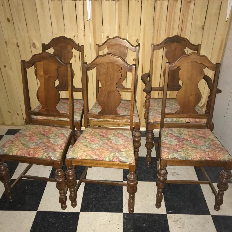 One arm chair and 5 straight back chairs. Arm chair measures 20” x 17” x 39” and straight backs are 18” x 17” x 39”. These chairs match the dining table, china cabinet and side board in lots 50, 52 and 53. Lot is available for local pick up in Maggie Valley, NC only.