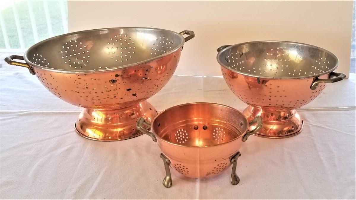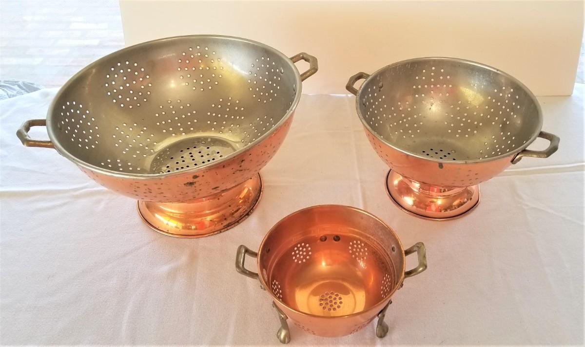 Nice grouping of three copper colanders - the medium sized one has a dent to the base. Largest is 6.5" tall, 12" across, medium is 5.5" tall, 9" across, and small is 3.5" tall, 6" across.