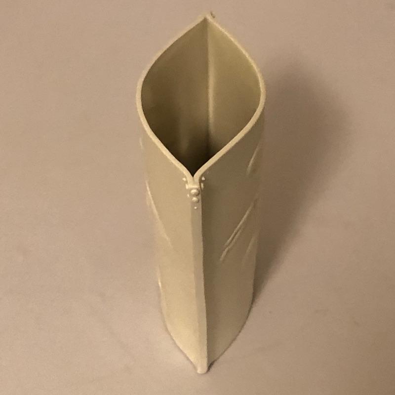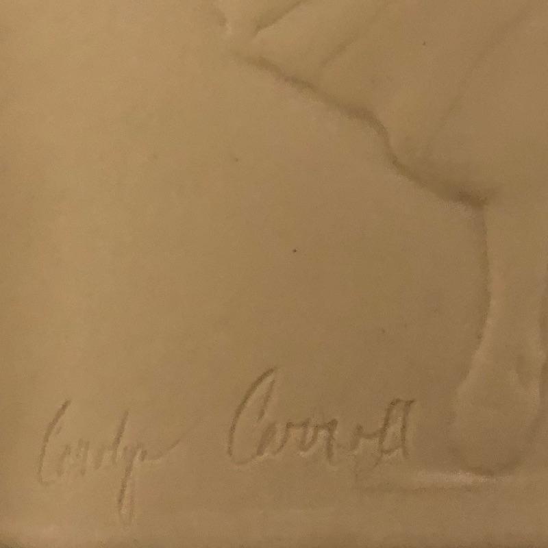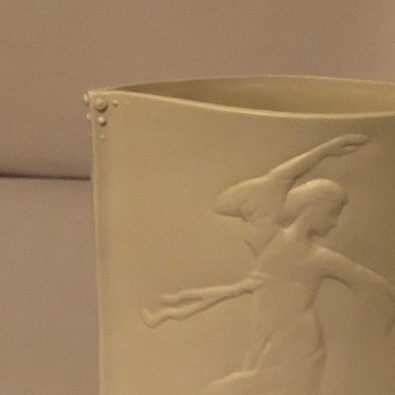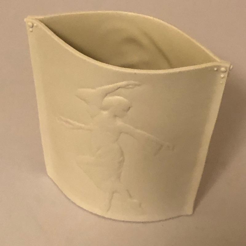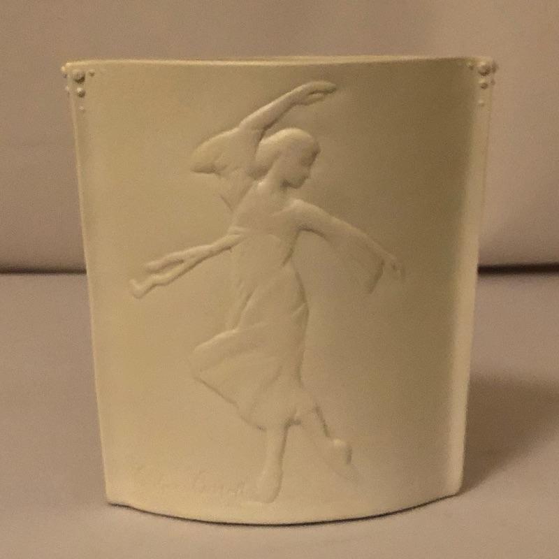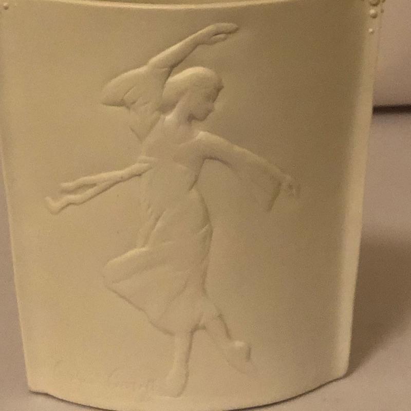 Gorgeous signed Carrol vase. Rich decorative detail is depicted in the pieces front of a dancer. The inside is glazed and the piece is an ivory ceramic.