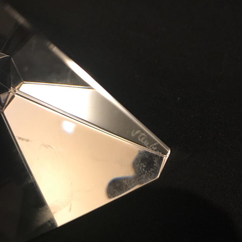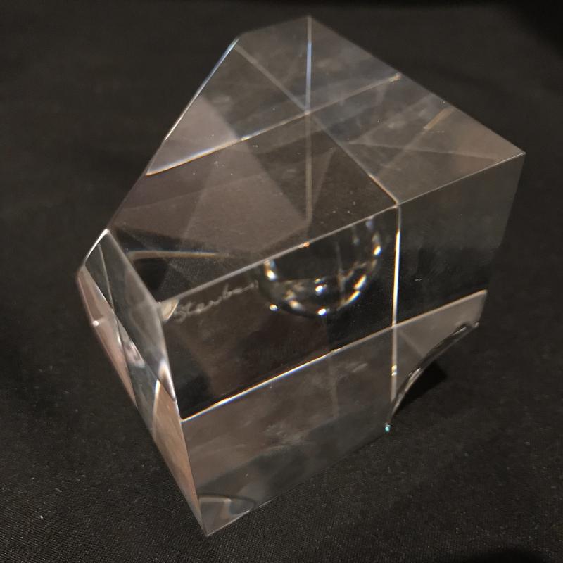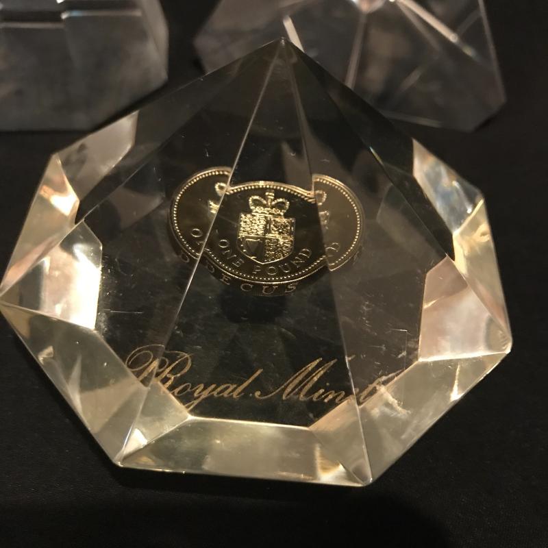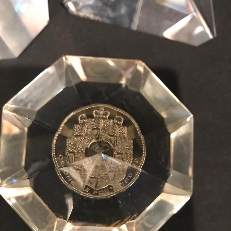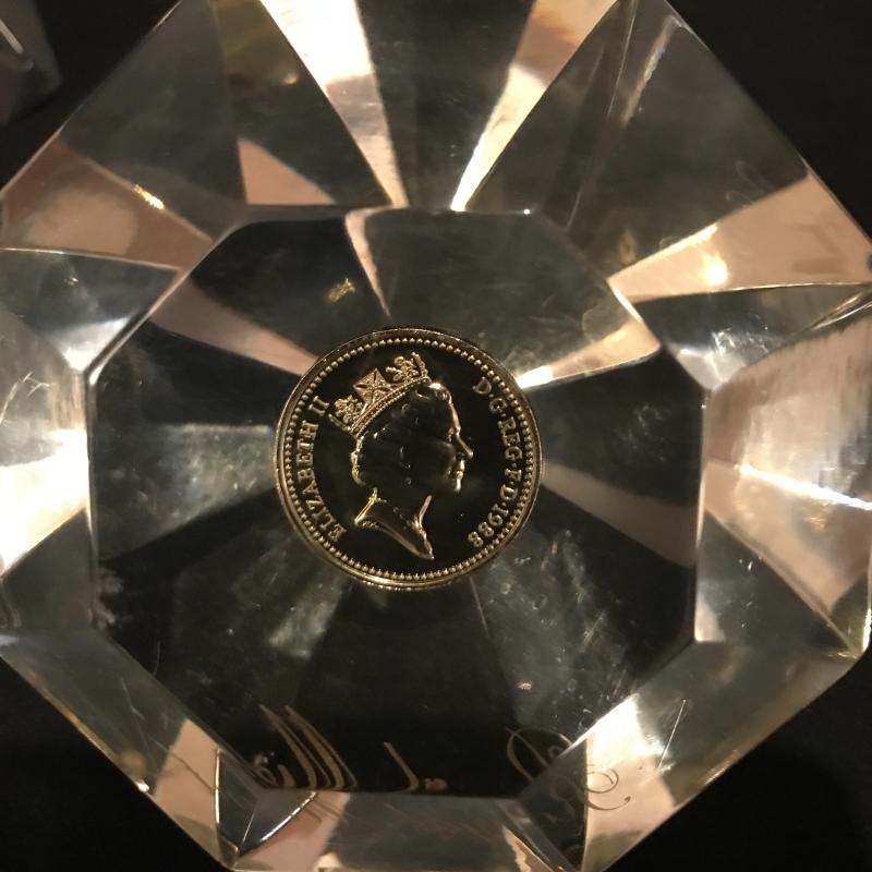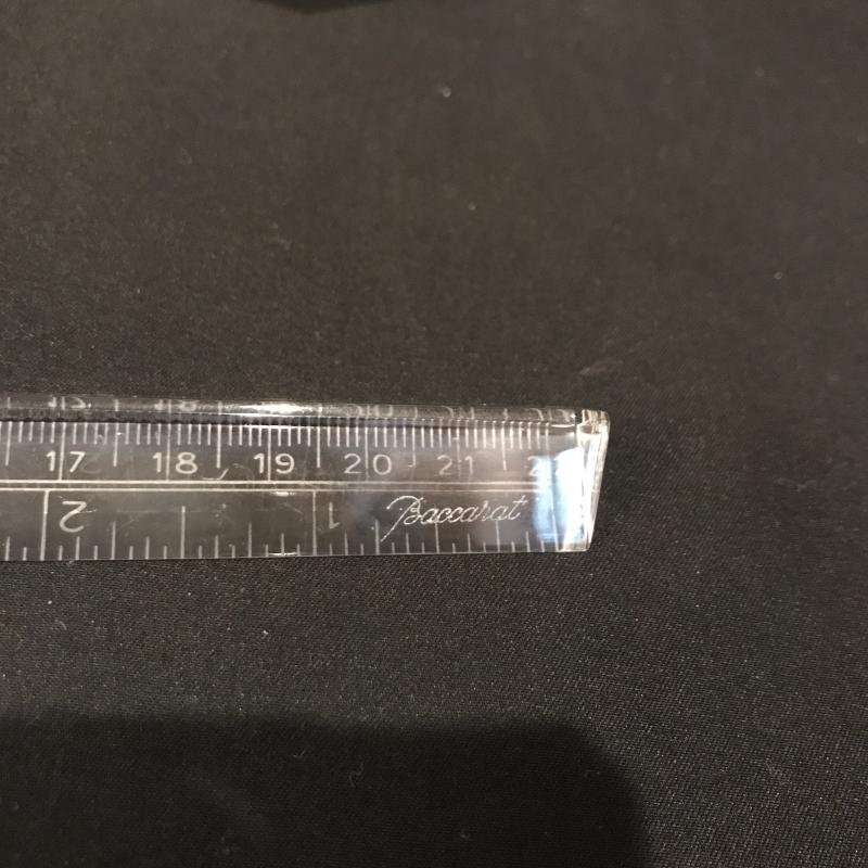 Lot of beautiful glass objects. Includes Baccarat signed ruler and two signed Steuben prisms. Also includes Royal Mint One Pound Coin embedded in Prism. Several other prisms including beautiful unsigned one with colored top and bottom that stands 5.5”l x 2.5”w. Has small scratch on one side. See picture. Shipping or local pick up in Asheville, NC.