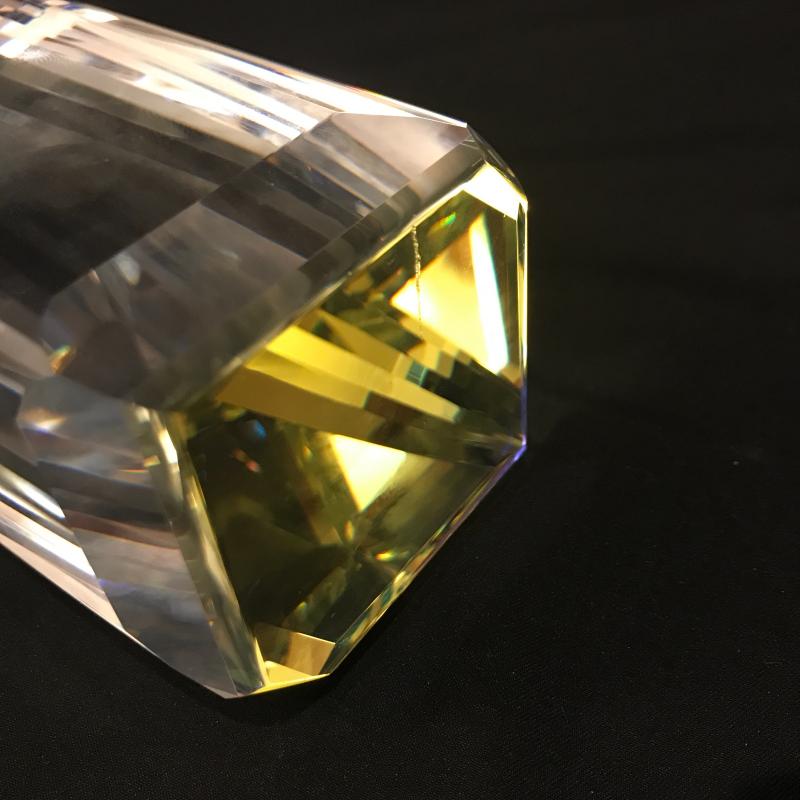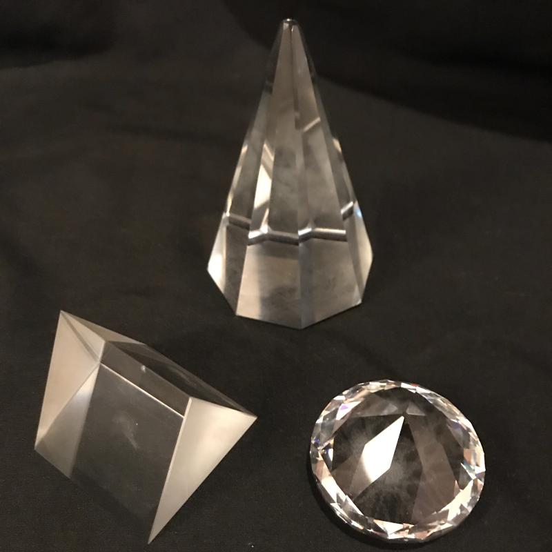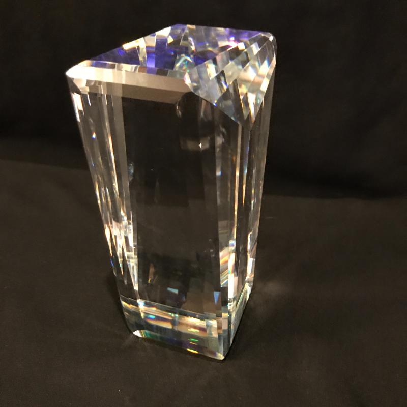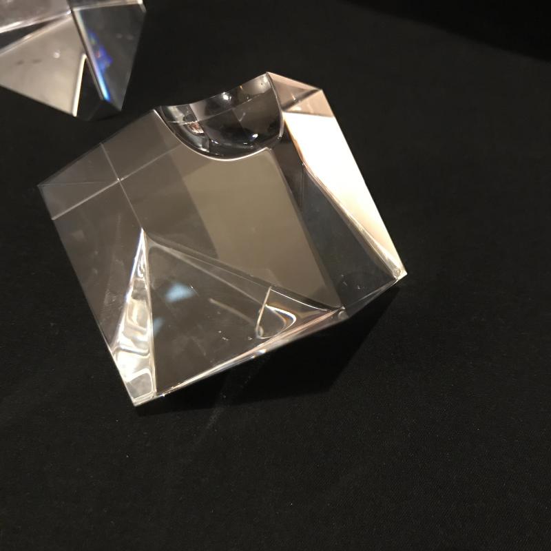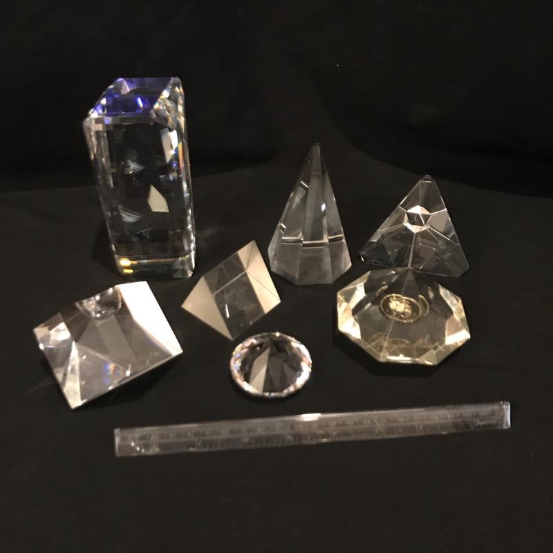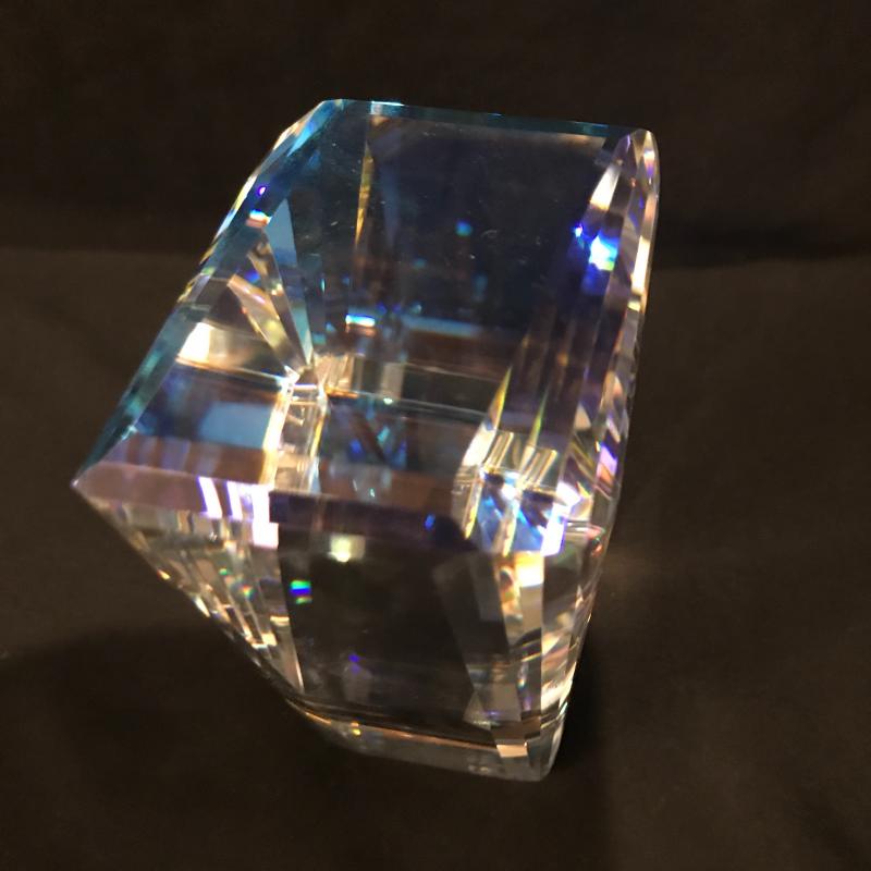 Lot of beautiful glass objects. Includes Baccarat signed ruler and two signed Steuben prisms. Also includes Royal Mint One Pound Coin embedded in Prism. Several other prisms including beautiful unsigned one with colored top and bottom that stands 5.5”l x 2.5”w. Has small scratch on one side. See picture. Shipping or local pick up in Asheville, NC.