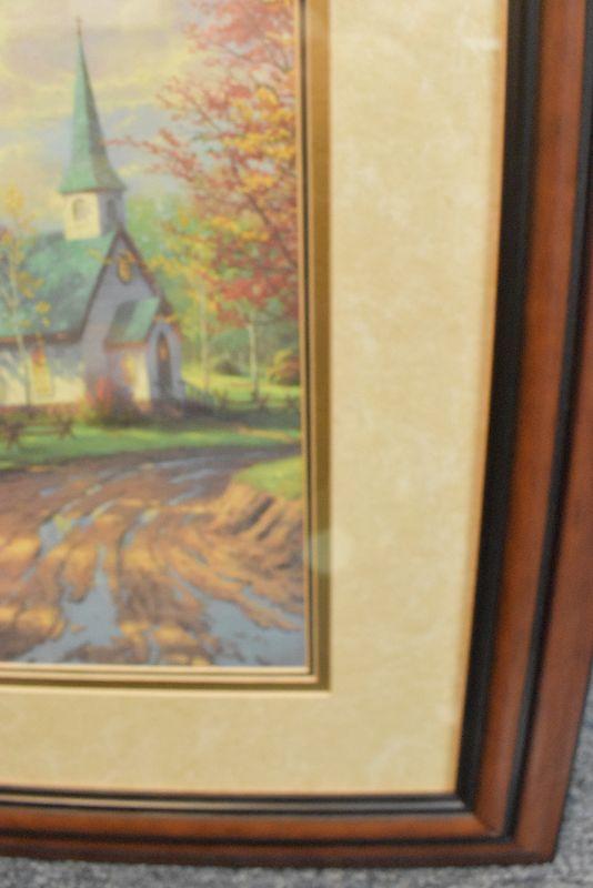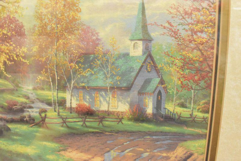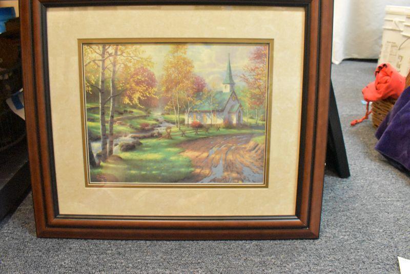 Framed print of church by Thomas Kinkade. 22x29 including frame.