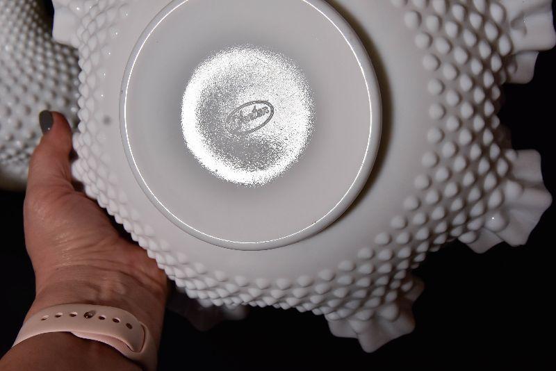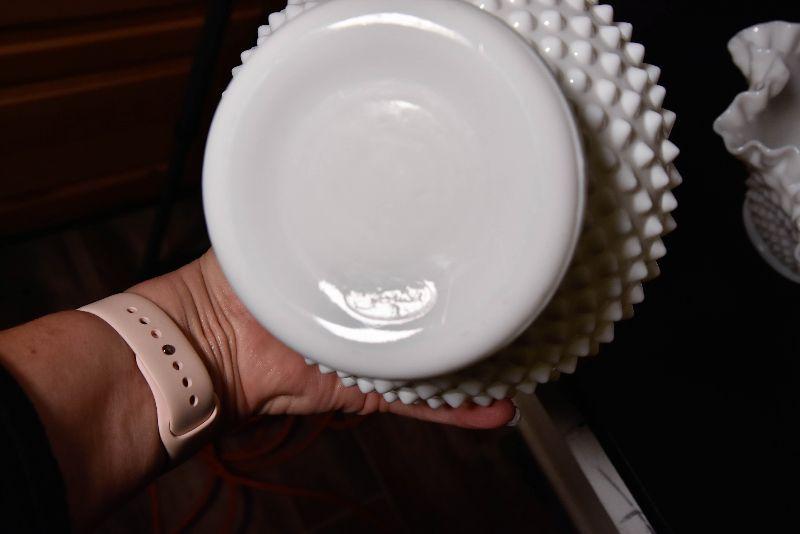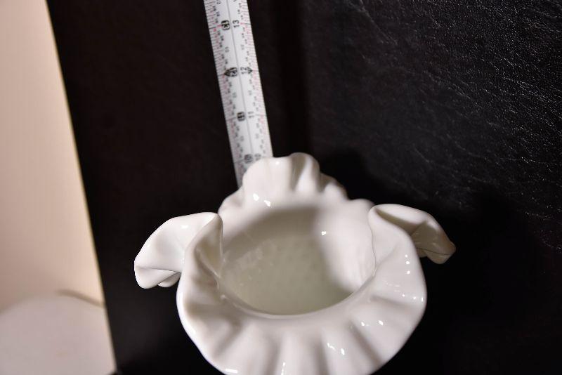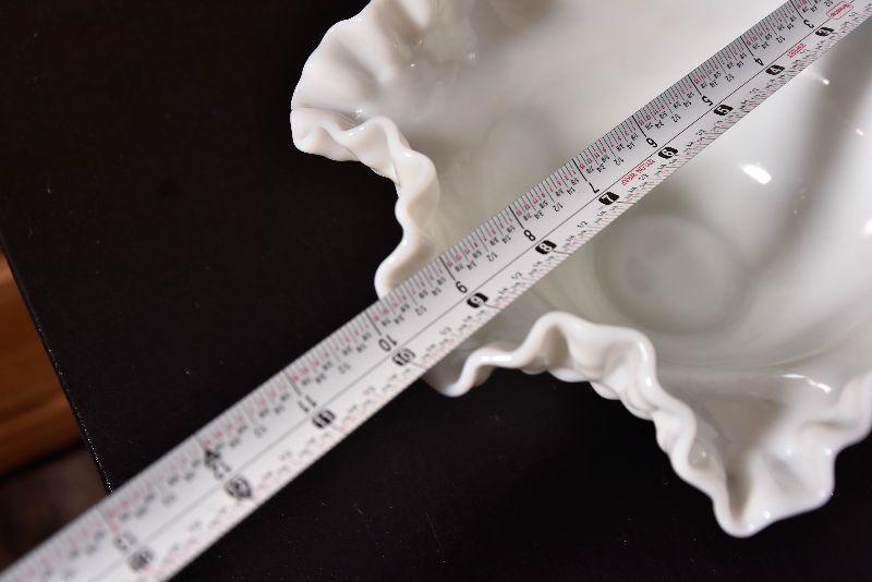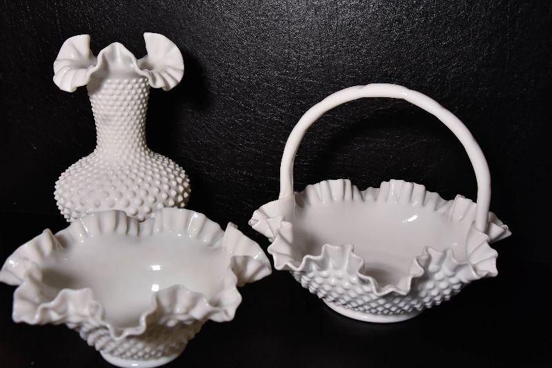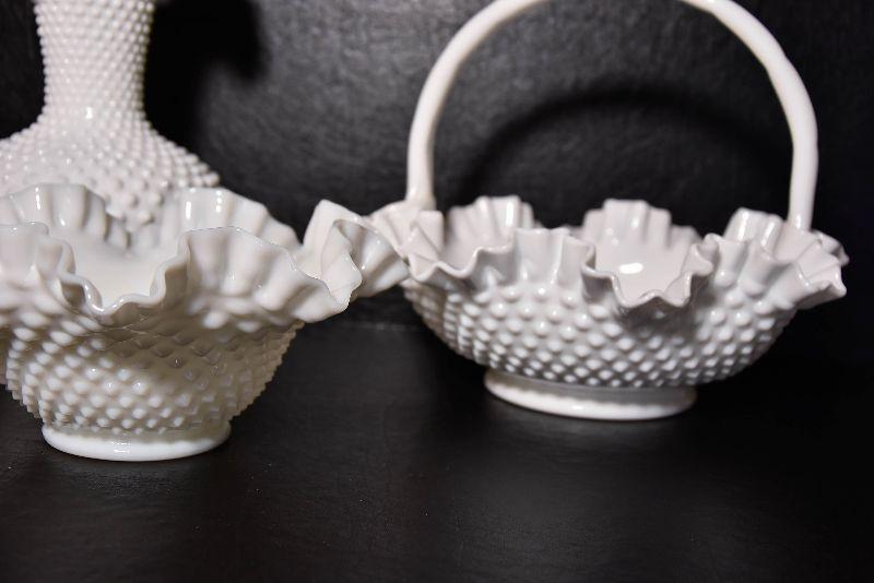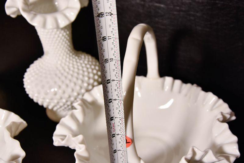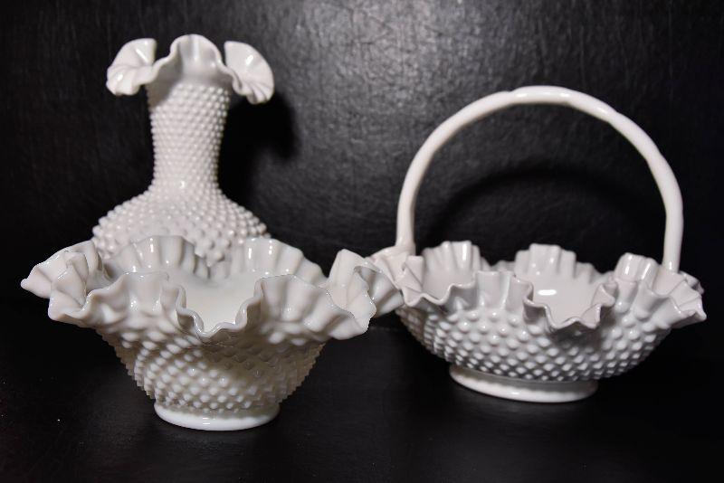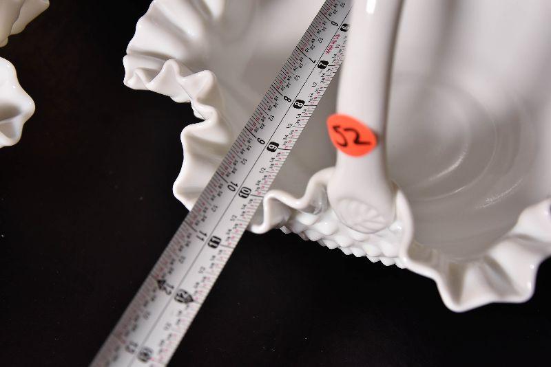 Lot 52: Three Ruffled White Milk glass Hobnail Bowls and Vase