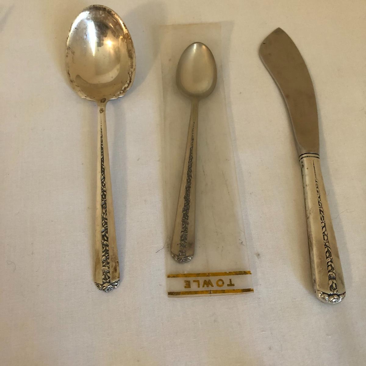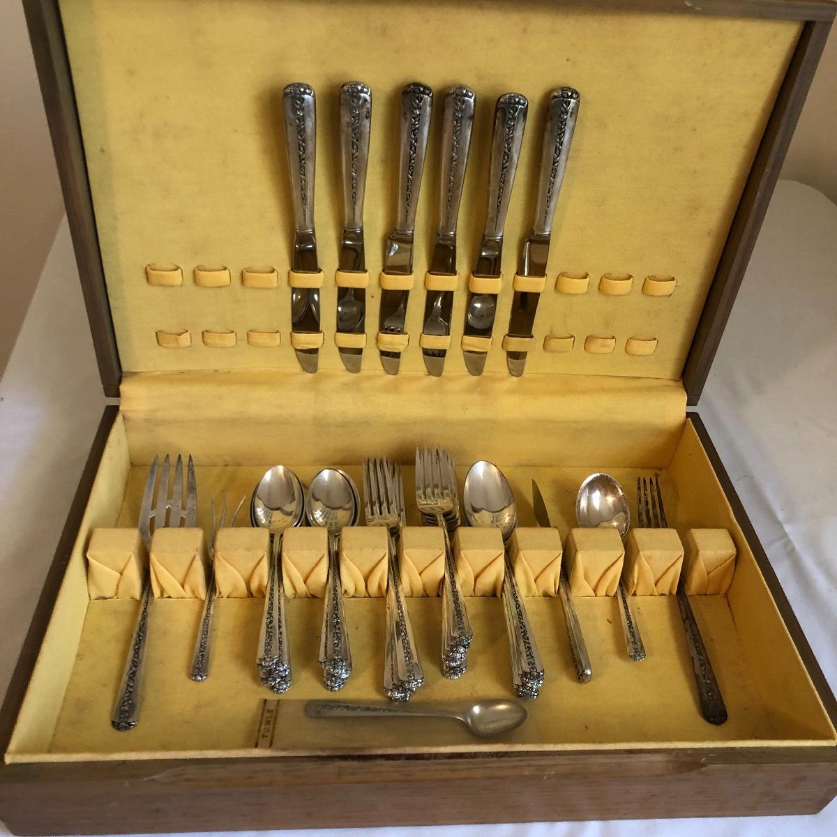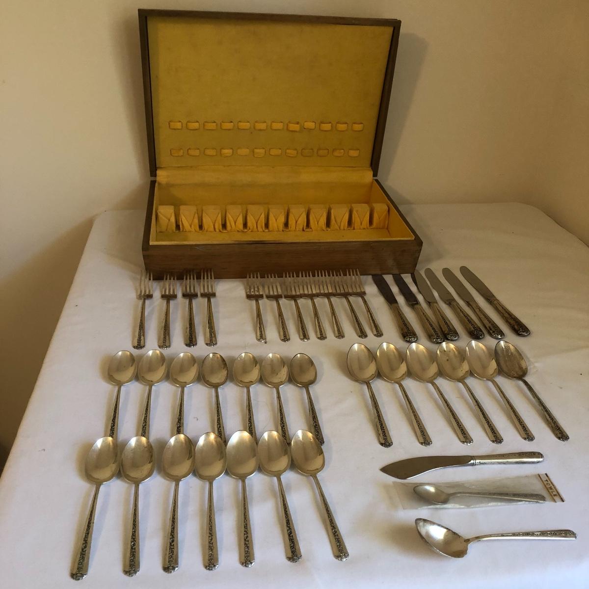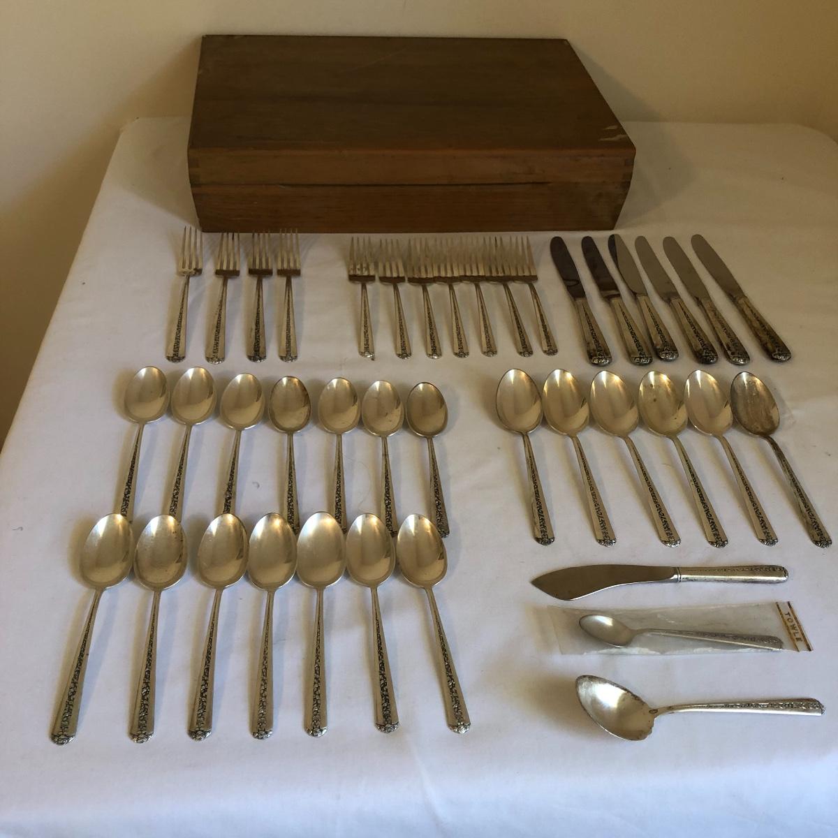 This lot includes Towle sterling flatware and wooden storage box. Lot has fourteen spoons, six larger spoons, seven forks, four larger forks, six knives, two small spoons, serving and small fork and a knife all in the Rambler Rose pattern. Starting price is at or near melt value.