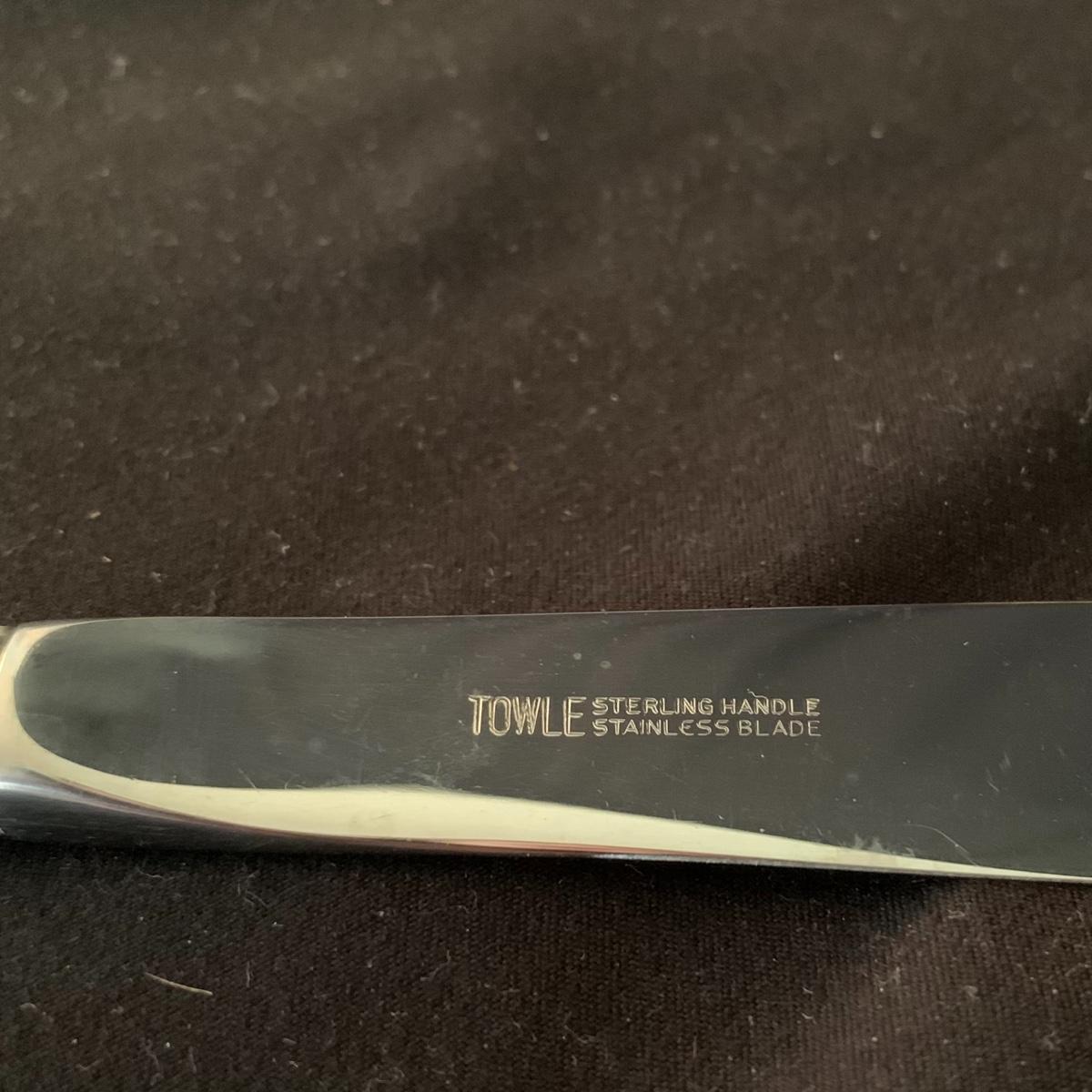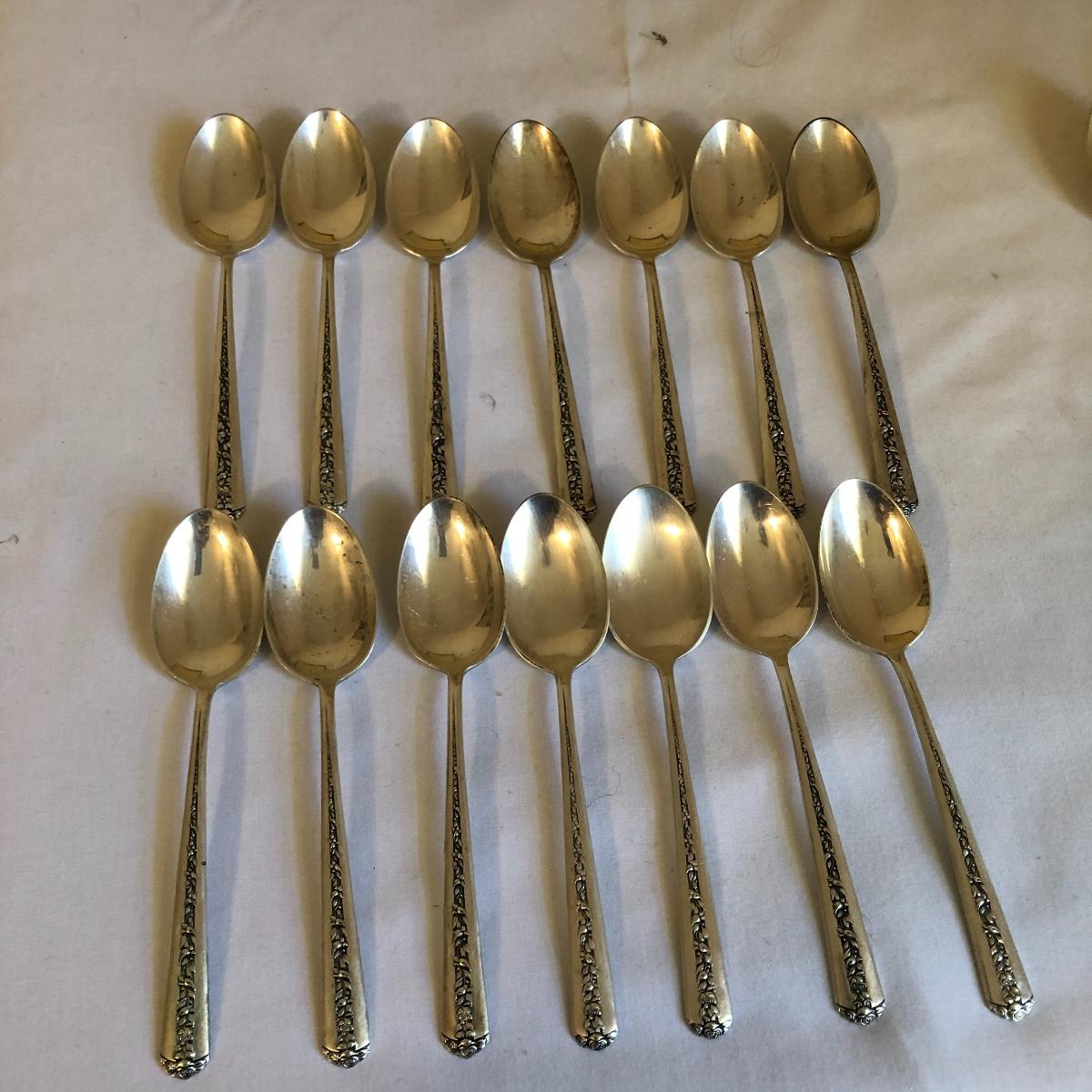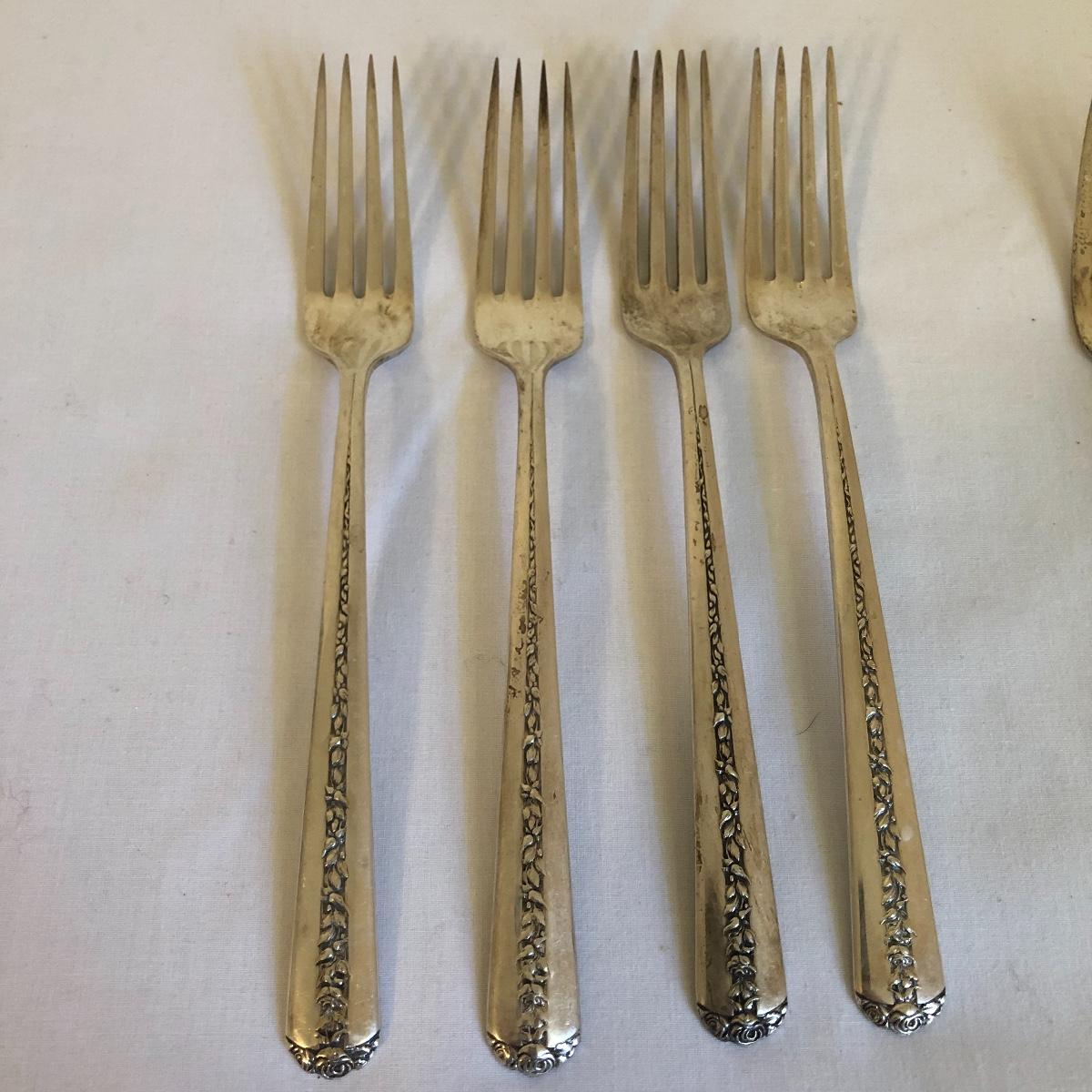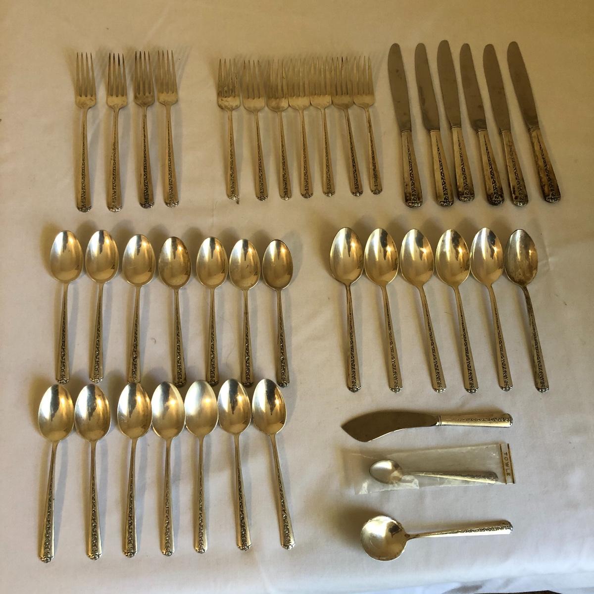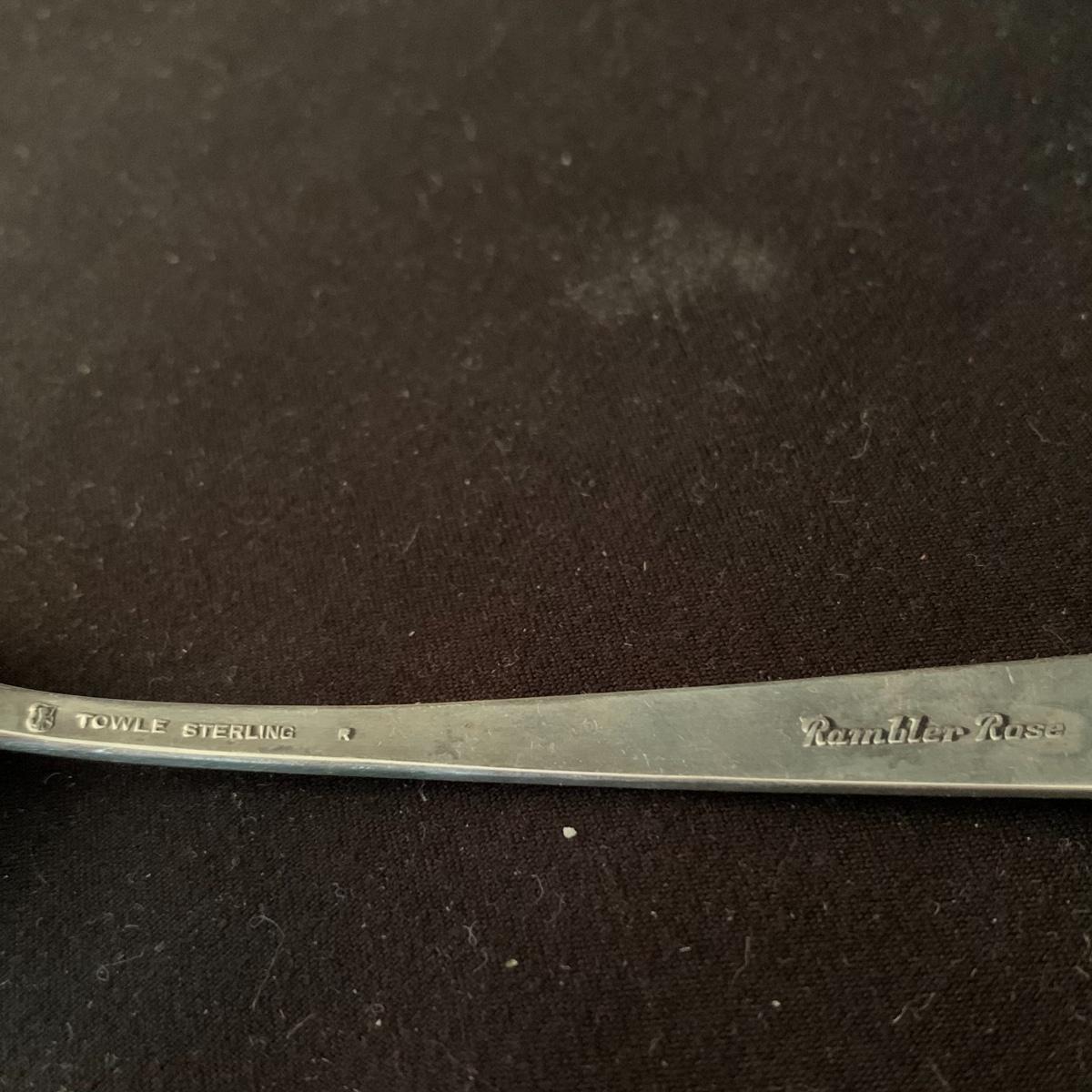 This lot includes Towle sterling flatware and wooden storage box. Lot has fourteen spoons, six larger spoons, seven forks, four larger forks, six knives, two small spoons, serving and small fork and a knife all in the Rambler Rose pattern. Starting price is at or near melt value.