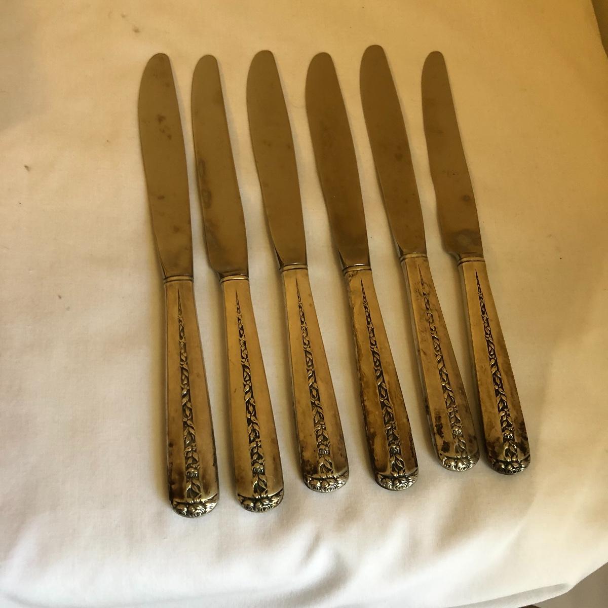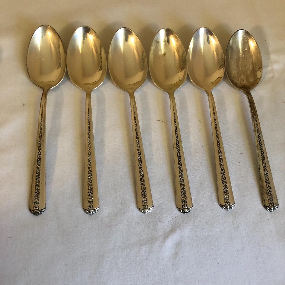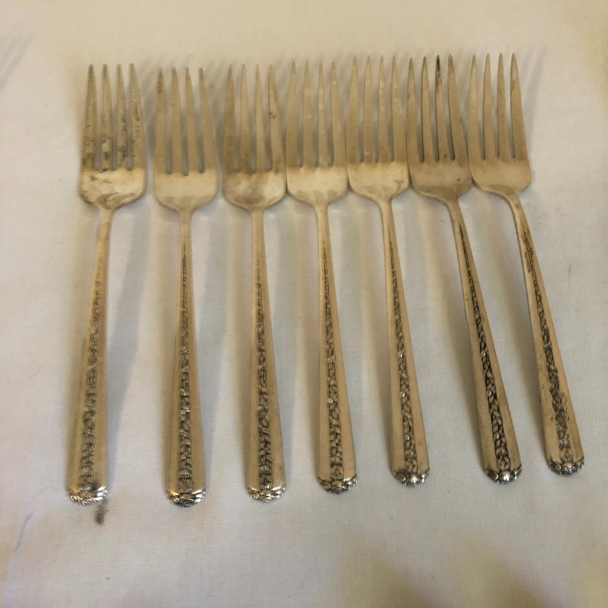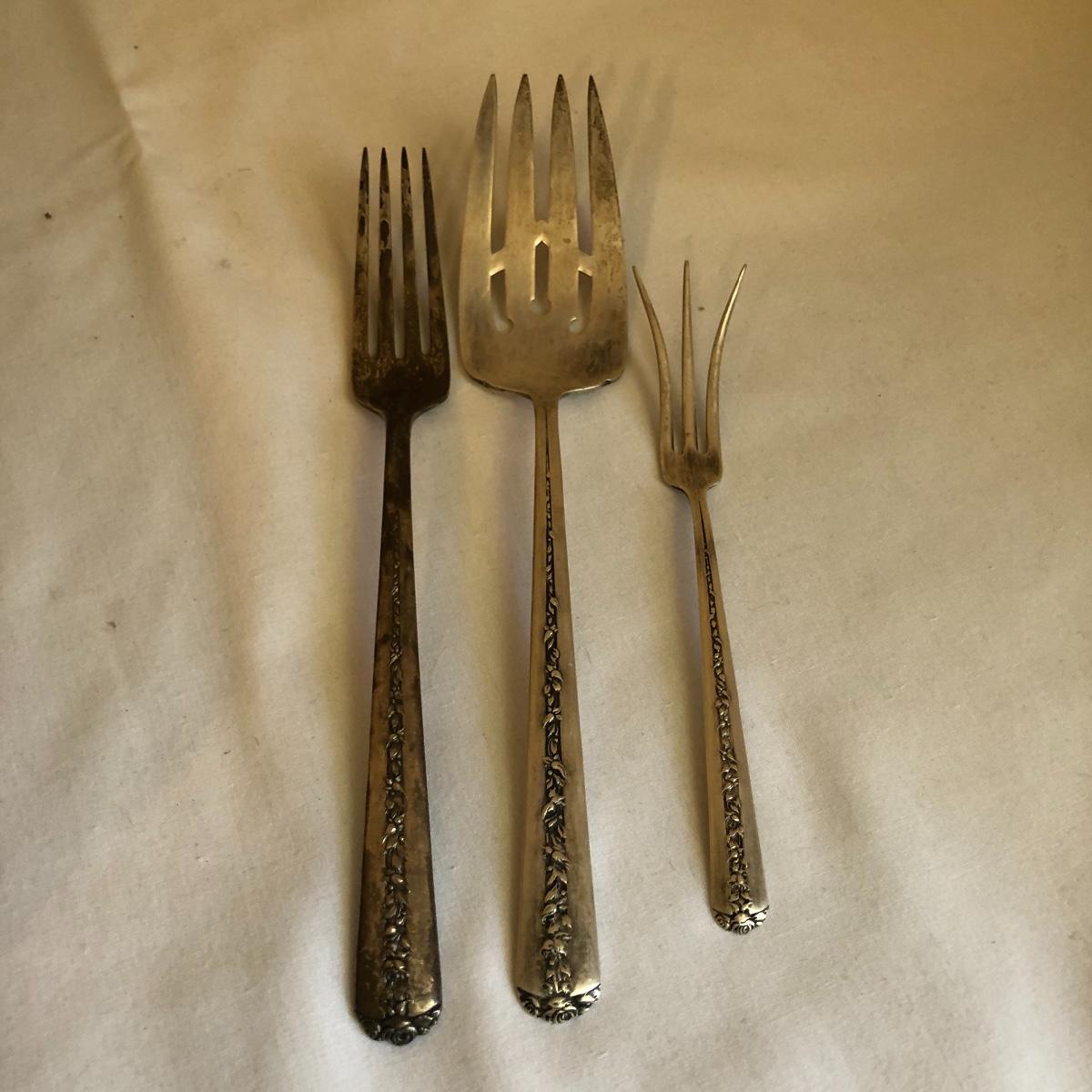 This lot includes Towle sterling flatware and wooden storage box. Lot has fourteen spoons, six larger spoons, seven forks, four larger forks, six knives, two small spoons, serving and small fork and a knife all in the Rambler Rose pattern. Starting price is at or near melt value.
