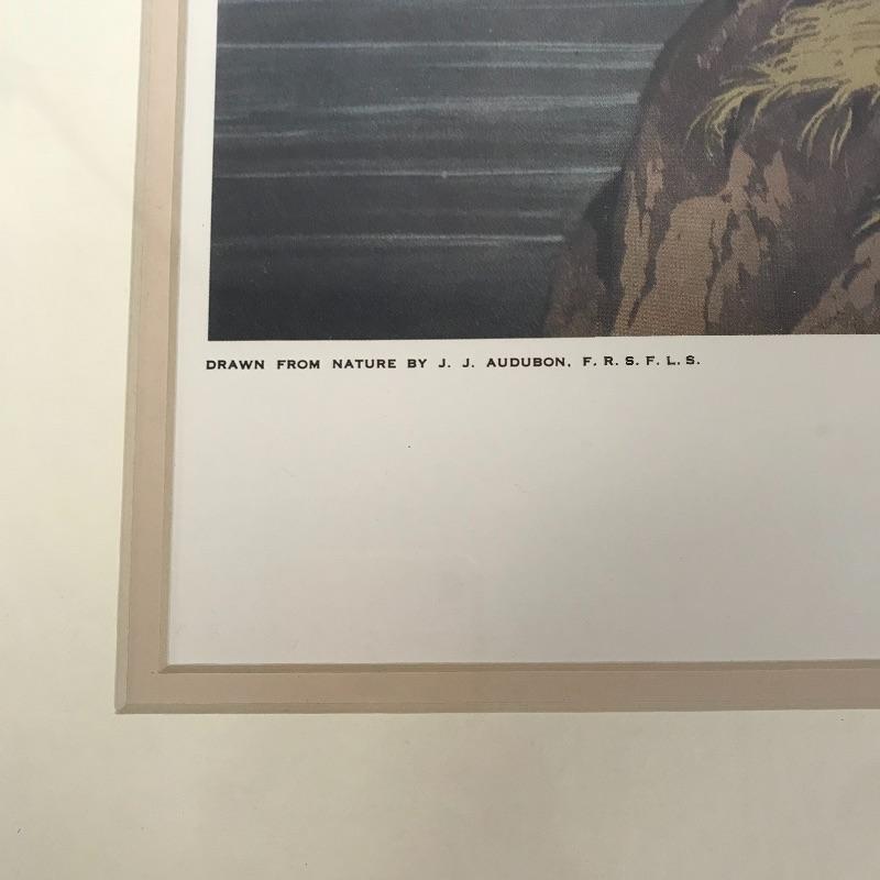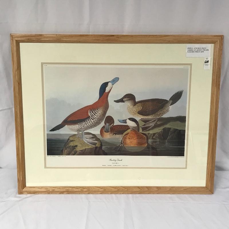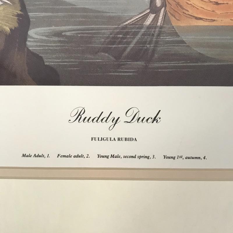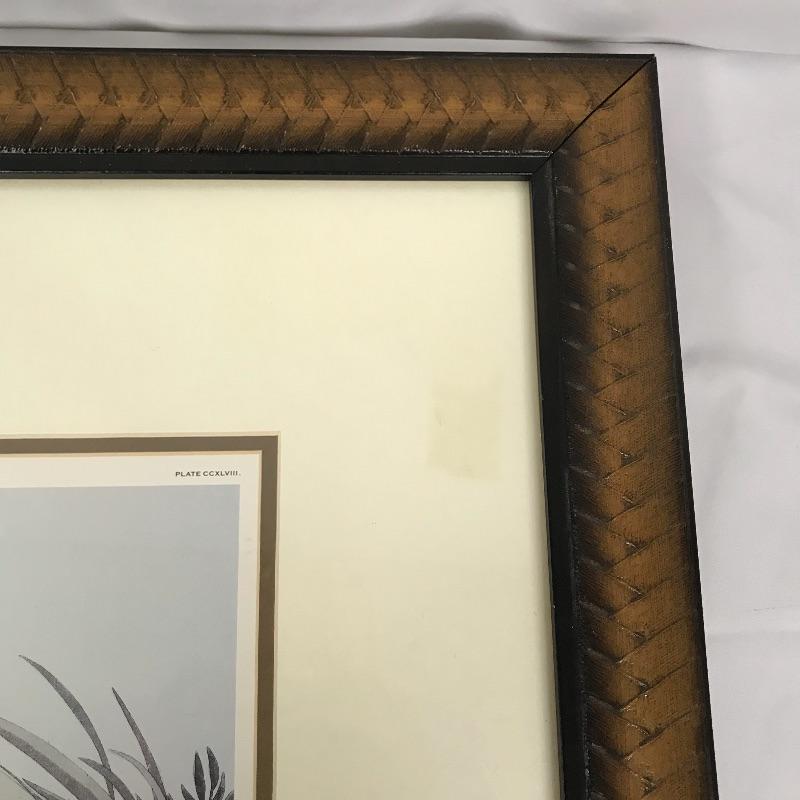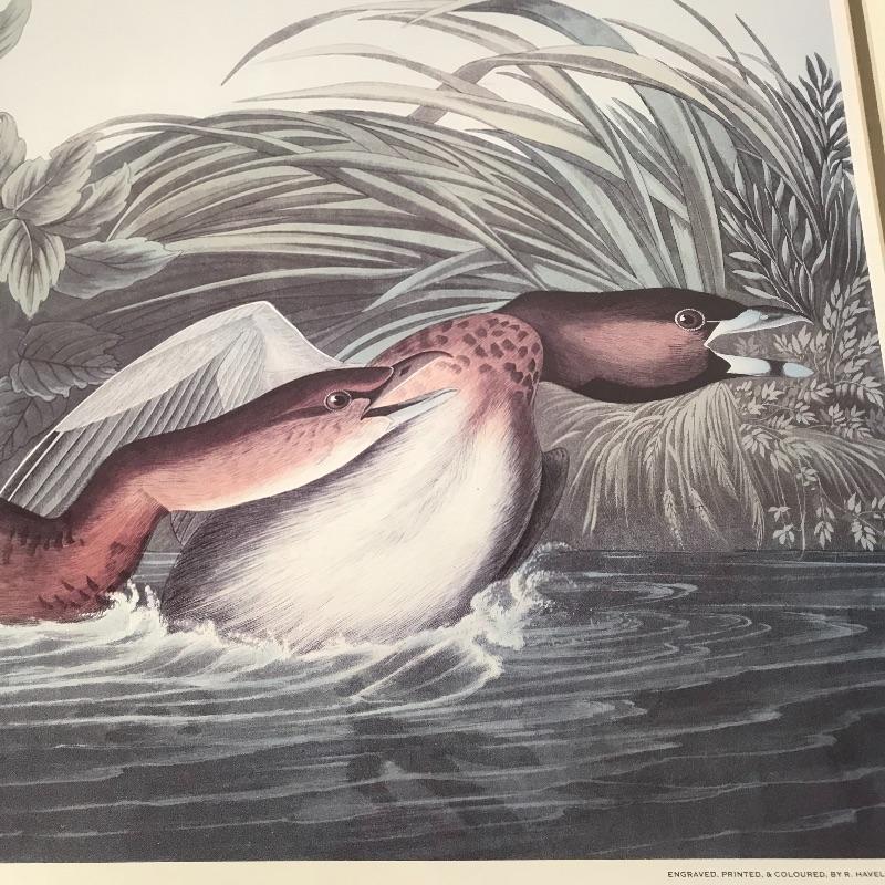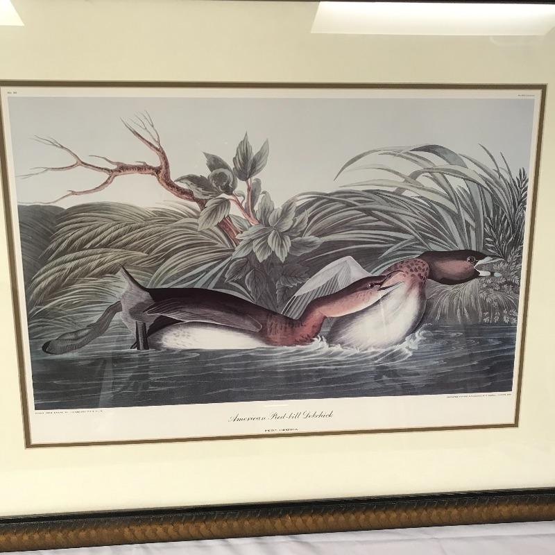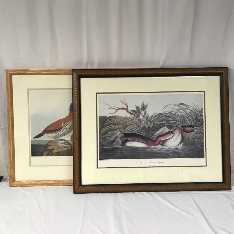 “American Pied-bill Dobchick” No. 50 in a lovely gold and ivory mat with a textured wooden frame, texture may have been created by a resin of sorts. The frame measures 35.5” x 28”. Lot also features “Ruddy Duck” No. 69 matted behind glass in a quality pine-like wooden frame. Frame measures 35” x 27.5”. Both glass panels need light cleaning with some adhesive removal in the top right corner. See images.