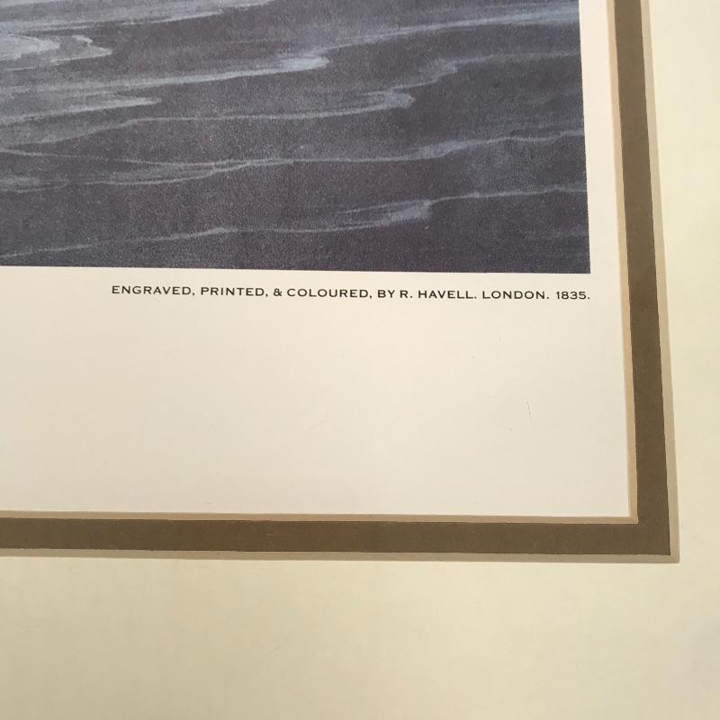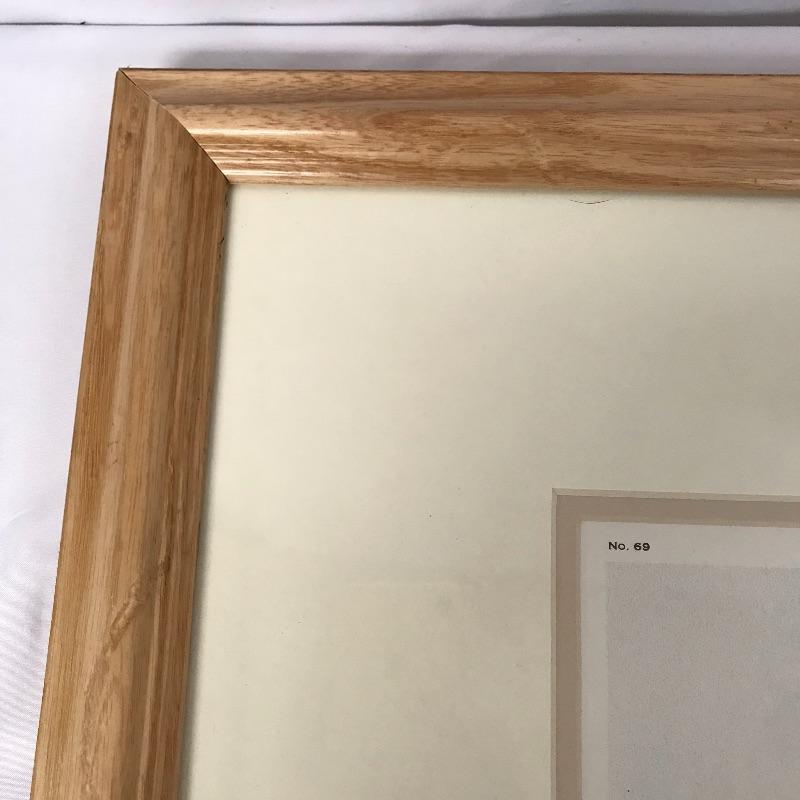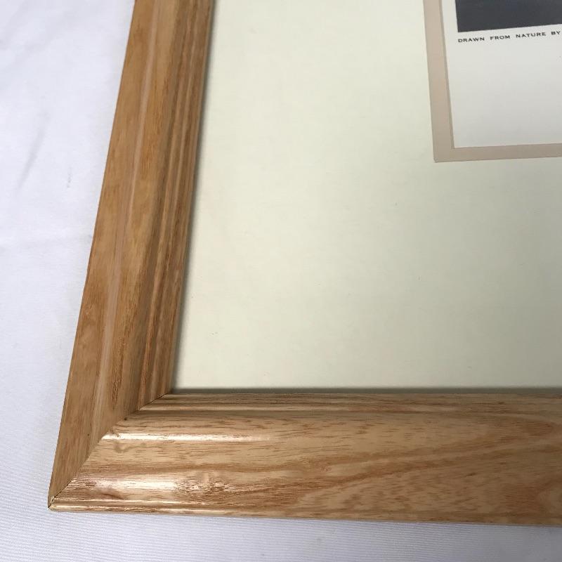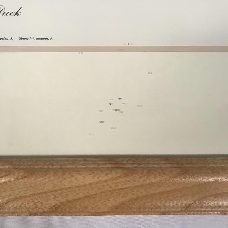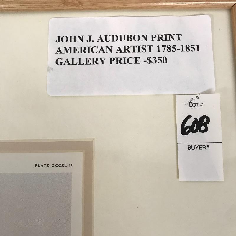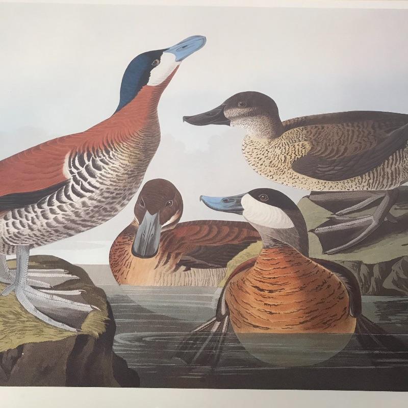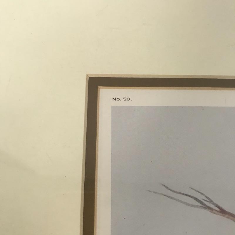 “American Pied-bill Dobchick” No. 50 in a lovely gold and ivory mat with a textured wooden frame, texture may have been created by a resin of sorts. The frame measures 35.5” x 28”. Lot also features “Ruddy Duck” No. 69 matted behind glass in a quality pine-like wooden frame. Frame measures 35” x 27.5”. Both glass panels need light cleaning with some adhesive removal in the top right corner. See images.