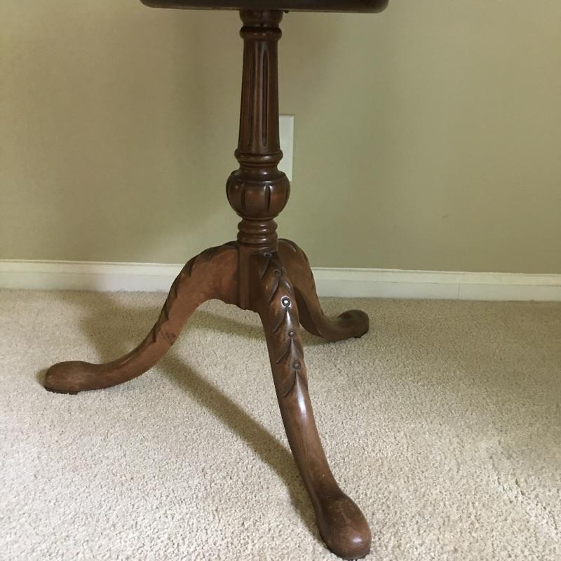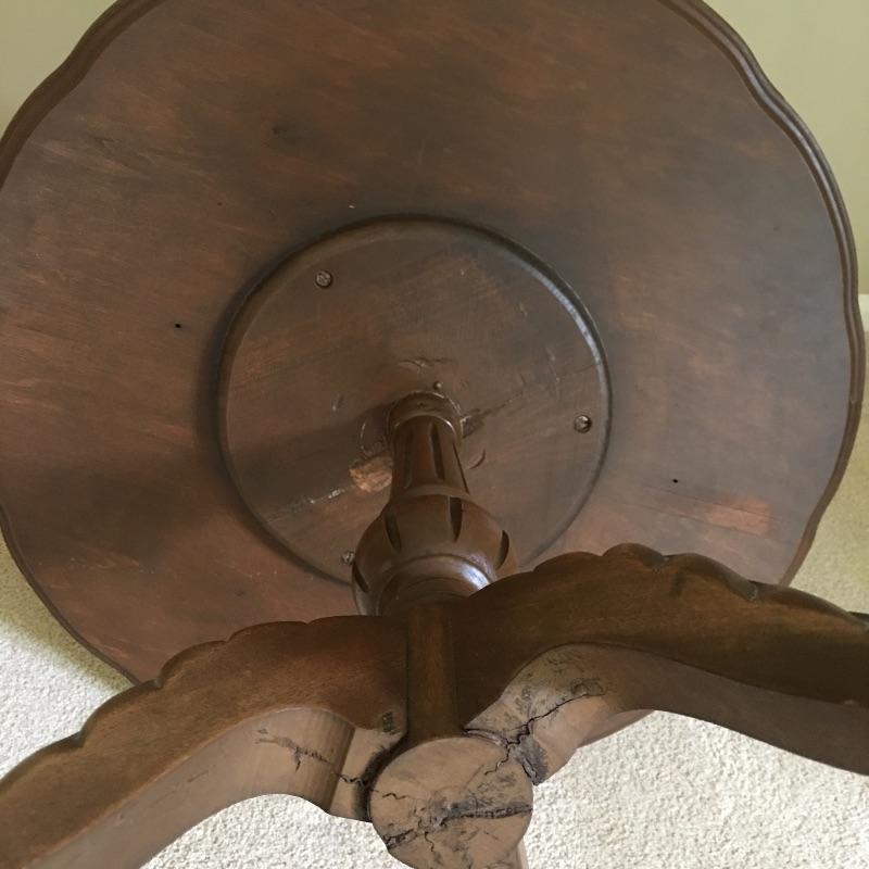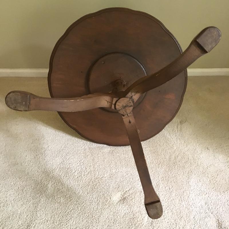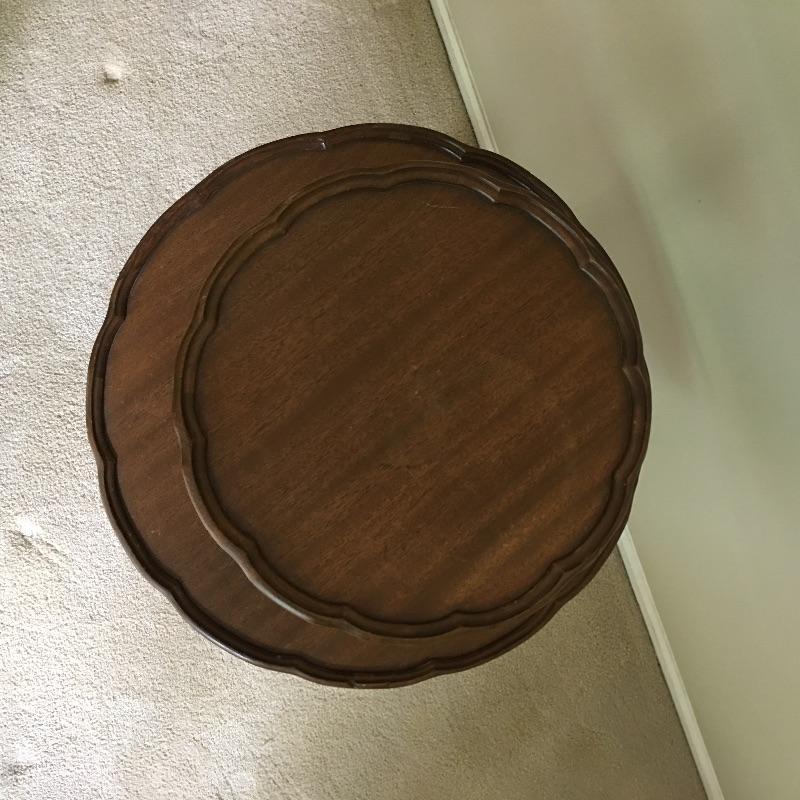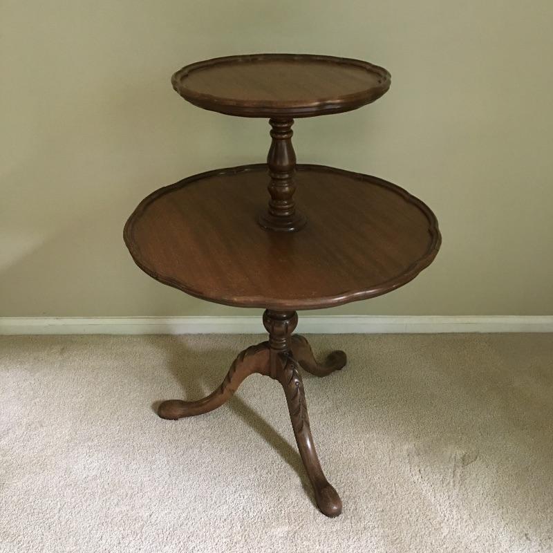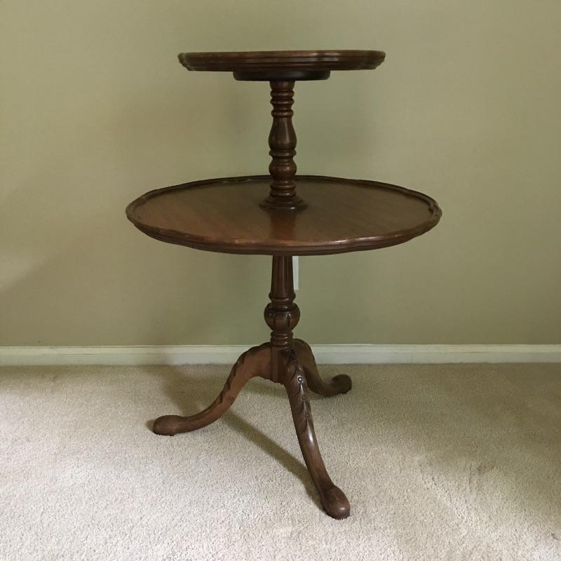 Two tier three legged wooden table. Large tier on table has some scratches - see pictures. With a little TLC this table will look great.
