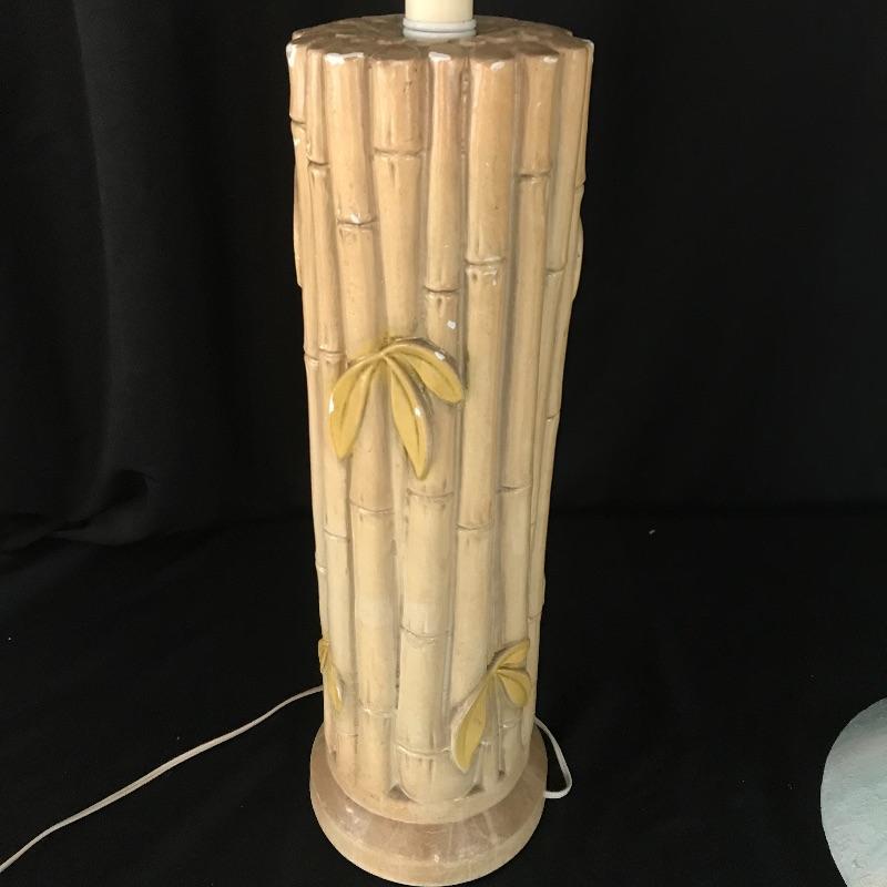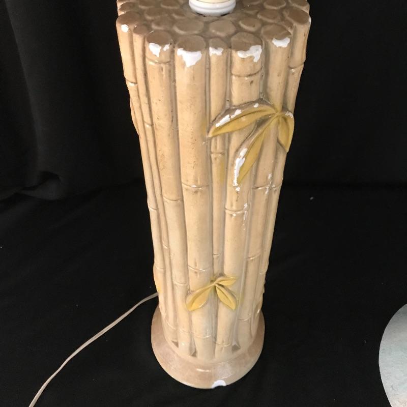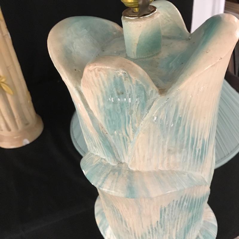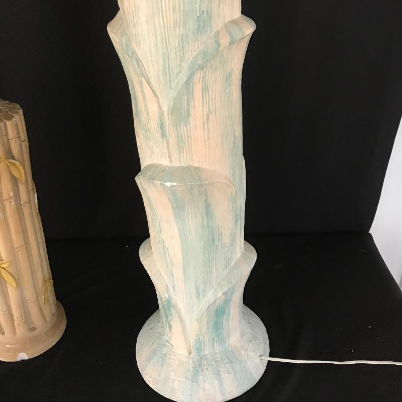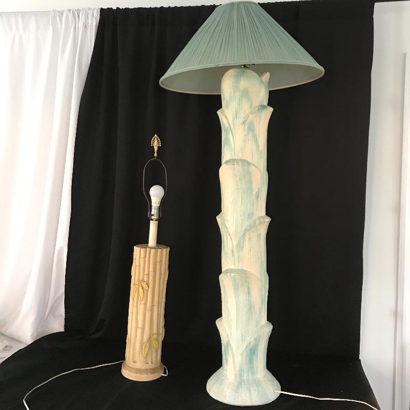 One floor lamp is a palm tree-esque teal lamp with textured base and matching shade. Shade is in decent shape, but shows age in its underside. Palm is accompanied by lamp with a base resembling a collection of bamboo, complete with leaves. Both lamps turn on when plugged in and have some chipping noted in photos. Both are ceramic pieces. Local pick up only.