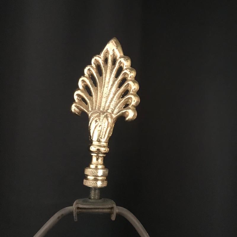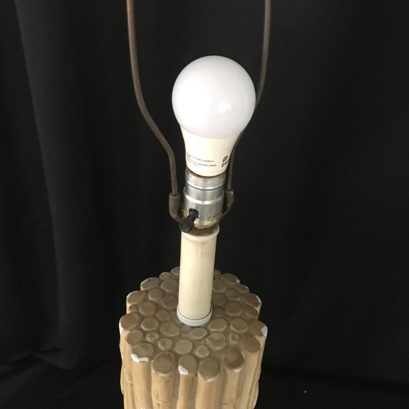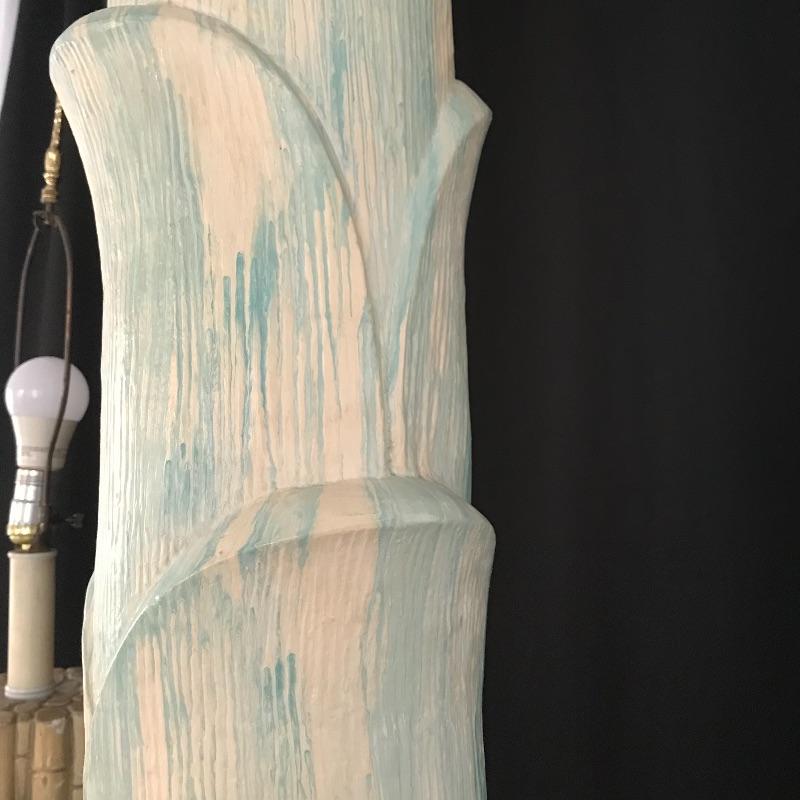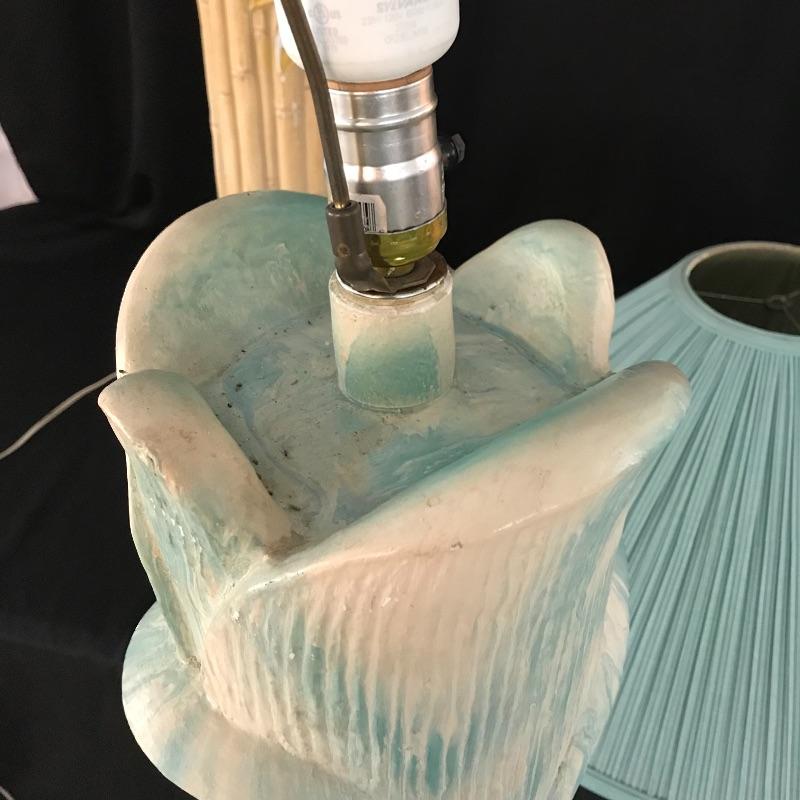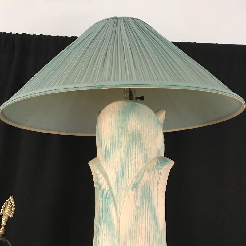 One floor lamp is a palm tree-esque teal lamp with textured base and matching shade. Shade is in decent shape, but shows age in its underside. Palm is accompanied by lamp with a base resembling a collection of bamboo, complete with leaves. Both lamps turn on when plugged in and have some chipping noted in photos. Both are ceramic pieces. Local pick up only.