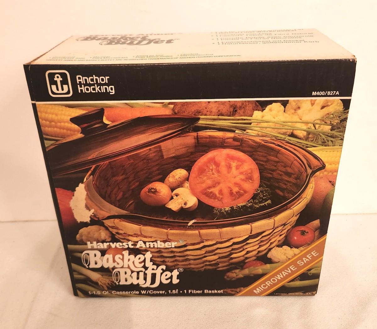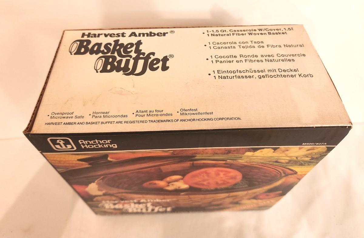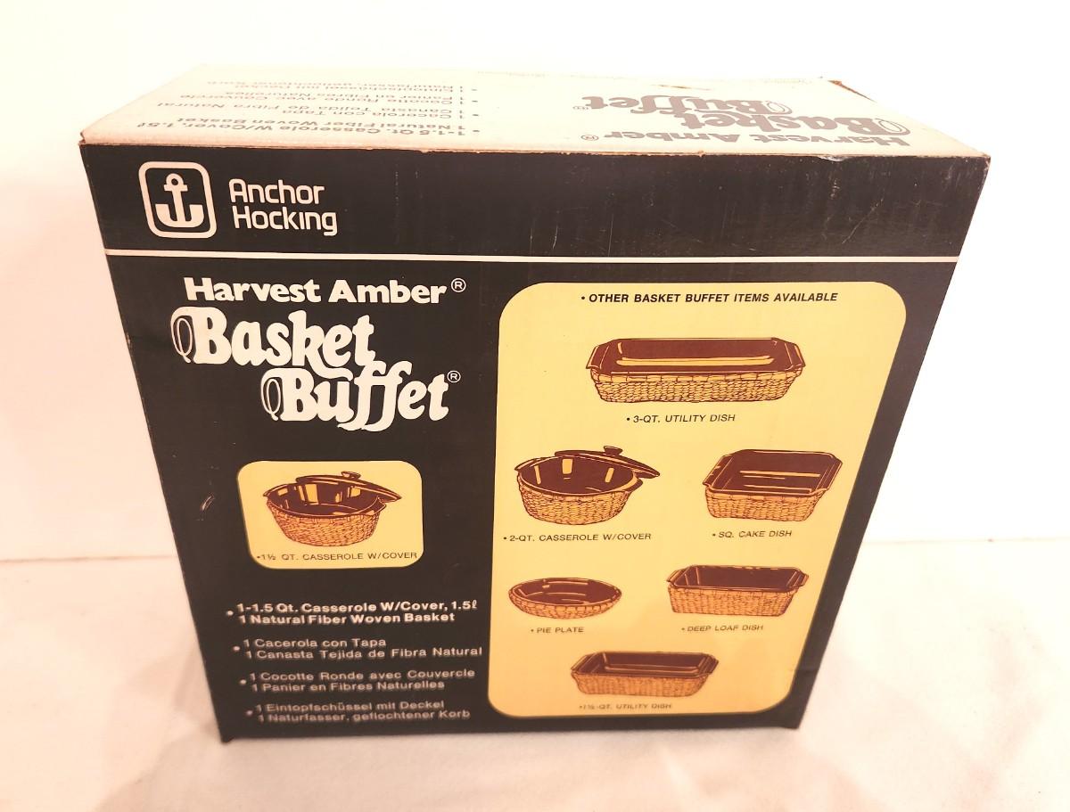 New in Box! 1970's Anchor Hocking Harvest Amber 1.5 Quart Casserole Dish with basket. This was part of a larger set that was introduced during the Bicentennial Celebration.
