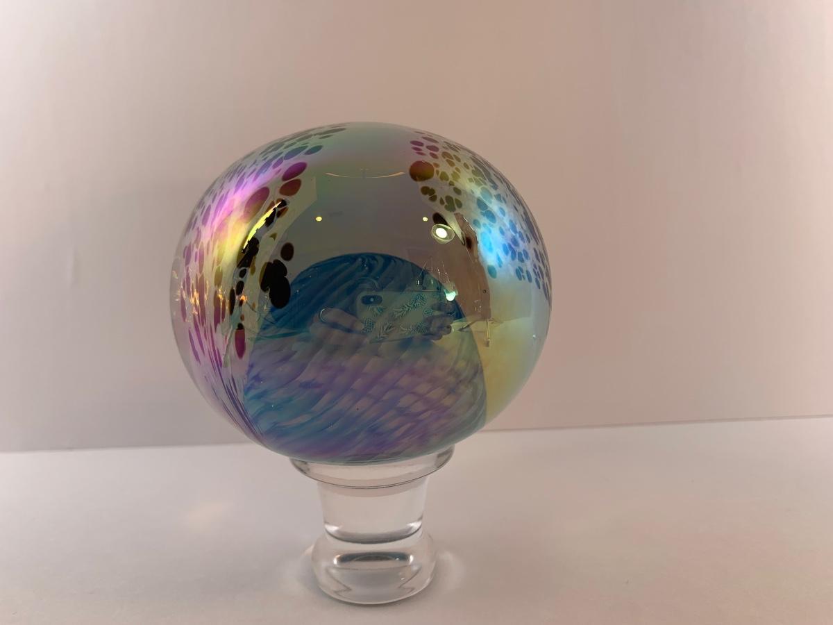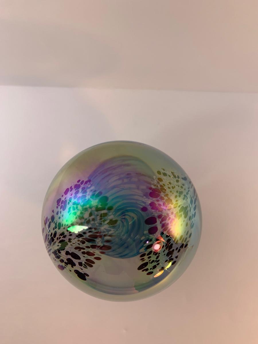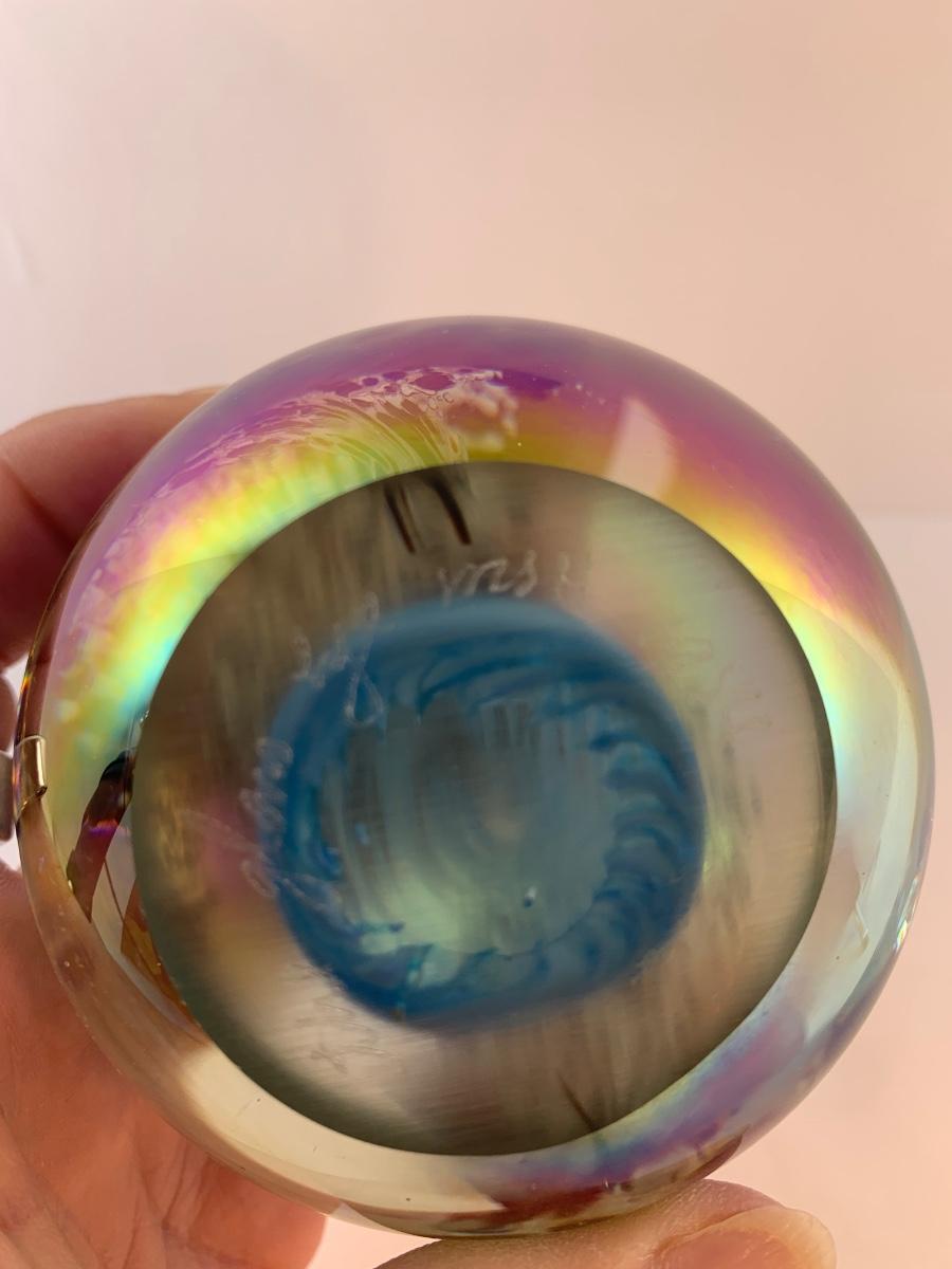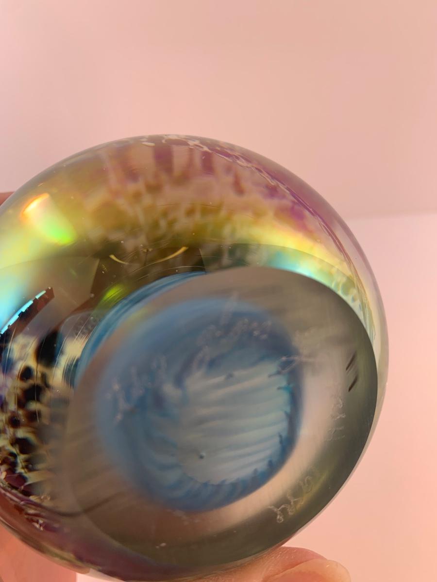 1984 Mount St Helens iridescent veiled abstract paperweight. Signed on bottom "The Glass Eye MSH 1984", 3" x 2 1/2"