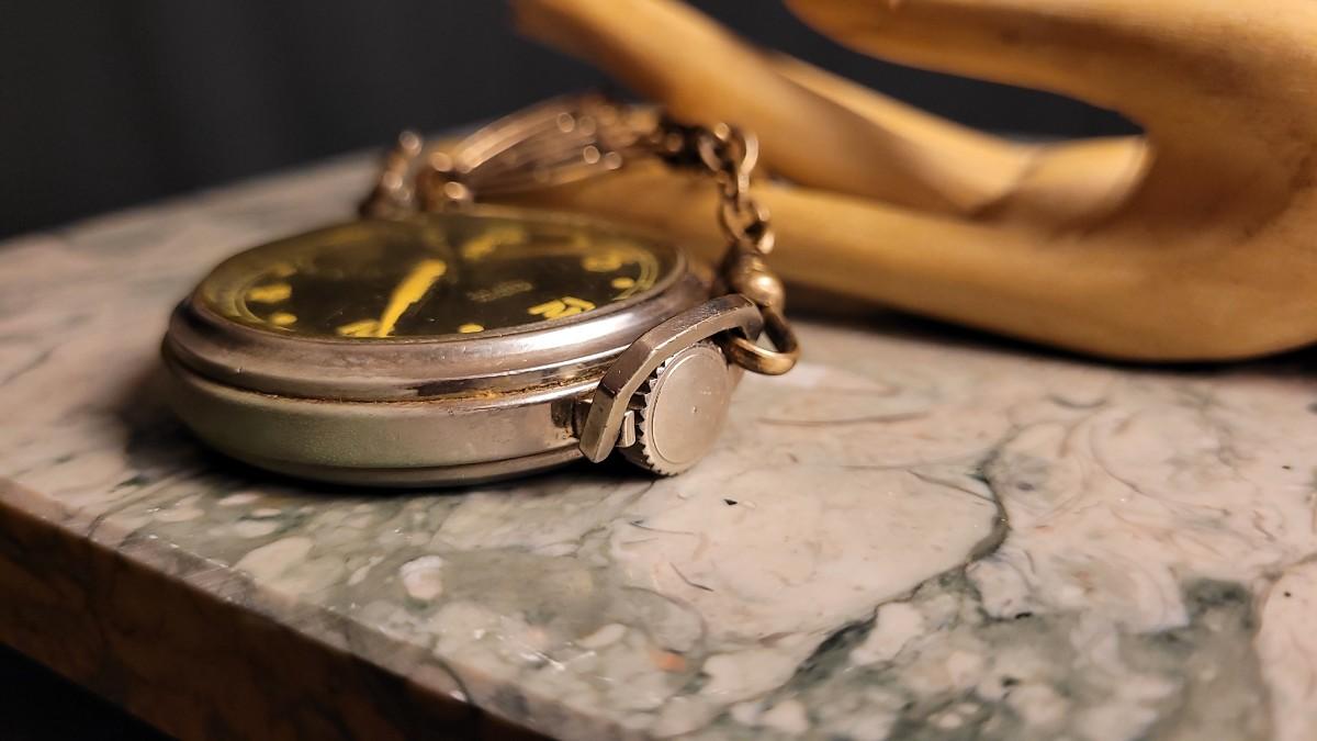 This watch appears to suffer from an overwound main spring and will need a service to return to working condition. The fancy Vintage Fob included can easily be removed if desired.