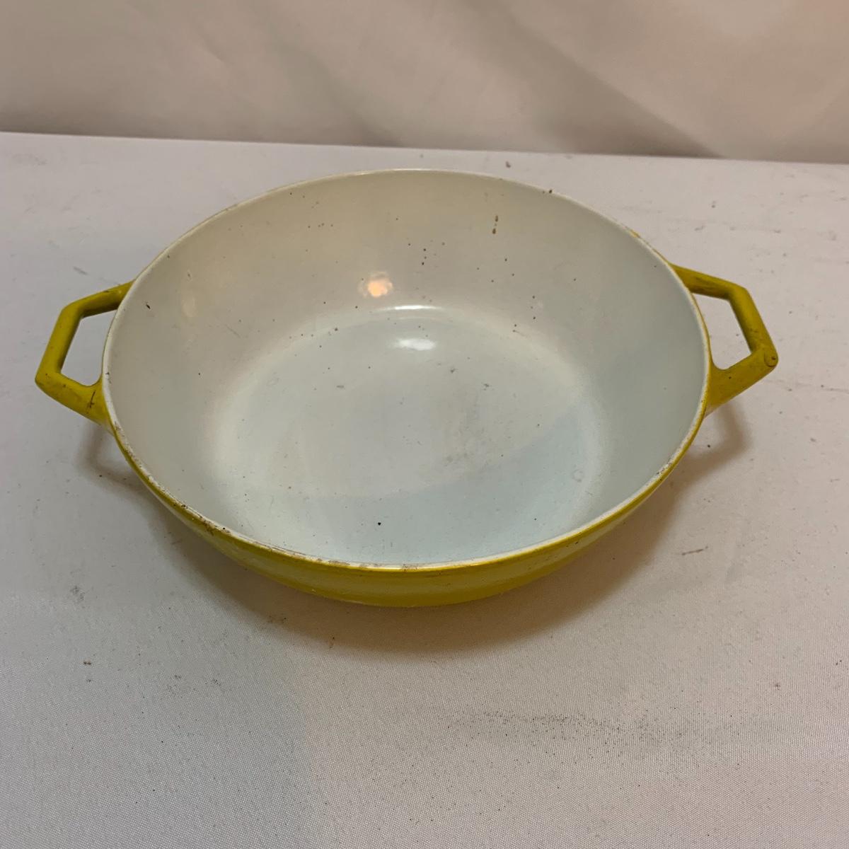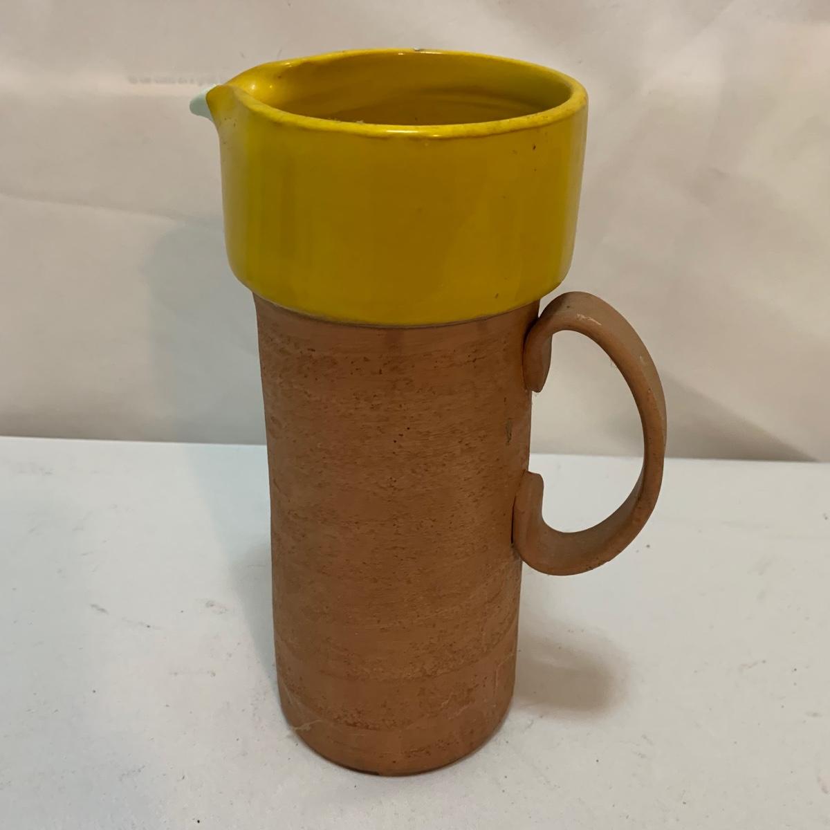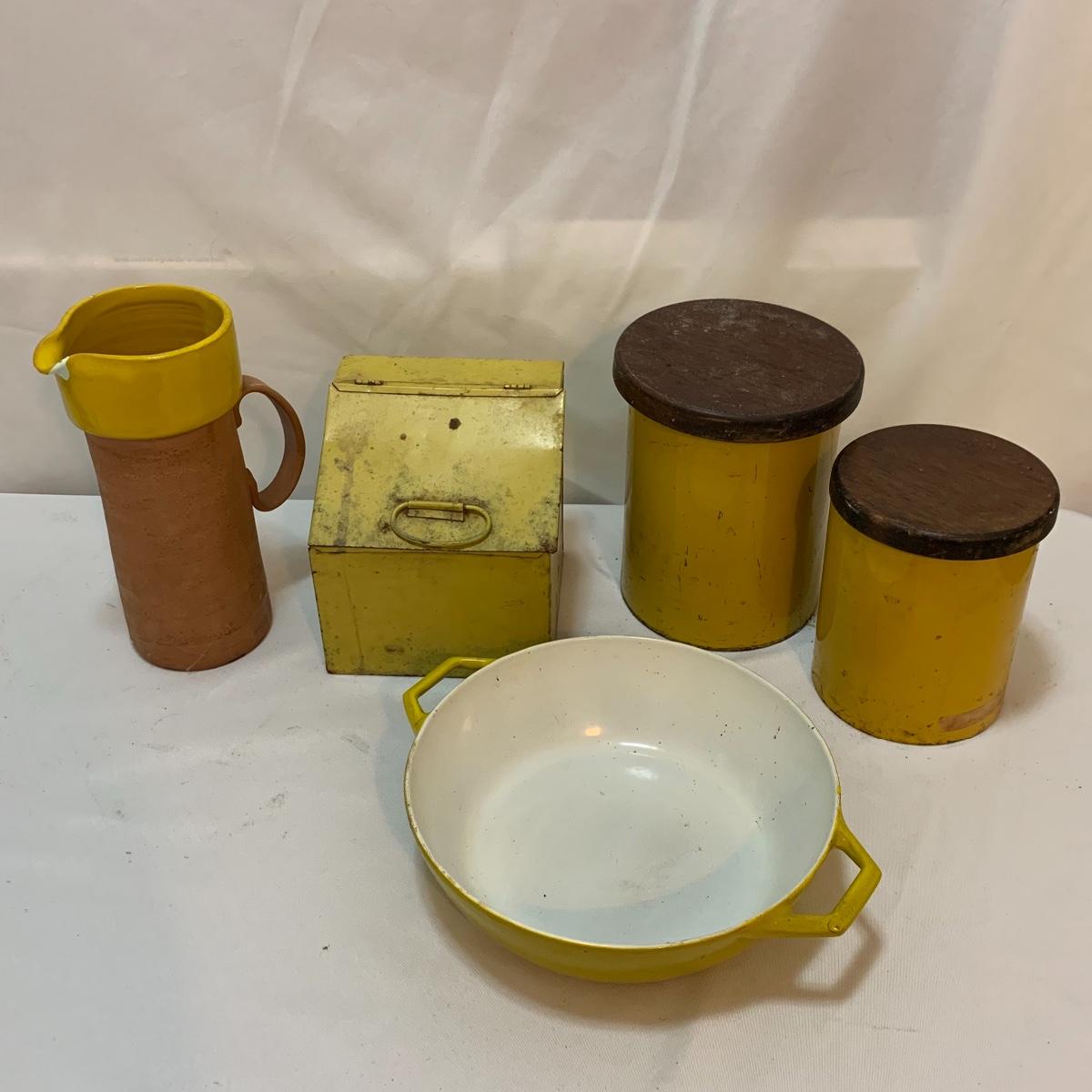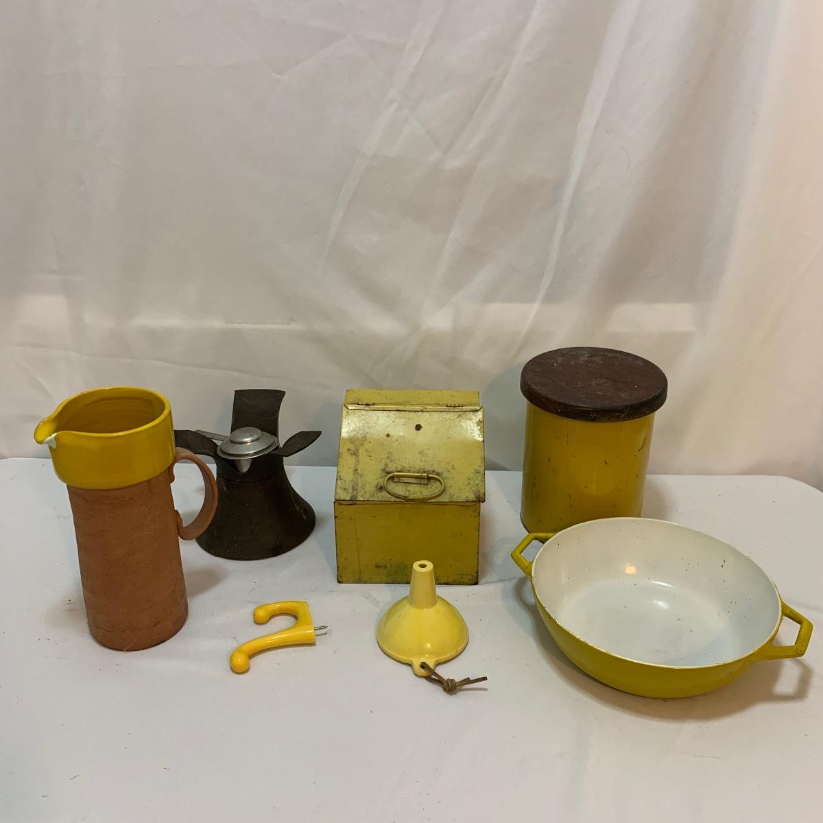 This lot is full of sunny yellow kitchen items to brighten up your kitchen. There is a unique ceramic pitcher from Portofino, Italy that is a little over 10” tall with a bright yellow glazed top and spout. The spout has a small chip and thre glaze is chipped off. The inside of the pitcher is glazed. The metal box has a tilted hinged lid & a handle. Also included is a 10” yellow ceramic cooking dish from Denmark, some yellow metal jars with wooden lids that nest; the third one is stuck inside the second one so that might take a bit of work to get it out. There’s also a yellow hook with a screw and a yellow funnel with a strap. And one non yellow item that is a unique Copco burner. Shipping available.