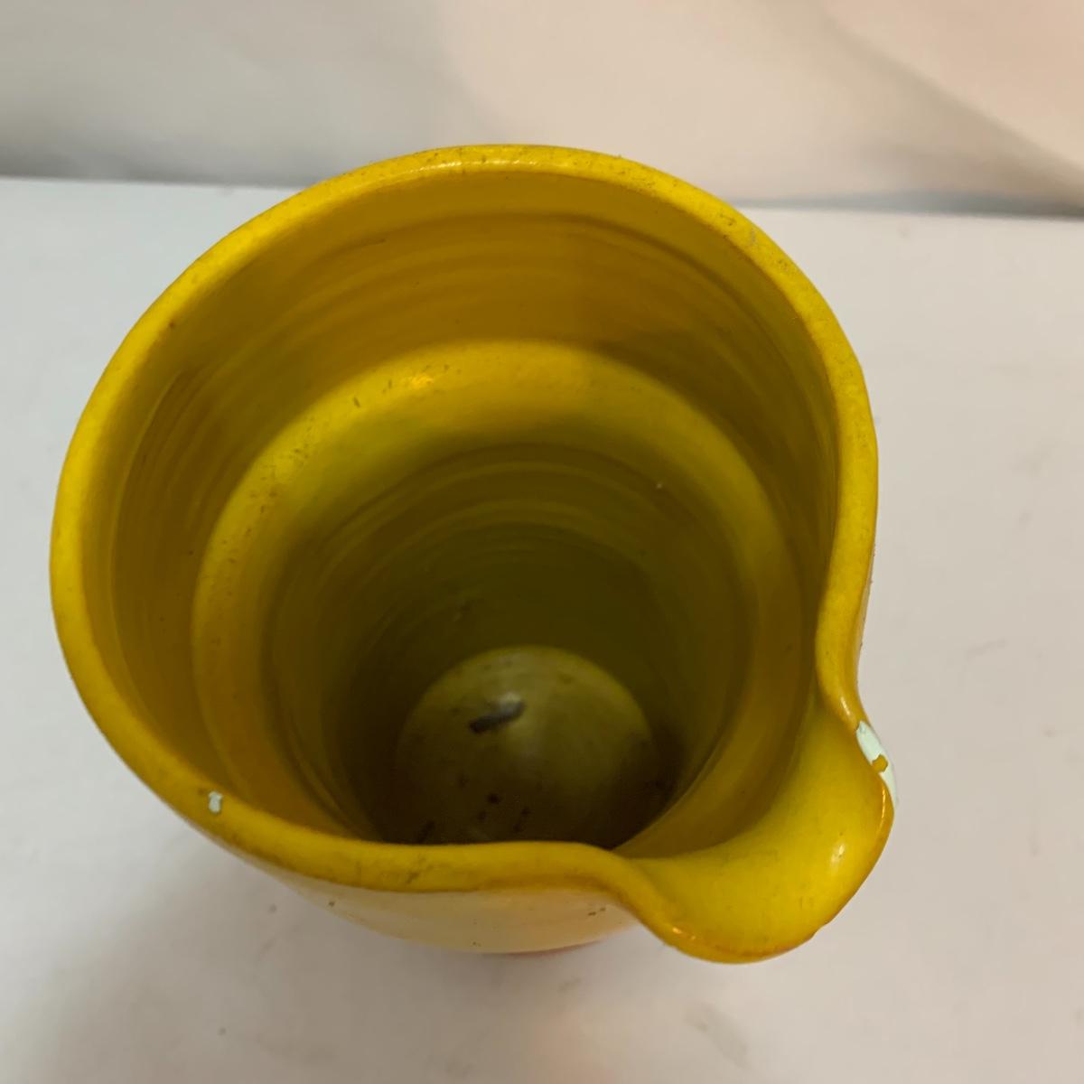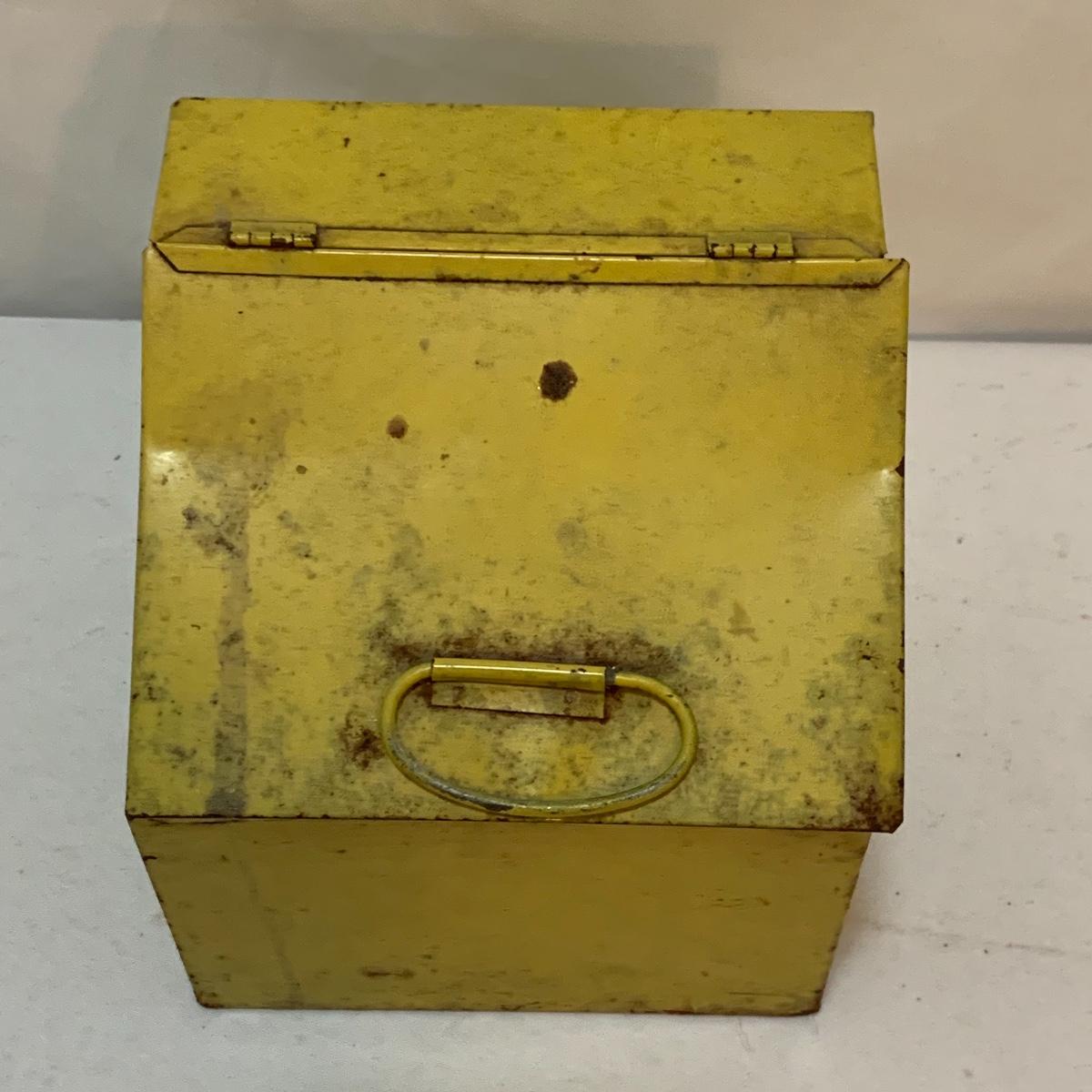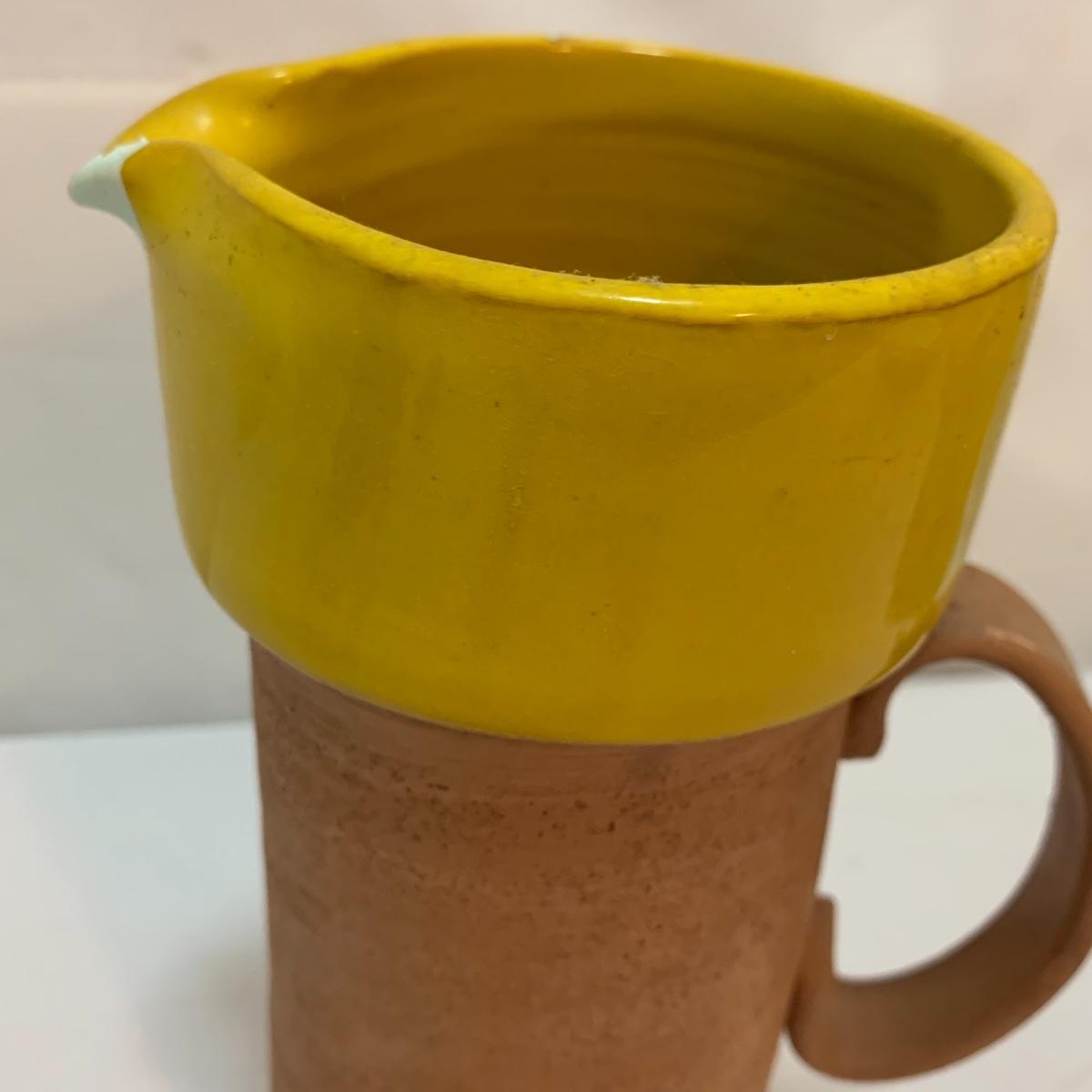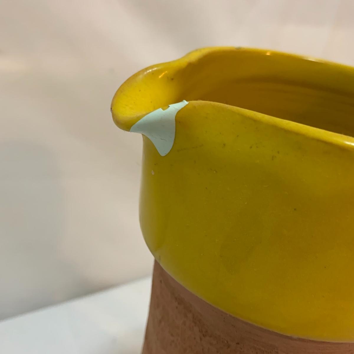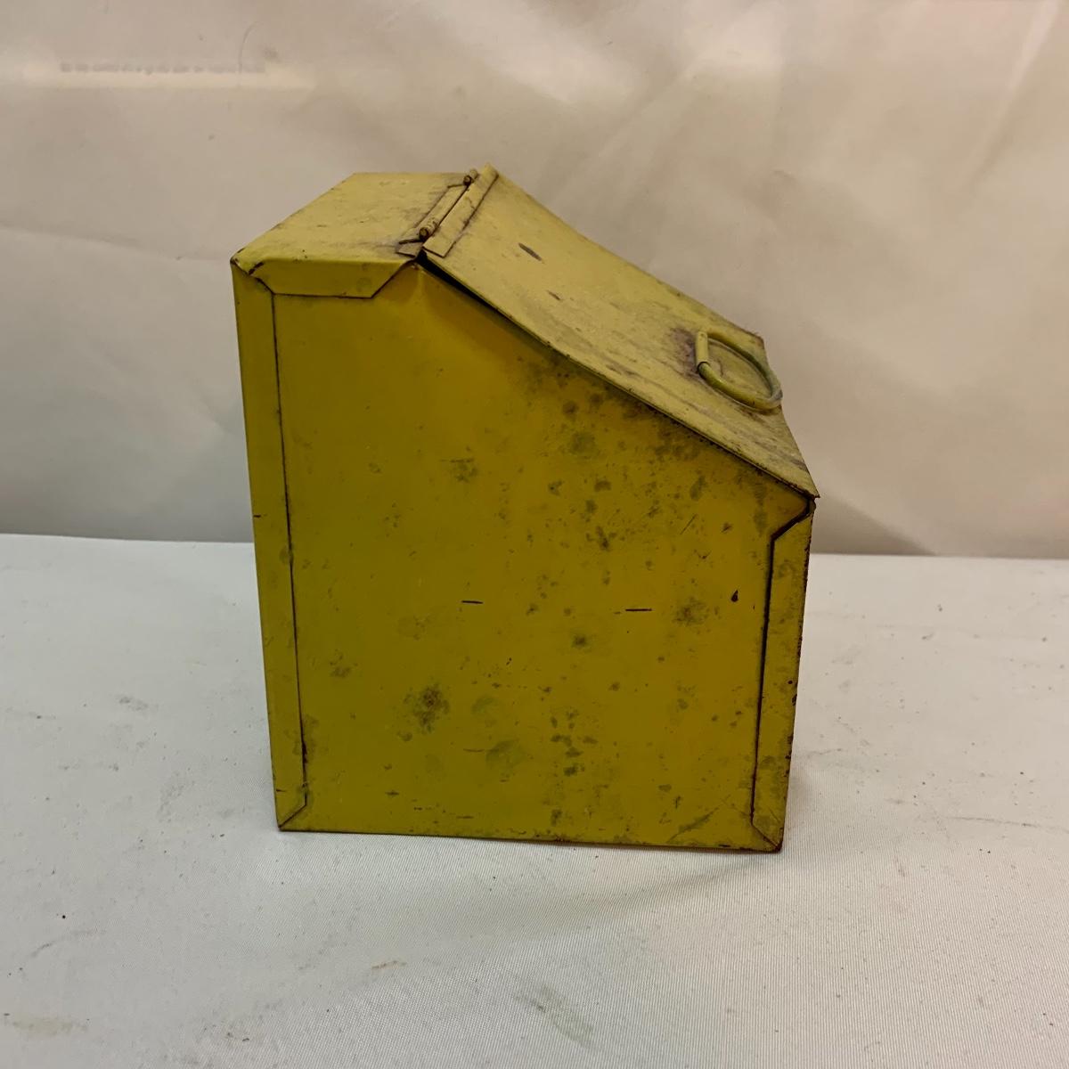 This lot is full of sunny yellow kitchen items to brighten up your kitchen. There is a unique ceramic pitcher from Portofino, Italy that is a little over 10” tall with a bright yellow glazed top and spout. The spout has a small chip and thre glaze is chipped off. The inside of the pitcher is glazed. The metal box has a tilted hinged lid & a handle. Also included is a 10” yellow ceramic cooking dish from Denmark, some yellow metal jars with wooden lids that nest; the third one is stuck inside the second one so that might take a bit of work to get it out. There’s also a yellow hook with a screw and a yellow funnel with a strap. And one non yellow item that is a unique Copco burner. Shipping available.