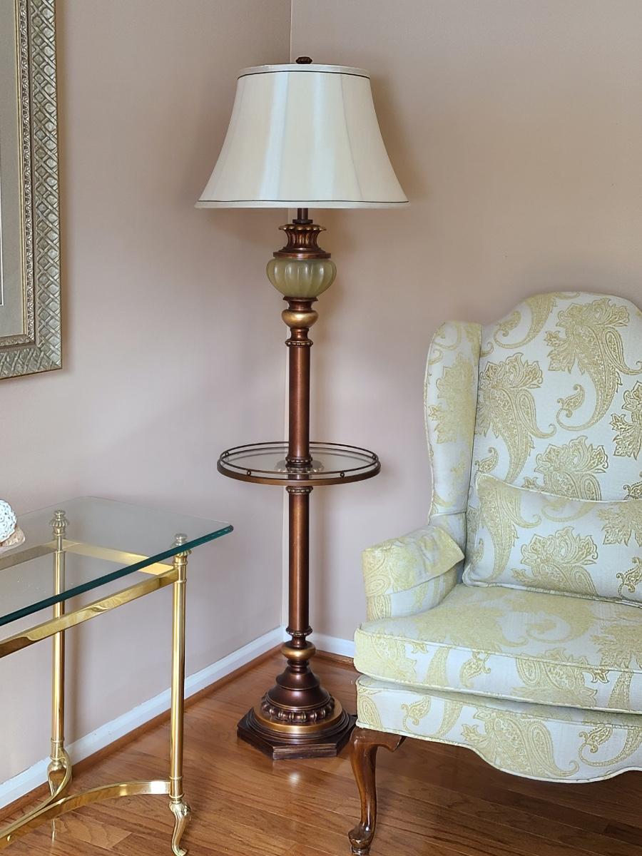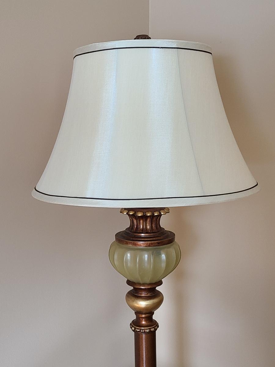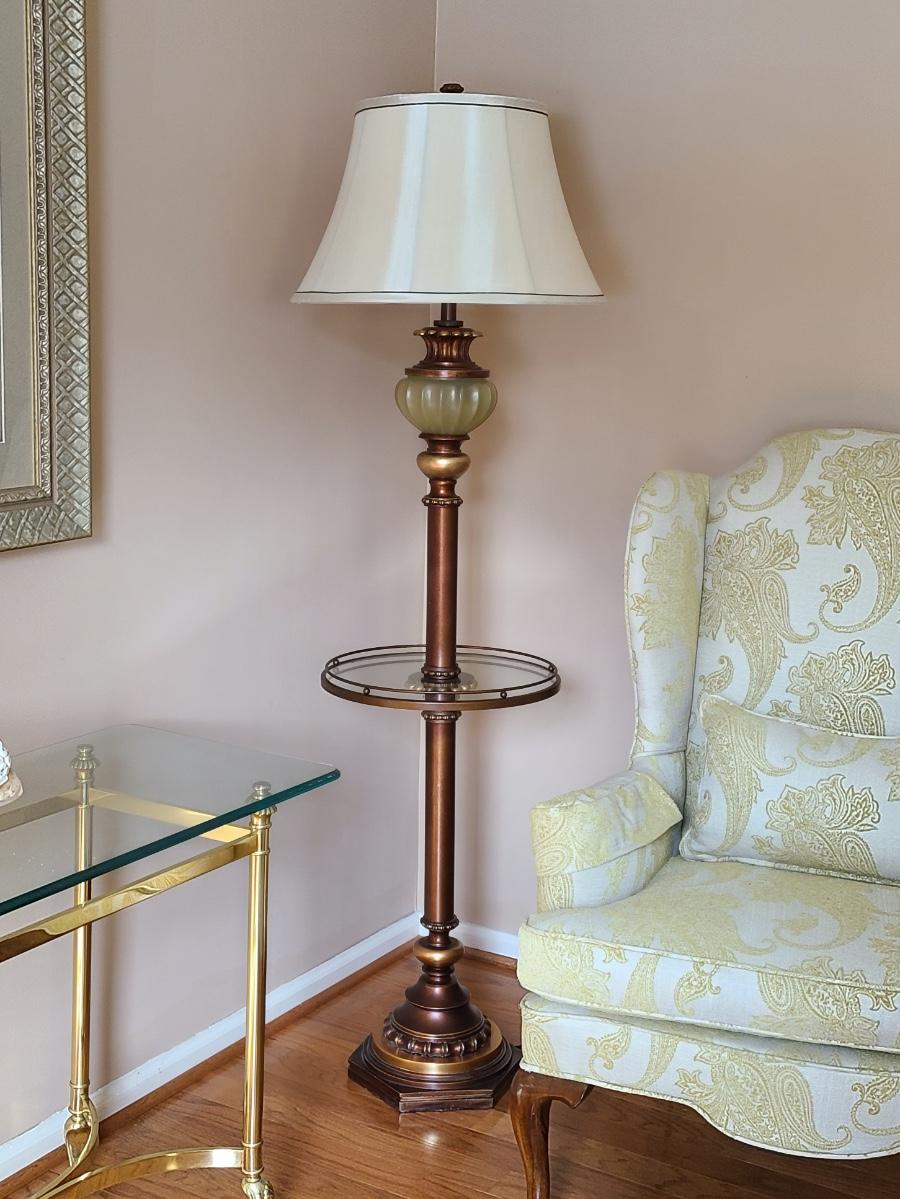This lot is for the floor lamp only. This is a lovely floor lamp that has a piece that looks like jade (faux), and bronze in color. This is perfect for any room of the home and works. Please see all pictures as they are the best representation of the items. The pictures show condition, measurements if taken, and what is included in the lot. Due to the large amount that we photograph and the time frame, we are not always able to take measurements. All items unless noted, are pre-owned and have been used. If you purchased furniture, you must bring help. We do not allow one person to carry large furniture out on their own. Bring help, tools and a truck for the safety of our client’s homes, and your personal safety. Any damages that result to the property including walls, and floors due to moving of the furniture will be charged to the buyer. Company policy. Thank you.