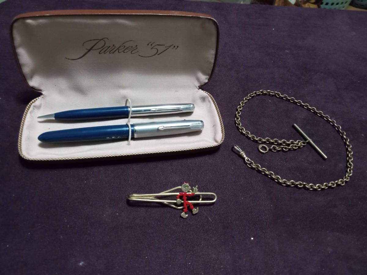 LOT 522  PARKER FOUNTAIN PEN SET, REDDY KILOWATT TIE BAR