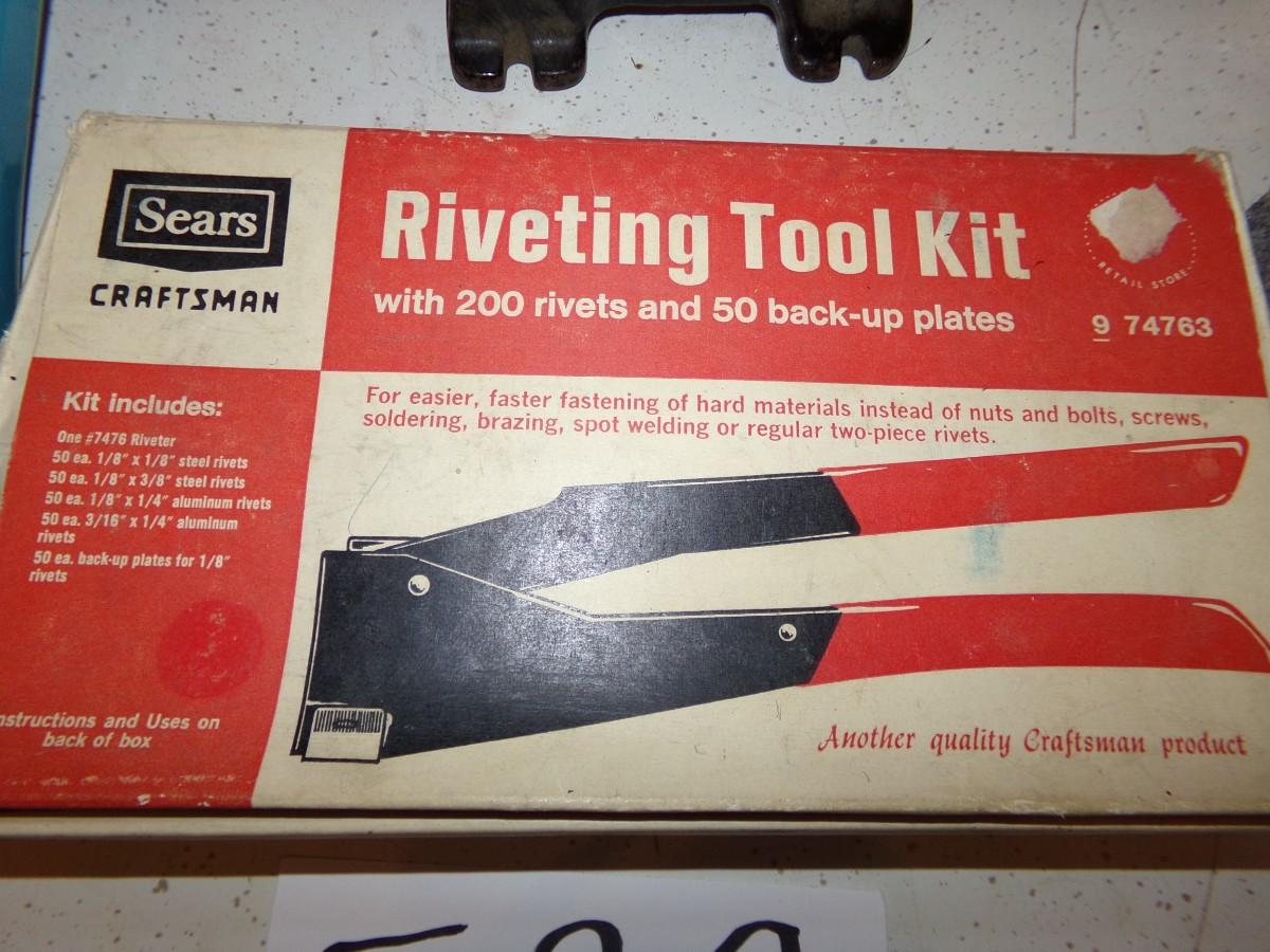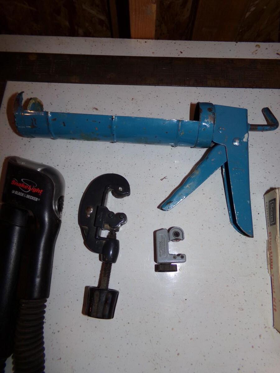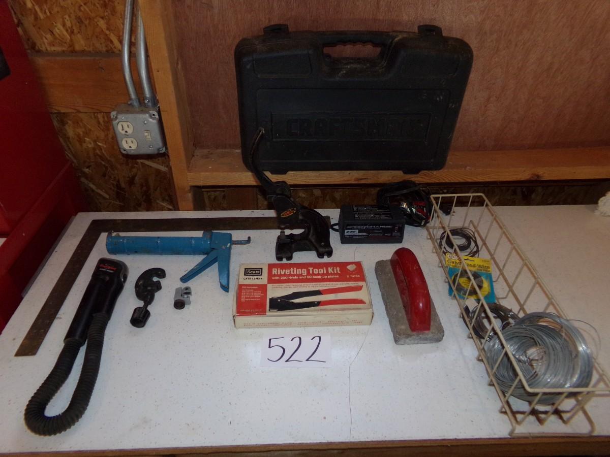CAULKING GUN, CRAFTSMAN RIVETING TOOL KIT, PIPE CUTTERS, GALVANIZED WIRE, SCHUMACHER SPEED CHARGER AND MORE.