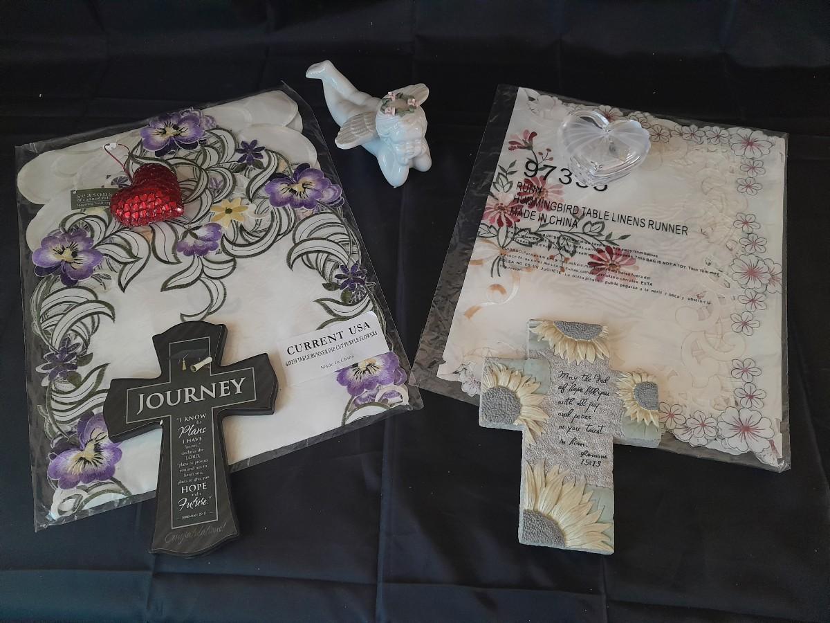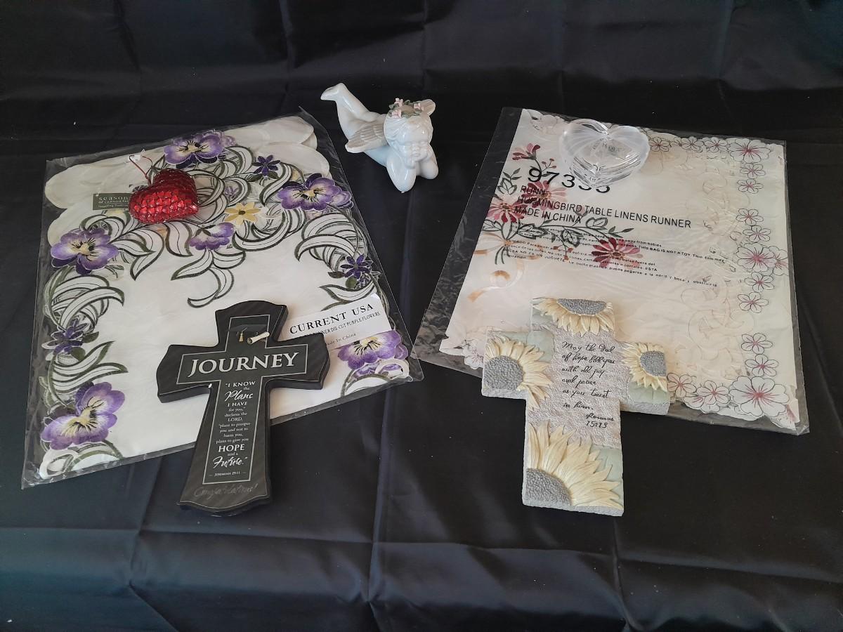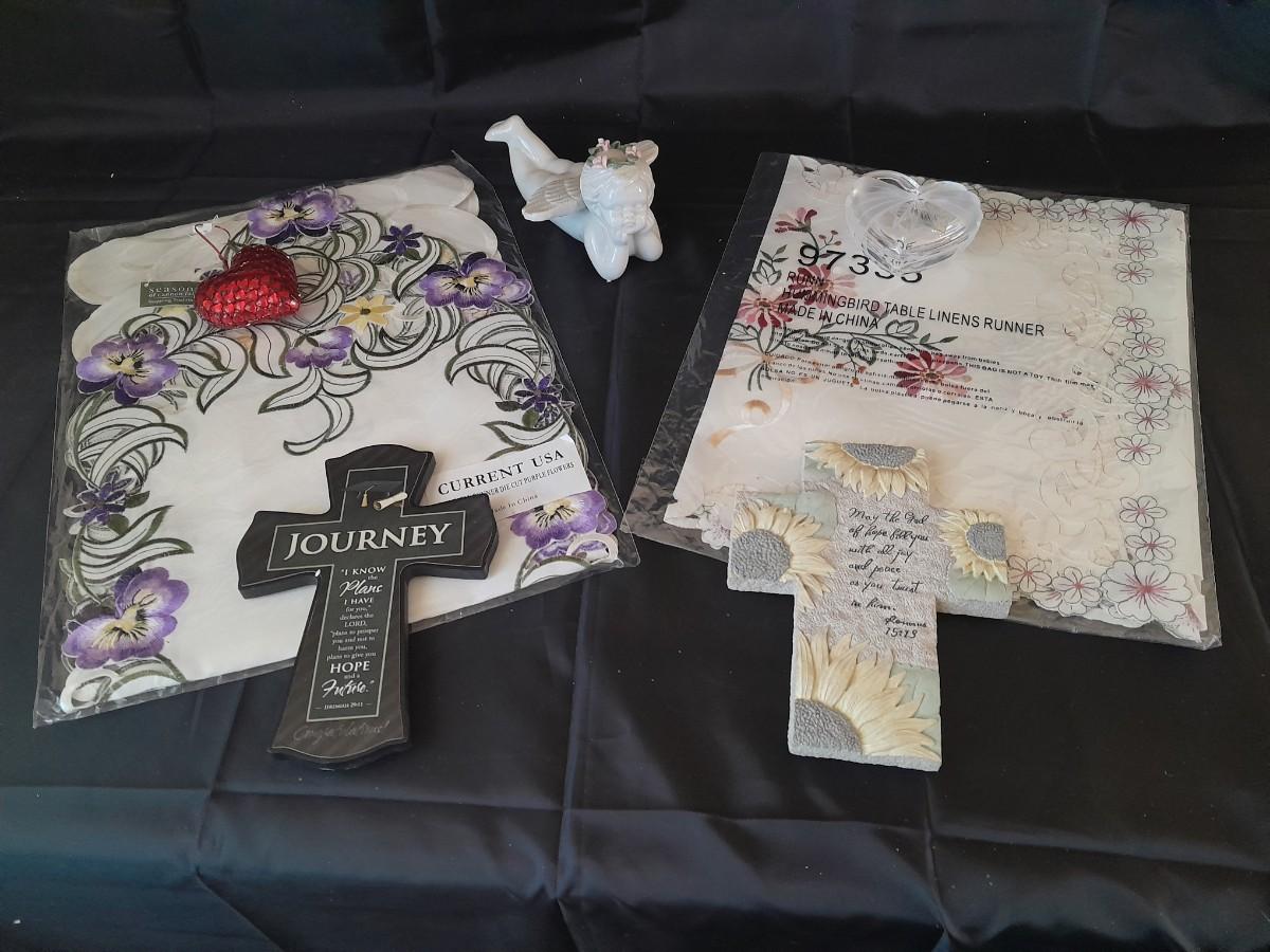 TWO CROSSES WITH SAYINGS, AN ANGEL, HEARTS, AND TWO TABLE RUNNERS