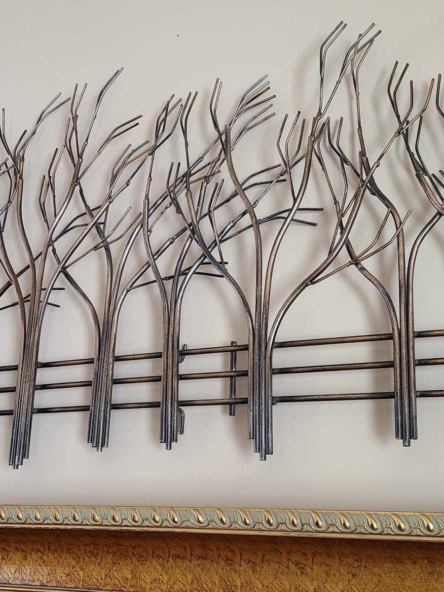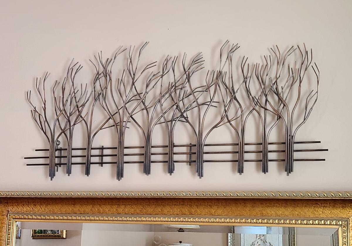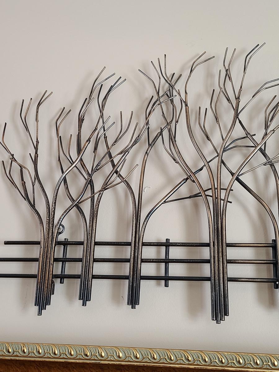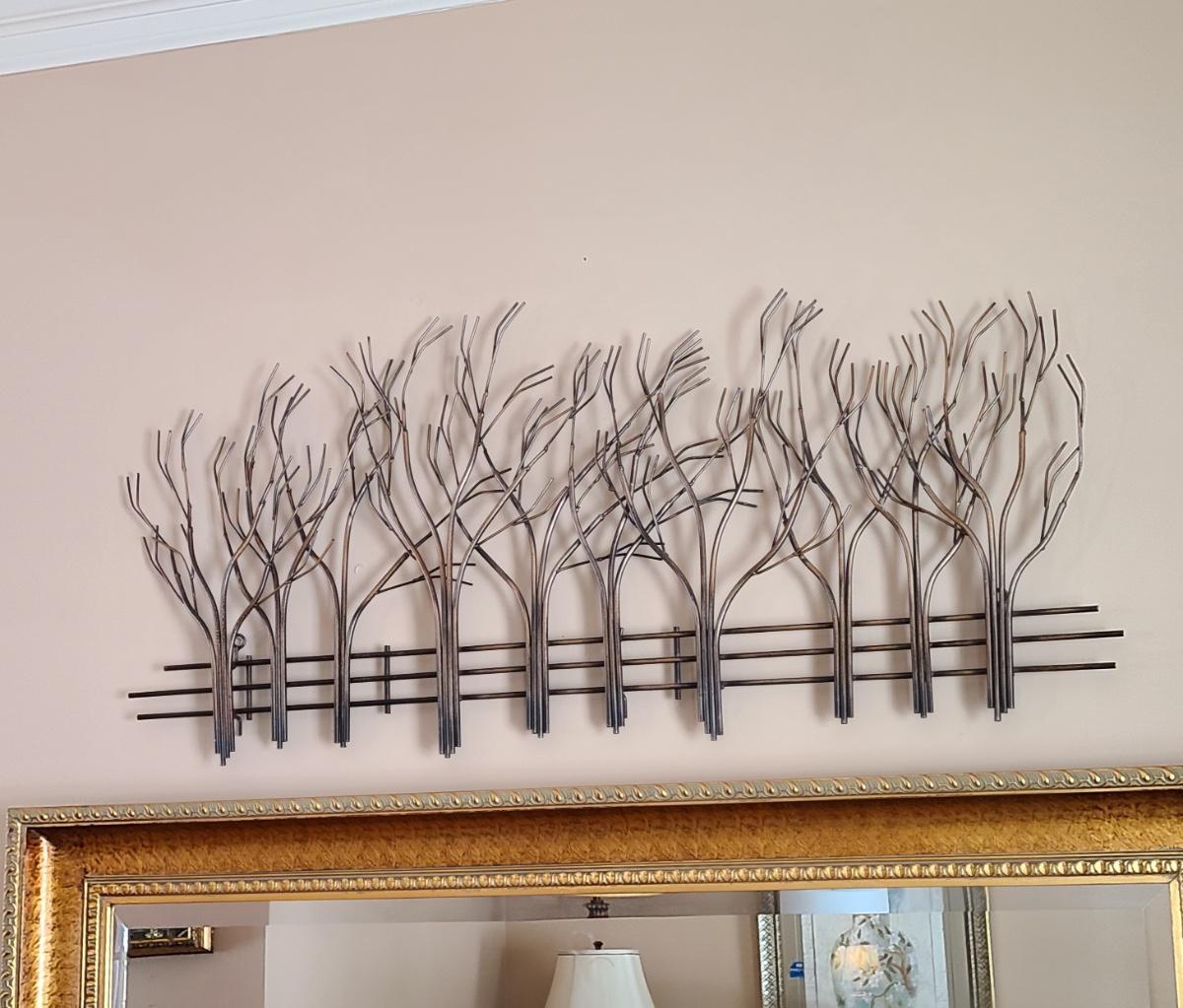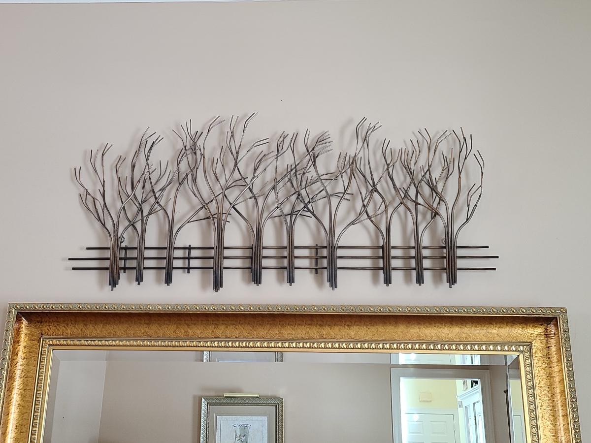 Lovely metal wall art of trees and a fence. Perfect for any room in the home. 39 inches long. Please see all pictures as they are the best representation of the items. The pictures show condition, measurements if taken, and what is included in the lot. Due to the large amount that we photograph and the time frame, we are not always able to take measurements. All items unless noted, are pre-owned and have been used. If you purchased furniture, you must bring help. We do not allow one person to carry large furniture out on their own. Bring help, tools and a truck for the safety of our client’s homes, and your personal safety. Any damages that result to the property including walls, and floors due to moving of the furniture will be charged to the buyer. Company policy. Thank you.