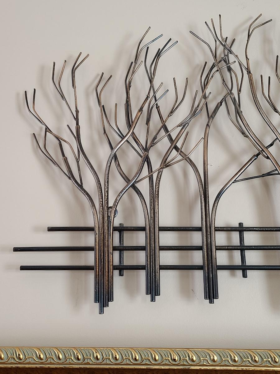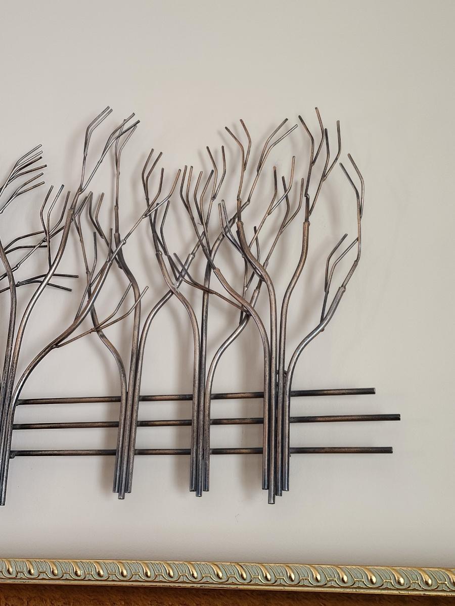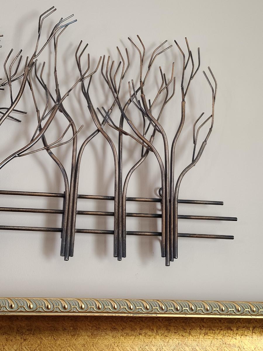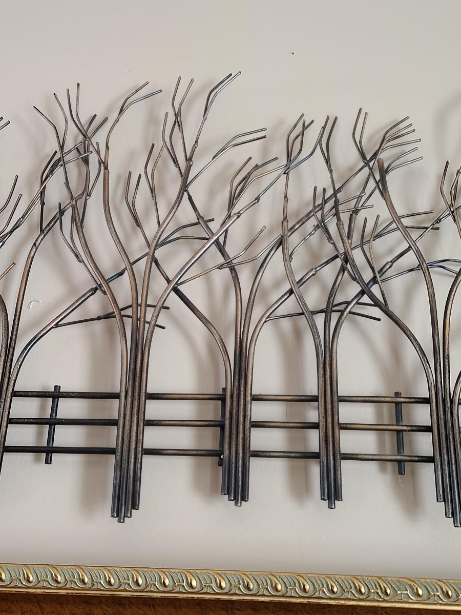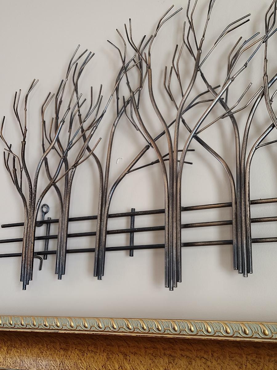 Lovely metal wall art of trees and a fence. Perfect for any room in the home. 39 inches long. Please see all pictures as they are the best representation of the items. The pictures show condition, measurements if taken, and what is included in the lot. Due to the large amount that we photograph and the time frame, we are not always able to take measurements. All items unless noted, are pre-owned and have been used. If you purchased furniture, you must bring help. We do not allow one person to carry large furniture out on their own. Bring help, tools and a truck for the safety of our client’s homes, and your personal safety. Any damages that result to the property including walls, and floors due to moving of the furniture will be charged to the buyer. Company policy. Thank you.
