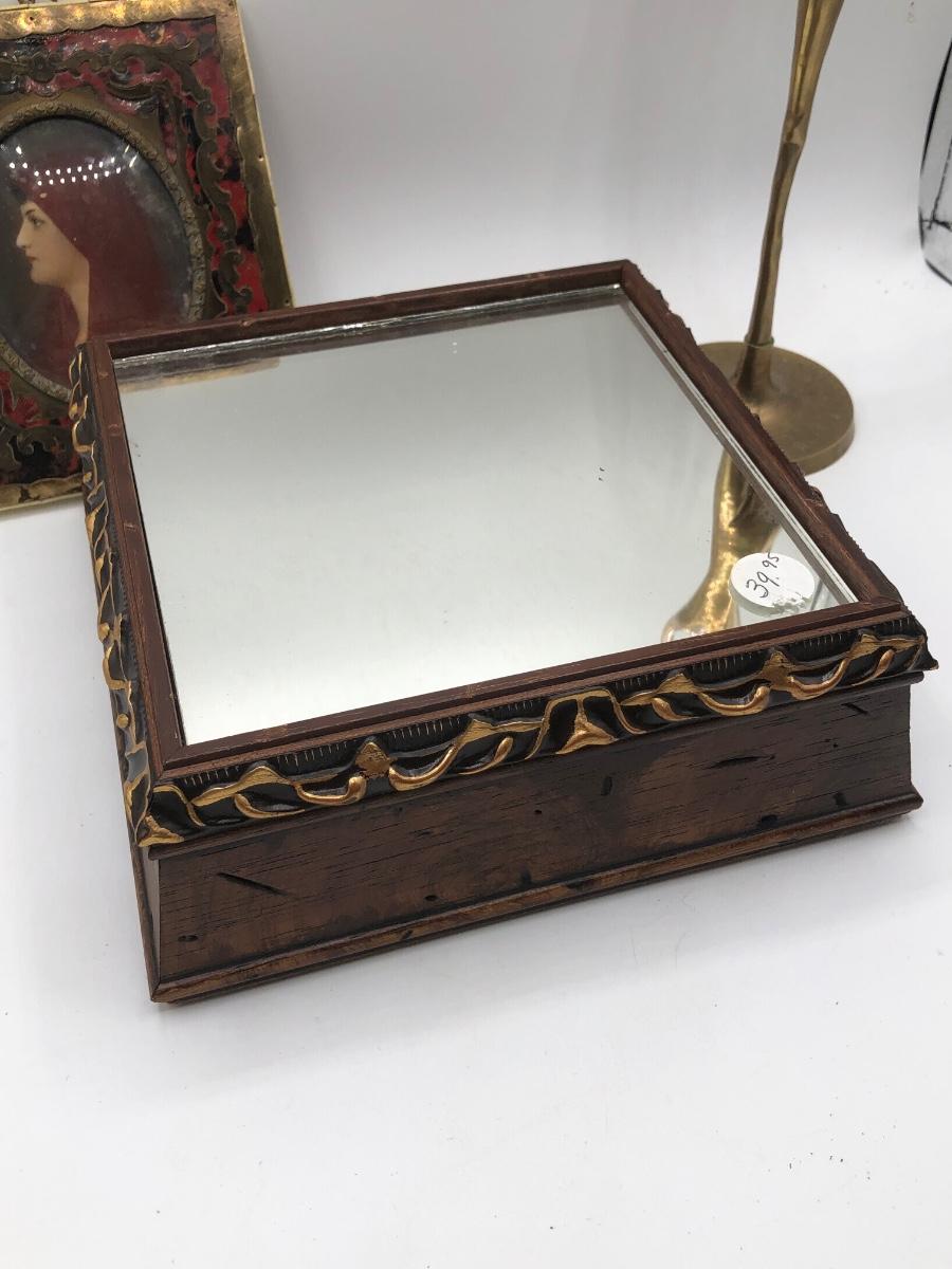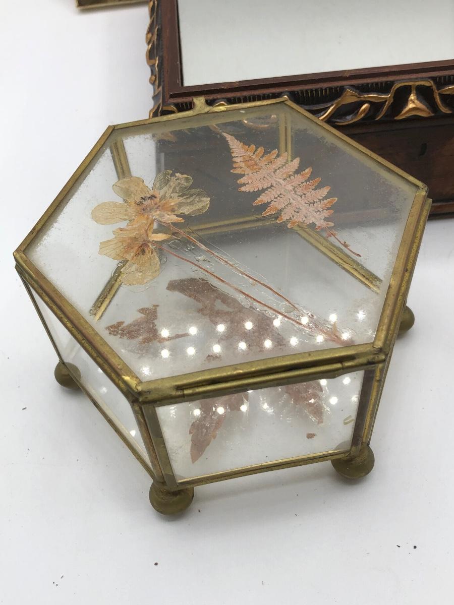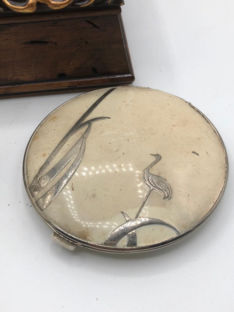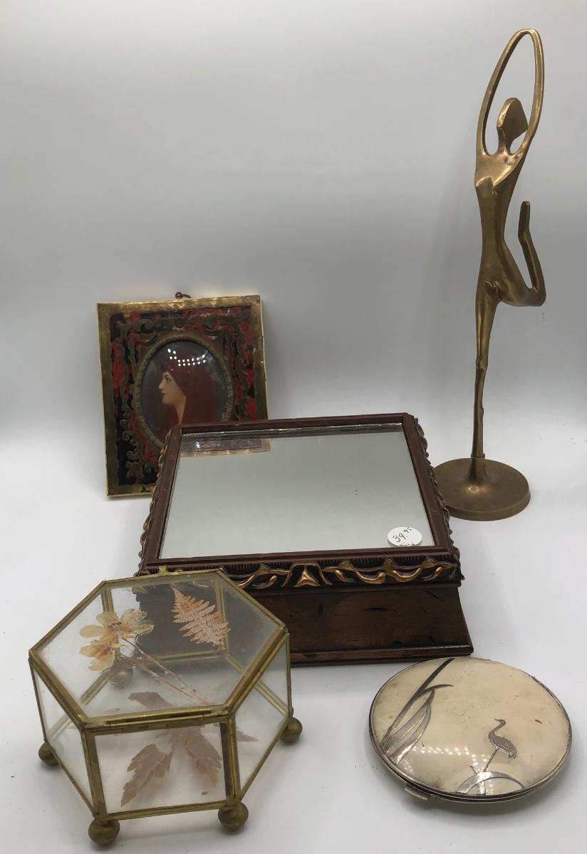 LOT 523K: Antique French Framed Enamel on Copper Miniature Portrait, Vintage Vanstyle Heron Compact, Pressed Flowers Glass Trinket Dish, Brass Abstract Ballerina Statue & Mirrored Wooden Box