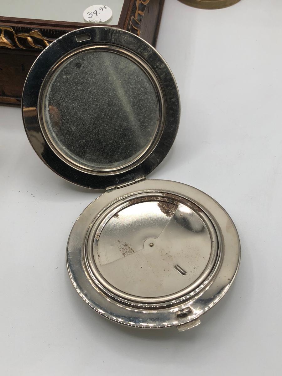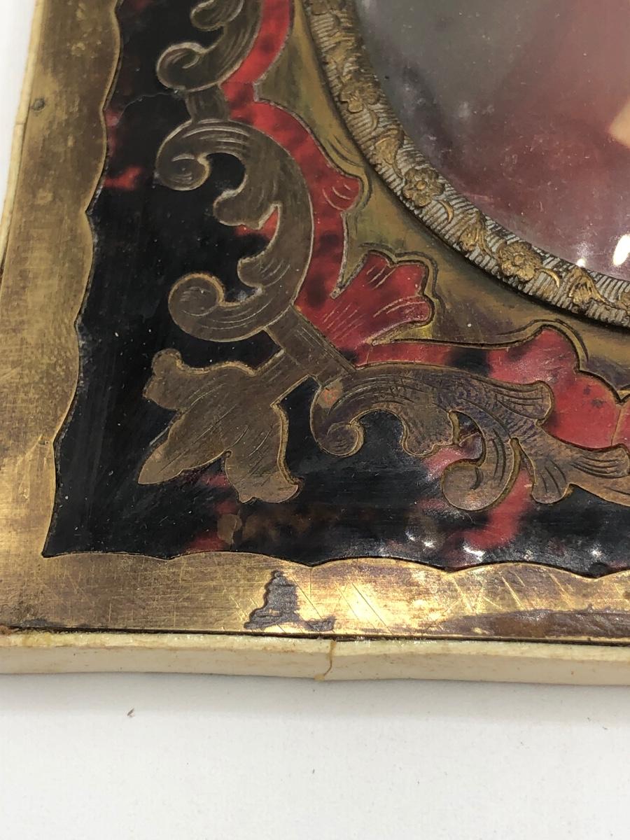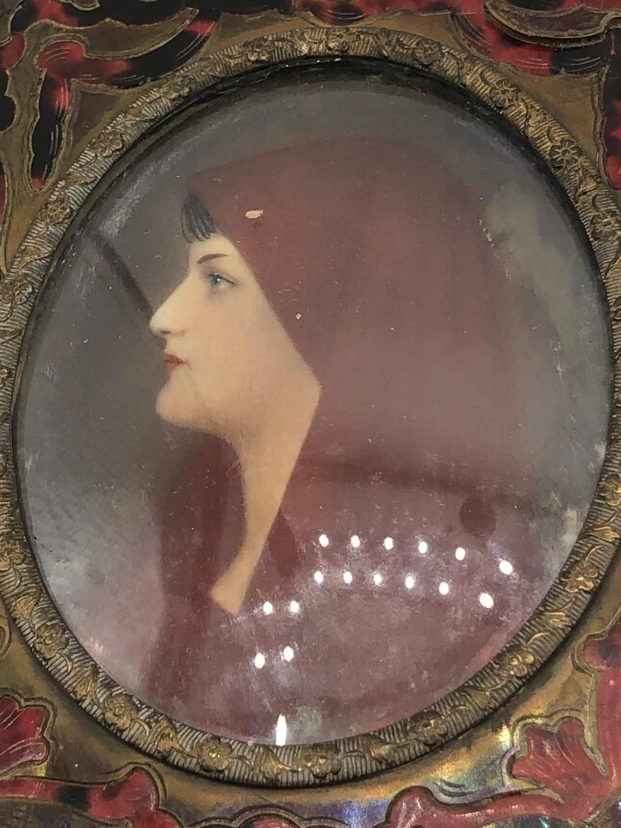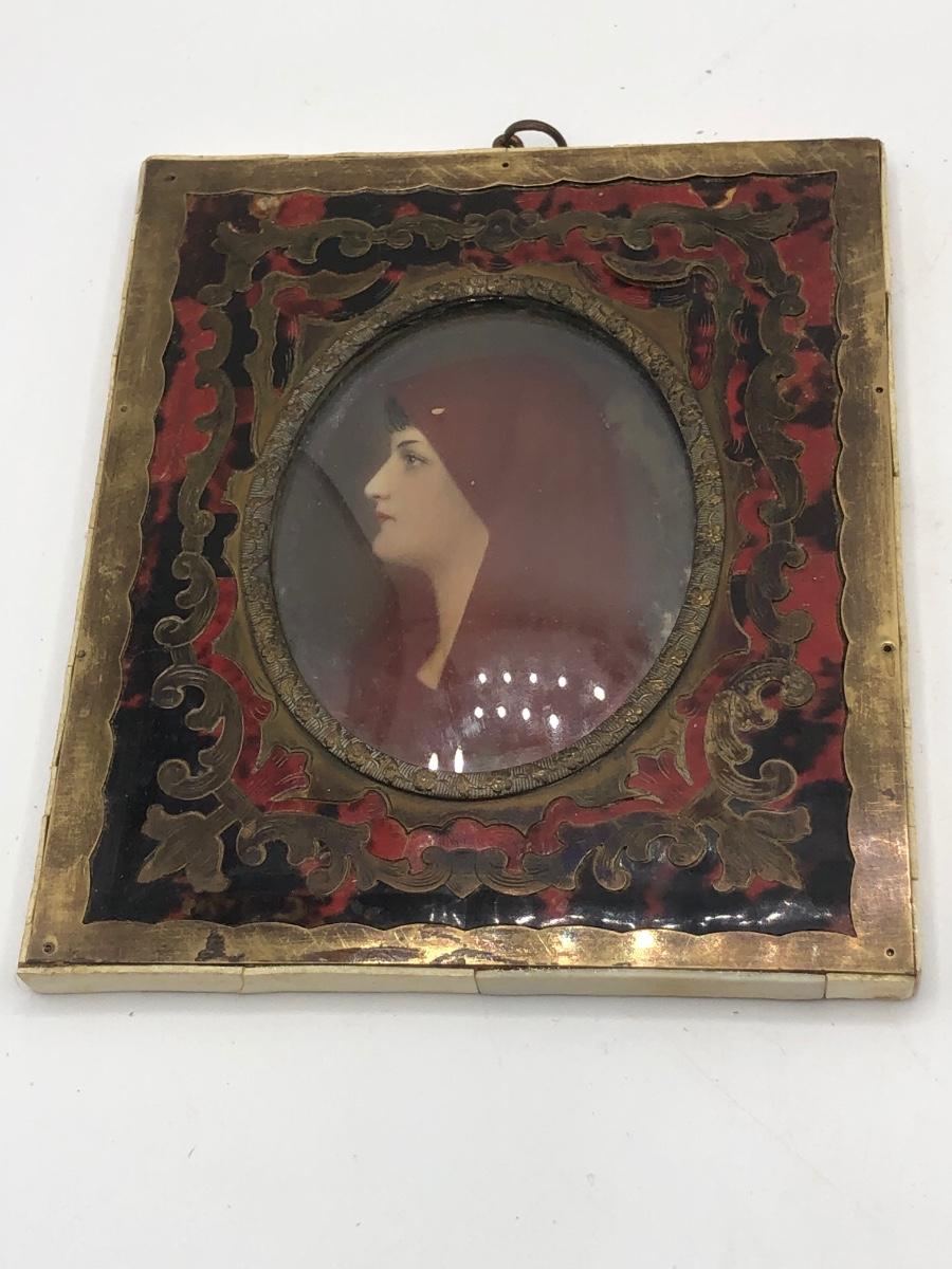 LOT 523K: Antique French Framed Enamel on Copper Miniature Portrait, Vintage Vanstyle Heron Compact, Pressed Flowers Glass Trinket Dish, Brass Abstract Ballerina Statue & Mirrored Wooden Box