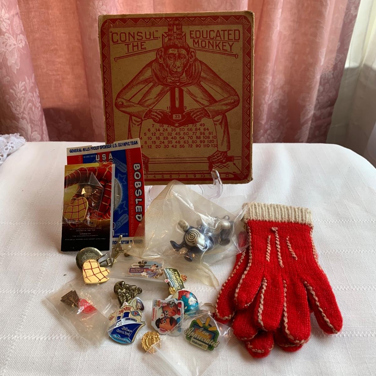 Lot 524: Antique Consul the Educated Monkey Tin Calculator, Pokémon Poli Wrath Figures (NIP), Assorted Pins & More