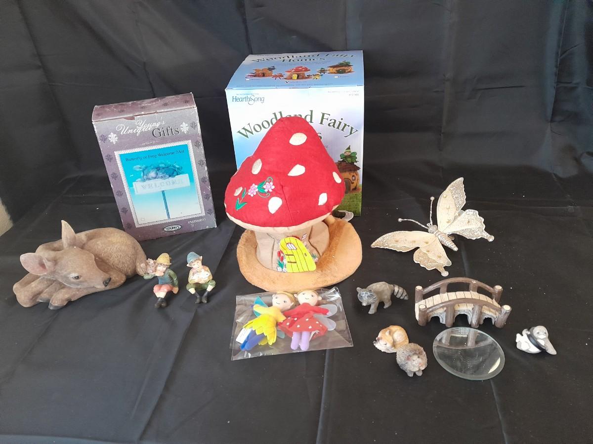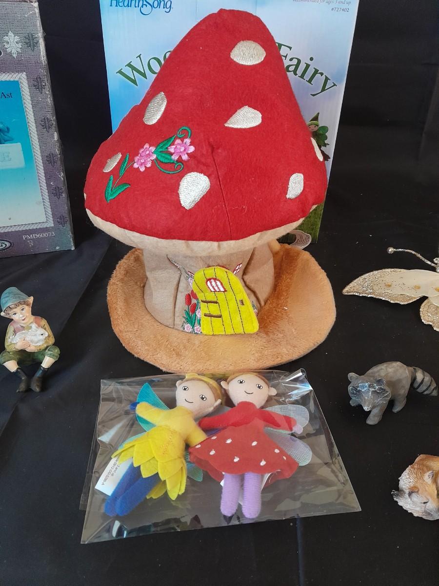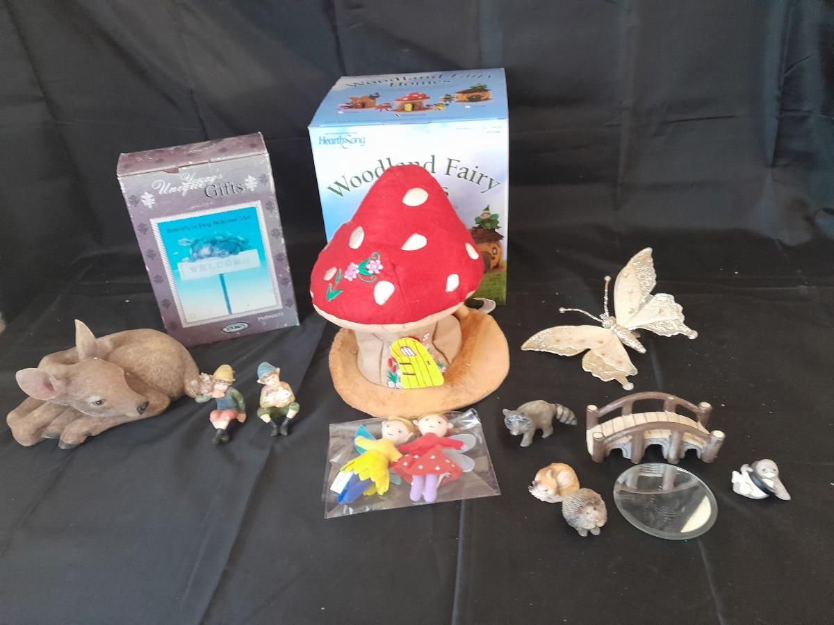 WOODLAND PLUSH FAIRY HOUSE, GARDEN STAKE, BUTTERFLY, AND A COLLECTION OF SMALL ANIMAL FIGURES