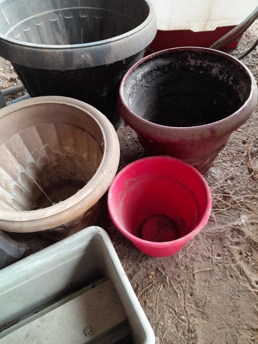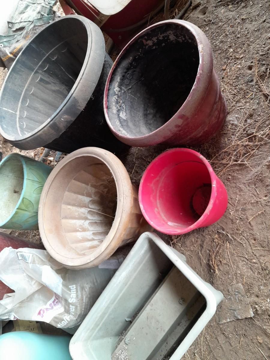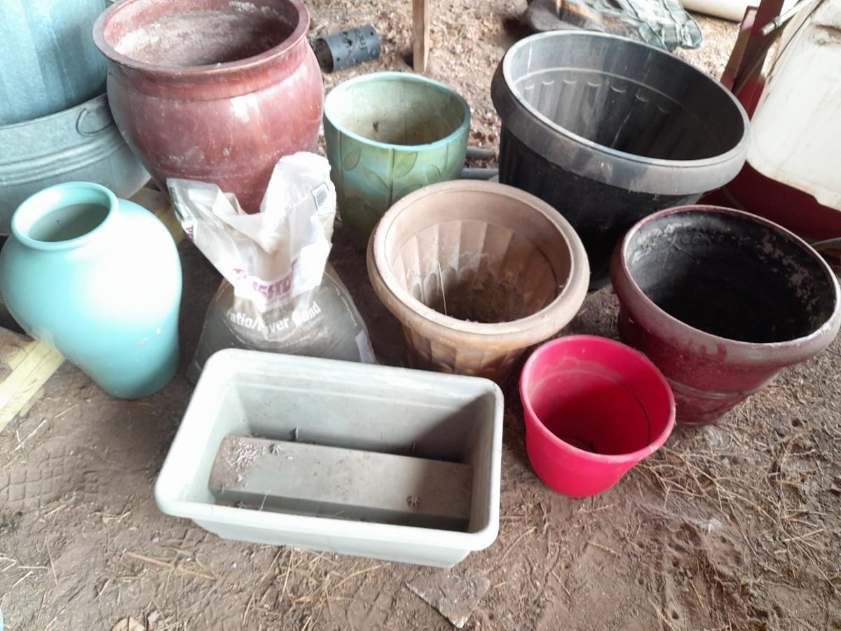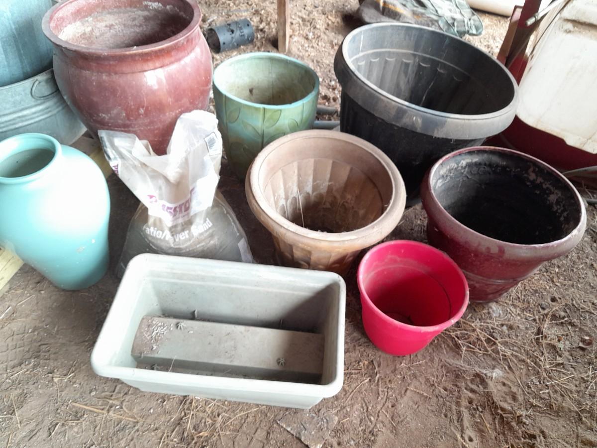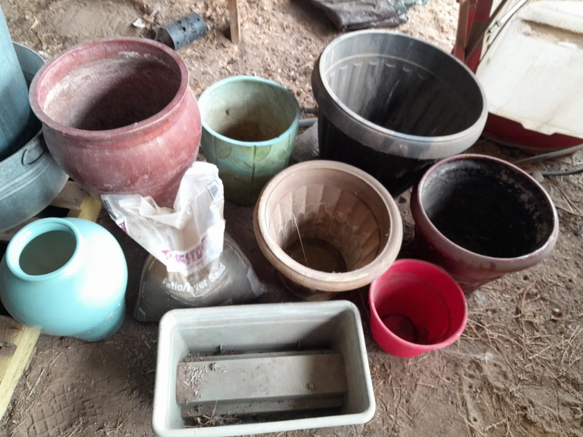 LARGE VARIETY OF FLOWER POTS, AND A VASE