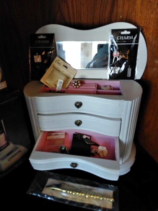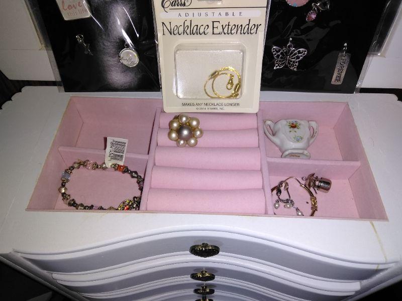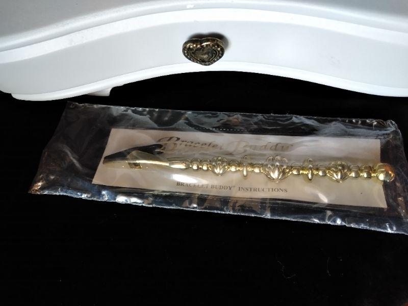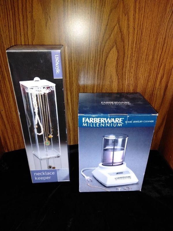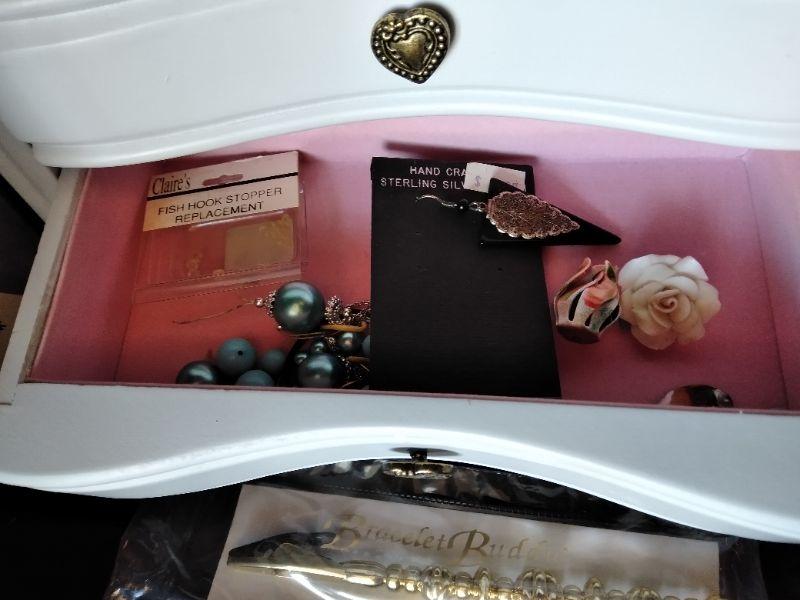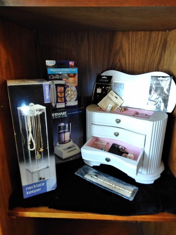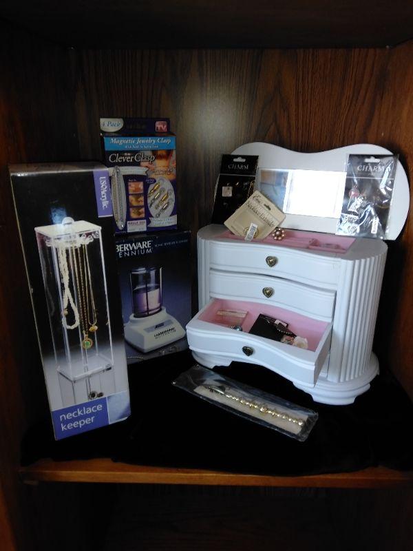 WHITE DRAWERED JEWELRY BOX, WITH MISC. BROKEN, MISSING, JEWELRY AND SOME NEW CLASPS, BRACELET BUDDY, AND MORE, FABERWARE MILLENNIUM SONINC JEWELRY CLEANING MACHINE, AND A CLEAR NECKLACE STAND.