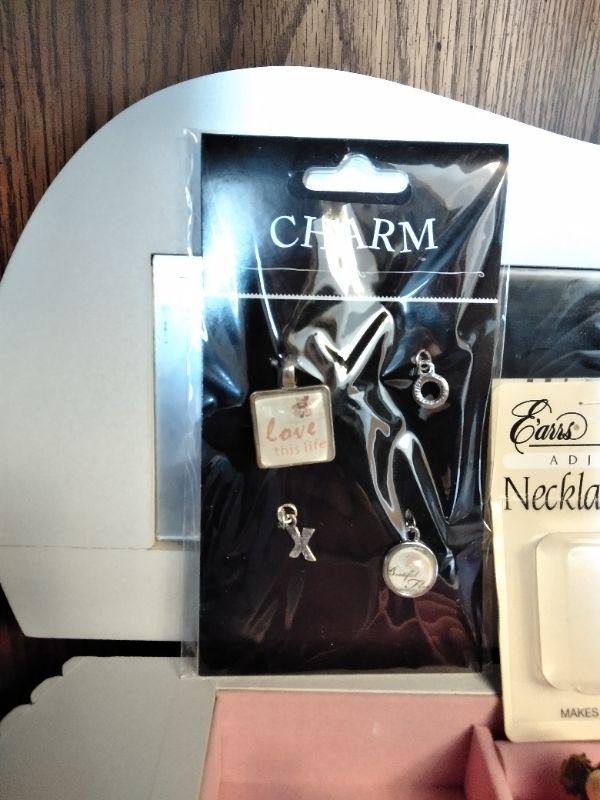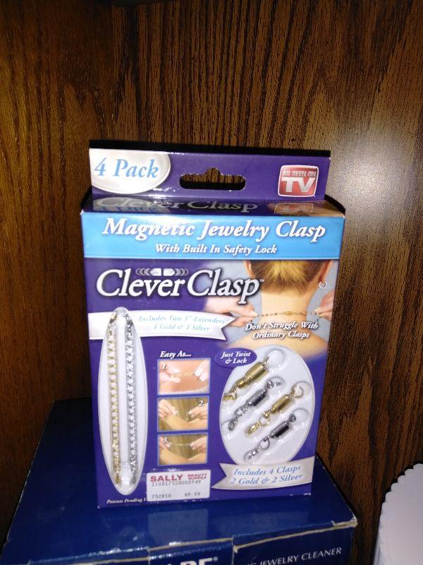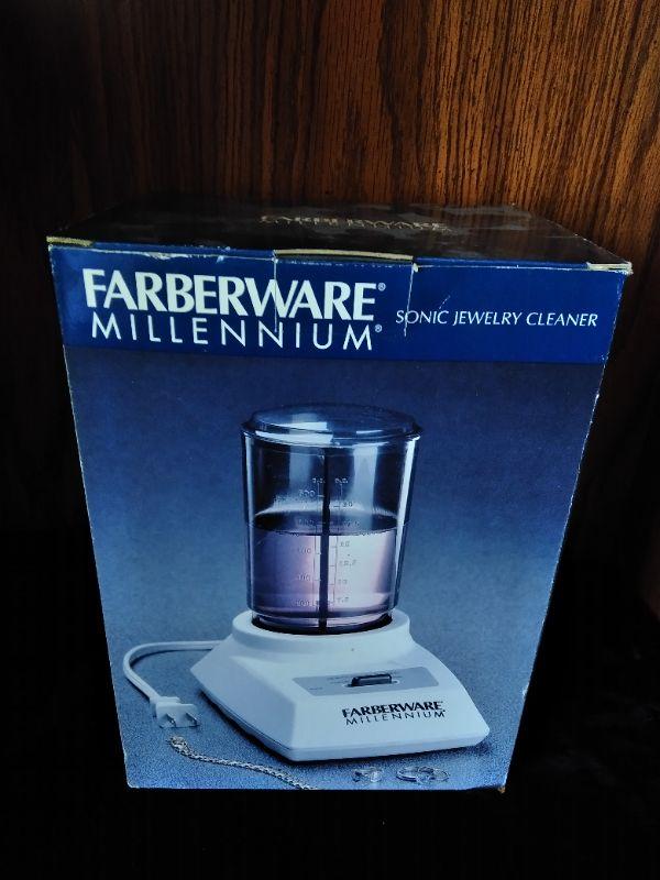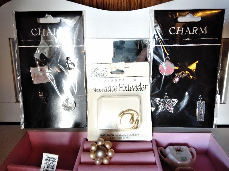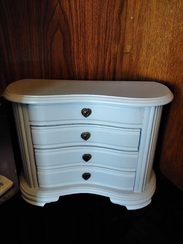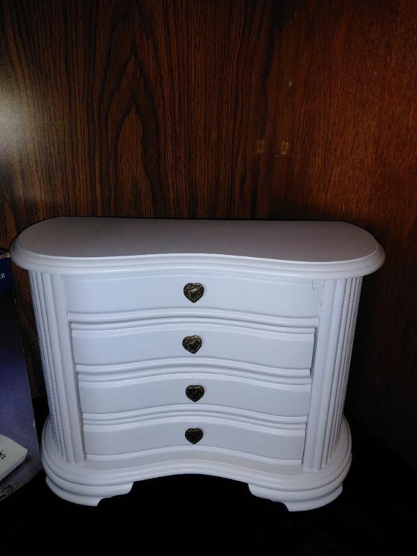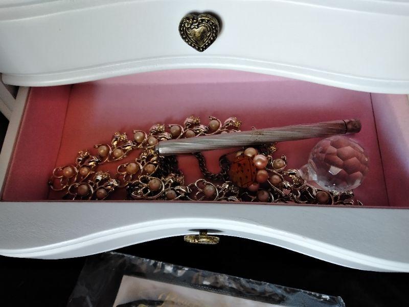 WHITE DRAWERED JEWELRY BOX, WITH MISC. BROKEN, MISSING, JEWELRY AND SOME NEW CLASPS, BRACELET BUDDY, AND MORE, FABERWARE MILLENNIUM SONINC JEWELRY CLEANING MACHINE, AND A CLEAR NECKLACE STAND.