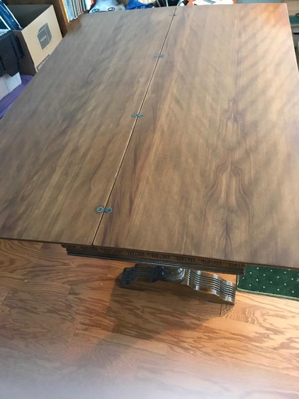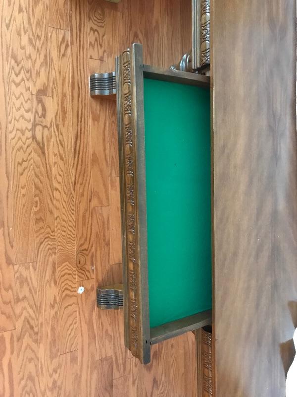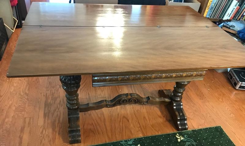 Flip Top Table with felt lined drawer measuring 29” tall 54” long 40” wide when opened and 20” wide when closed. Excellent condition
